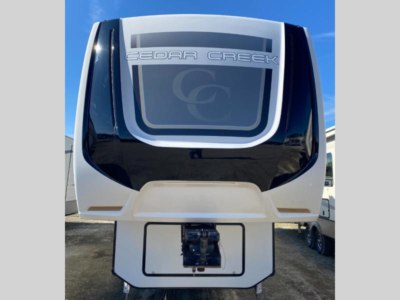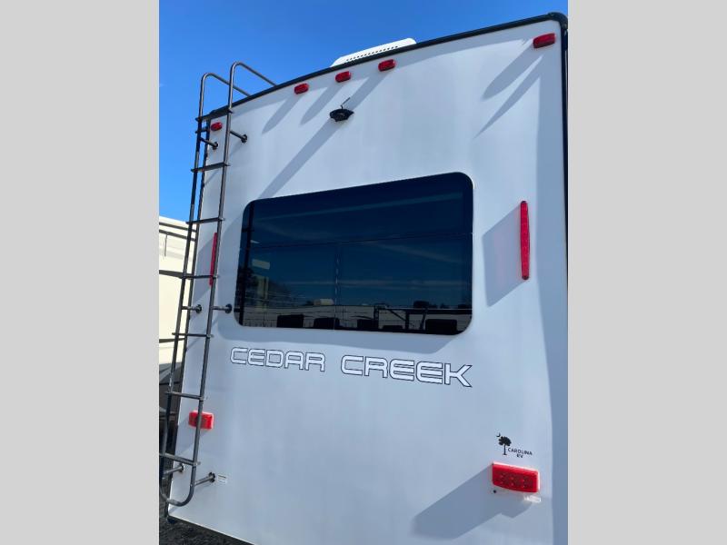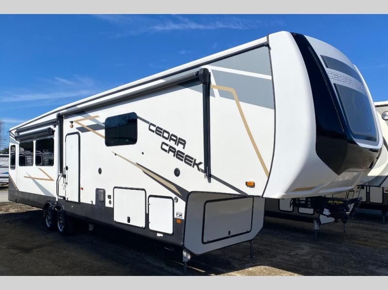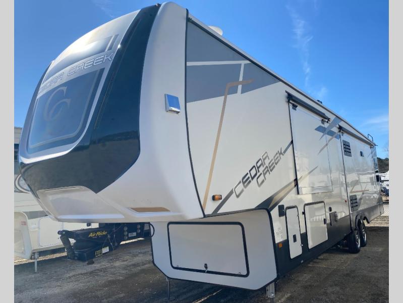 See where the road leads with any one of these Forest River Cedar Creek fifth wheels! They are constructed with the famous Cedar Creek all-aluminum superstructure on 16" centers, a "True" gelcoat exterior, and Silaprene® bonded sidewalls that are resilient, grow stronger with age, and also have an outstanding resistance to UV, heat, cold, moisture, oil/gas, and highway chemicals. The Dexter Performance and Safety Package will give you a peace of mind while driving down the road. You can also bring your furry friend with the animal leash latch, and enjoy your privacy with the Hehr frameless, tinted automotive-style windows. A few other convenient features you are sure to love are the Intervac central vacuum system with a front storage compartment port and interior automatic dustpan, the Congoleum® flooring (carpet mandatory in dining slide), and the USB plug-ins on each side of the king bed. Come choose the model that best suits you today!