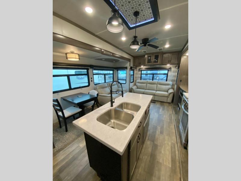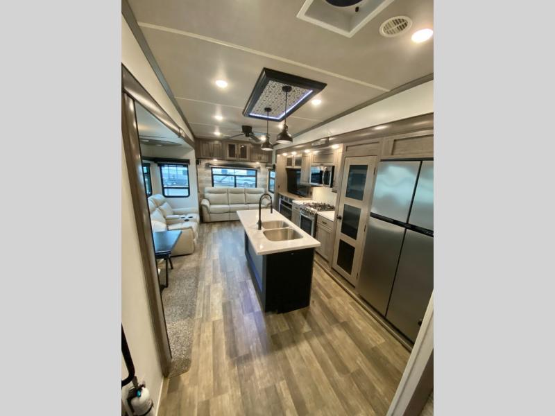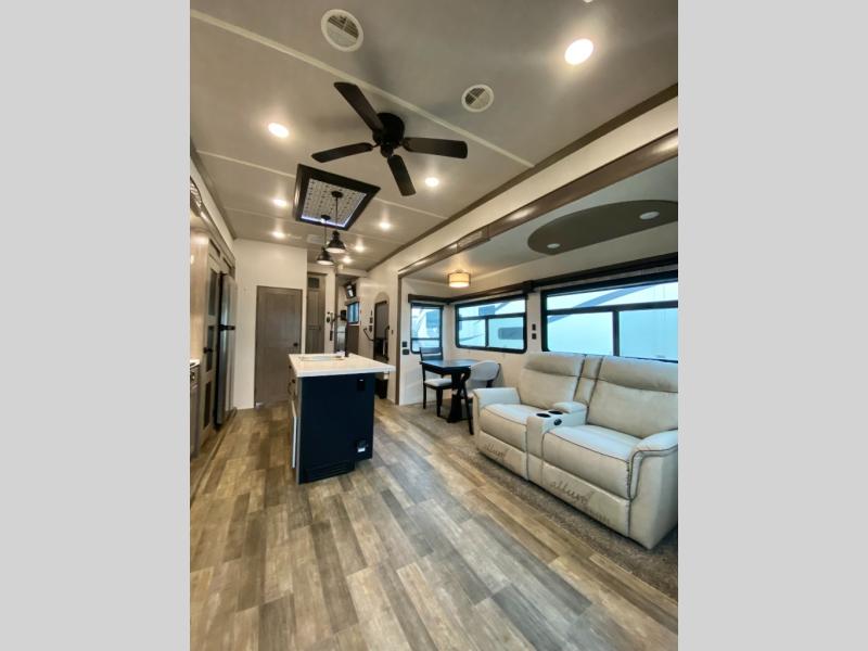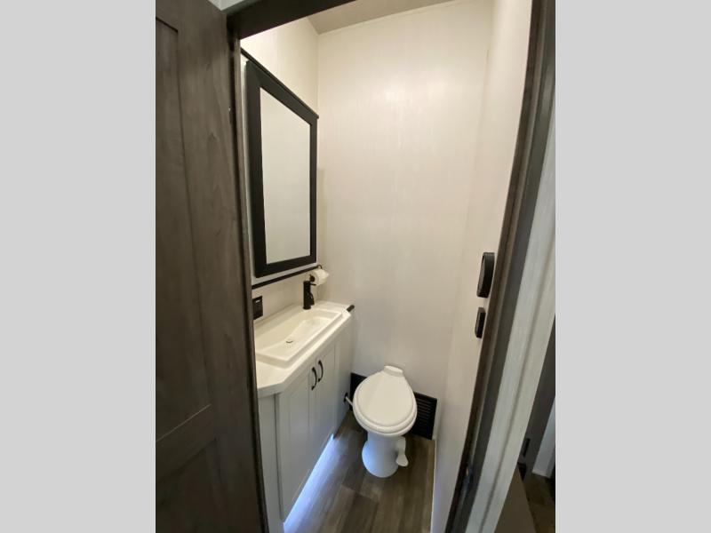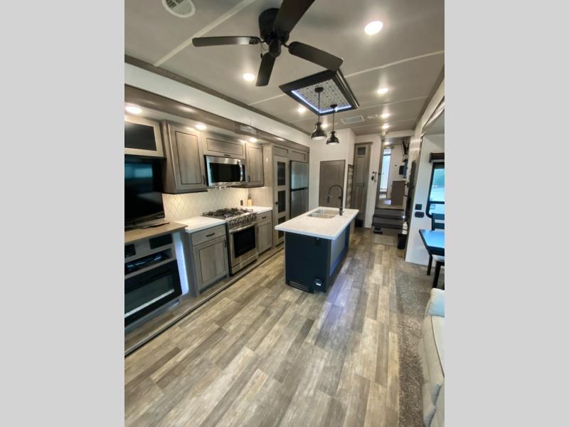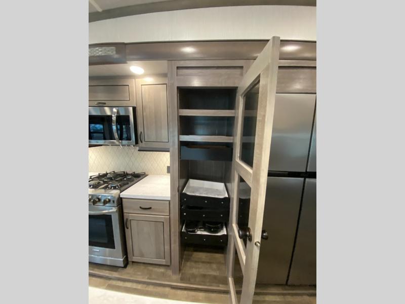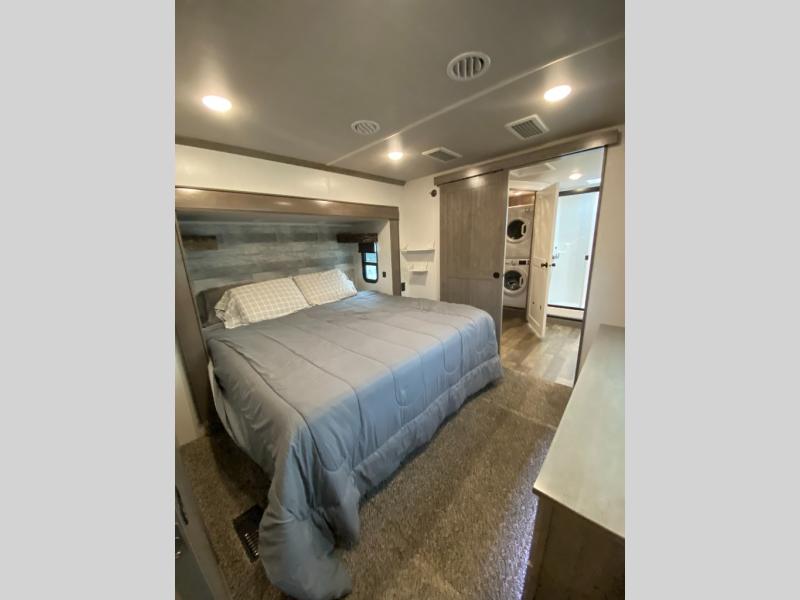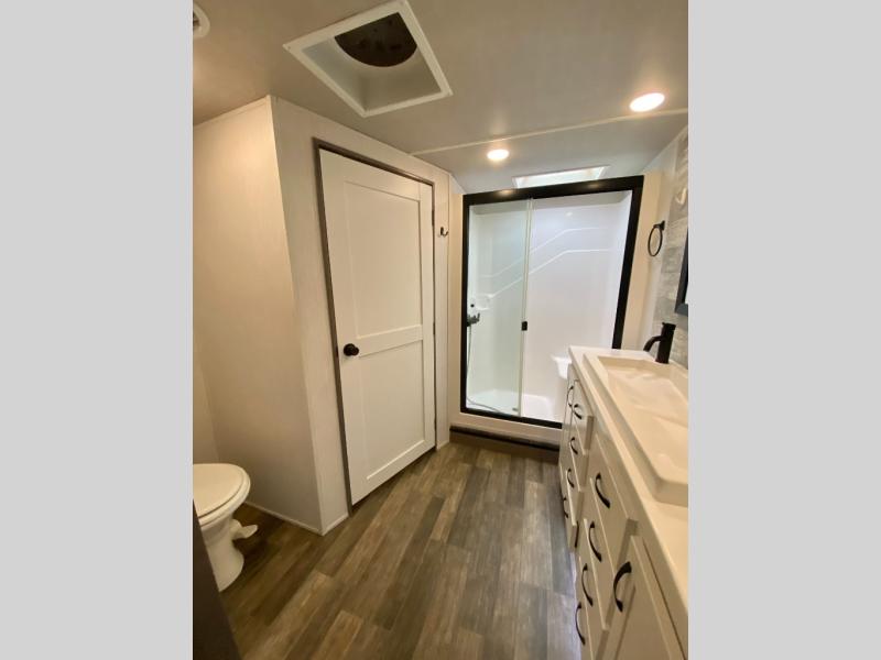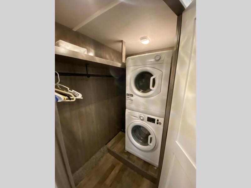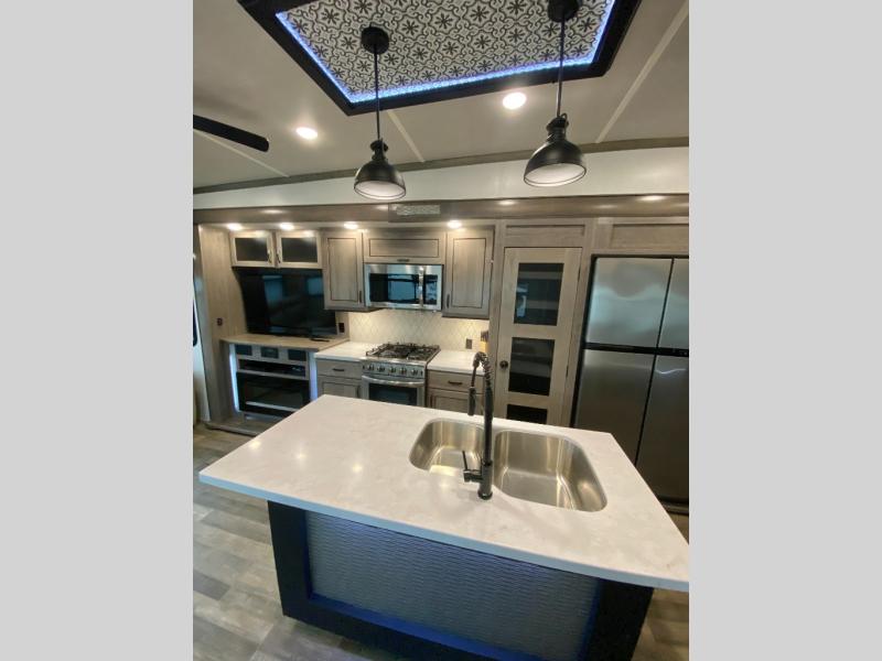You won't feel like you're camping in this Cedar Creek fifth wheel! The full front bathroom has a shower with a seat, a linen closet, a large sink with two faucets, and a large wardrobe that is even prepped to add the optional washer and dryer. You will find a king bed across from a dresser with a 32" TV in the private bedroom. When you enter this unit, you'll be welcomed by a bench seat with a monitor panel for your convenience, and the large kitchen pantry is big enough to store everyone's favorite snacks. The kitchen island will make your meal prepping easy, and dishwasher to make clean up even easier. You can unwind each night in true relaxation on either the rear hide-a-bed sofa or the power theater seating across from the entertainment center with a fireplace and a 50" TV above it!