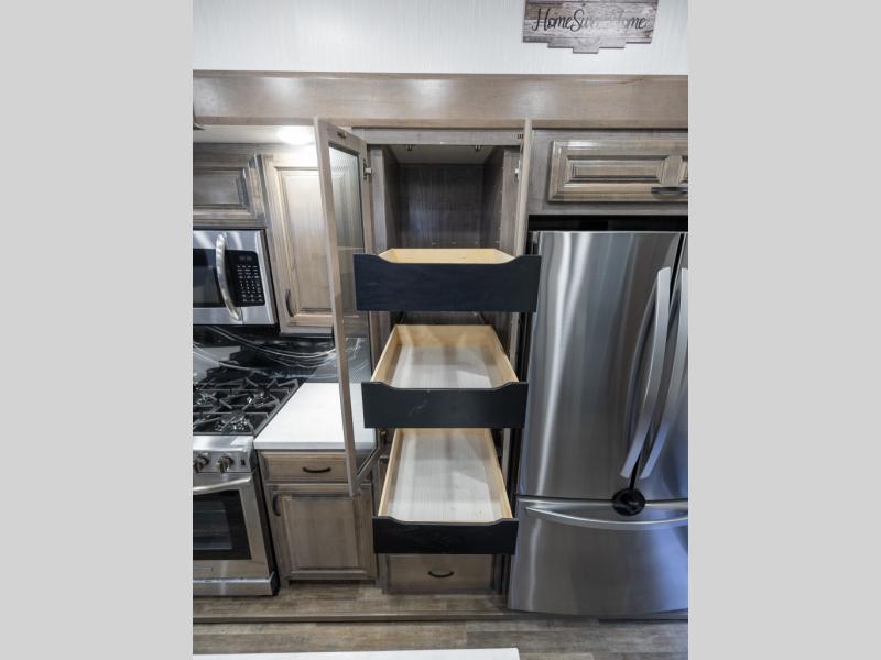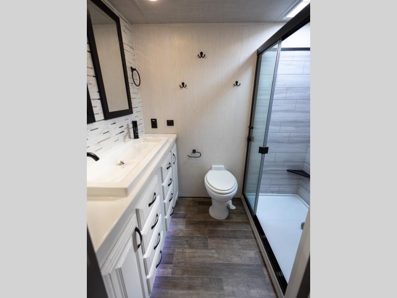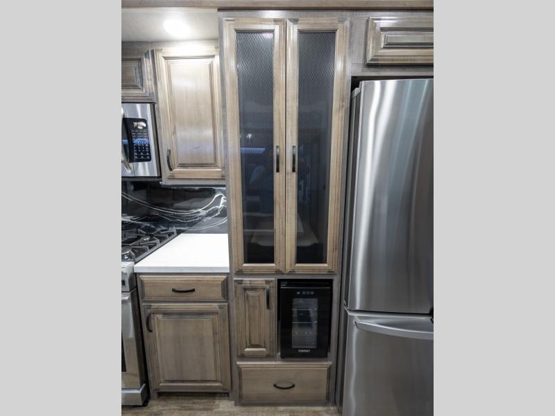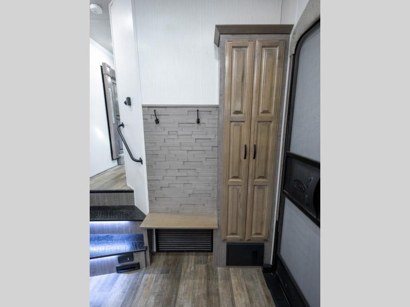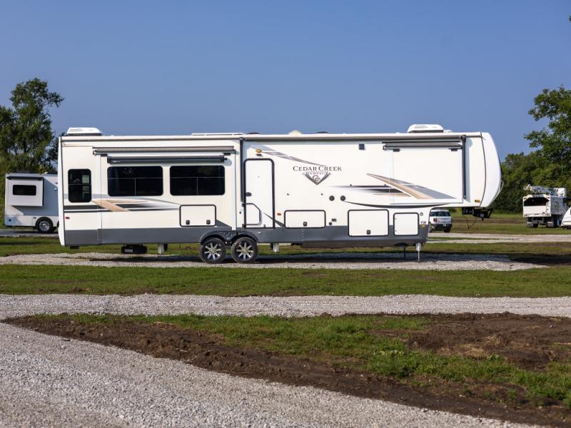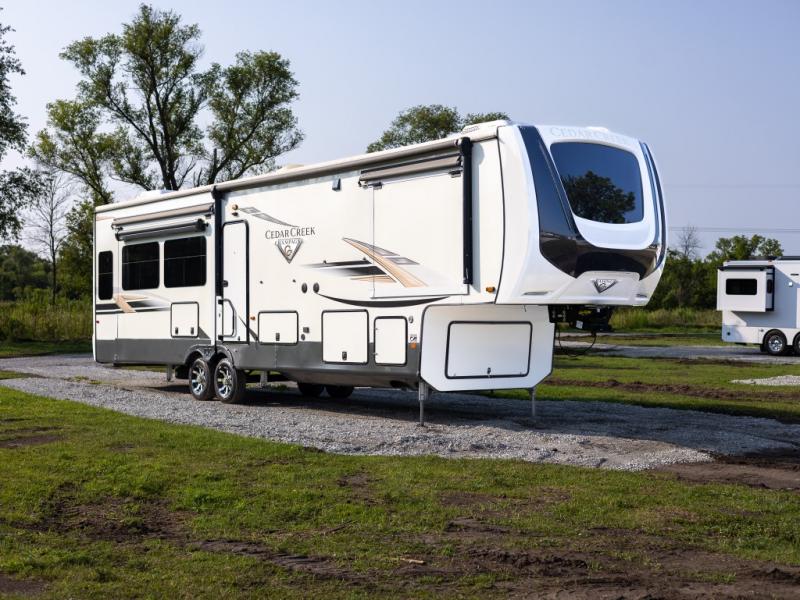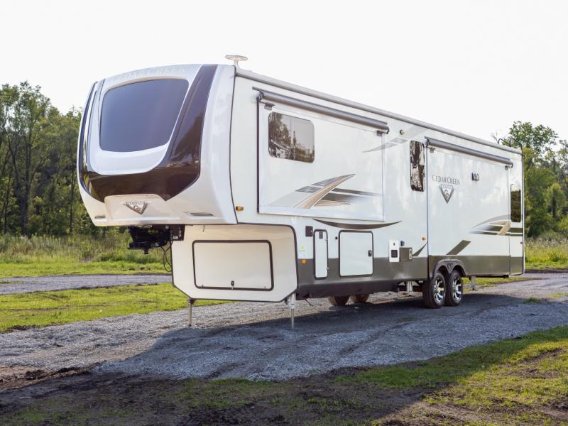 With any Cedar Creek Champagne Edition fifth wheel by Forest River you can extend your stay during any climate and where ever you decide to set up! Each is built with an all aluminum super structure, 100% aluminum framed windows and baggage doors, large surface 12V heating pads on all tanks, the Dexter Safety and Performance package, plus the Standard Level-Up 6-point hydraulic leveling system. The fifth wheels are powered by Firefly Integrations with advanced electrical automation, and includes the King WiFi router/range extender, the Truma AquaGo instant water heater for constant, endless supply of hot water, and a heated front storage compartment. Inside you will find luxury and convenience throughout with features like Ashley Grey high sheen maple cabinet doors and drawers with hidden hinges, the Champagne LED lighting package, Intra-Vac central vacuum system with front storage port, two Whisper Quiet, ducted air conditioners with dual zone control and cold air returns, and residential appliances to mention a few.