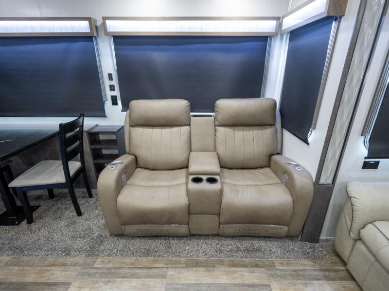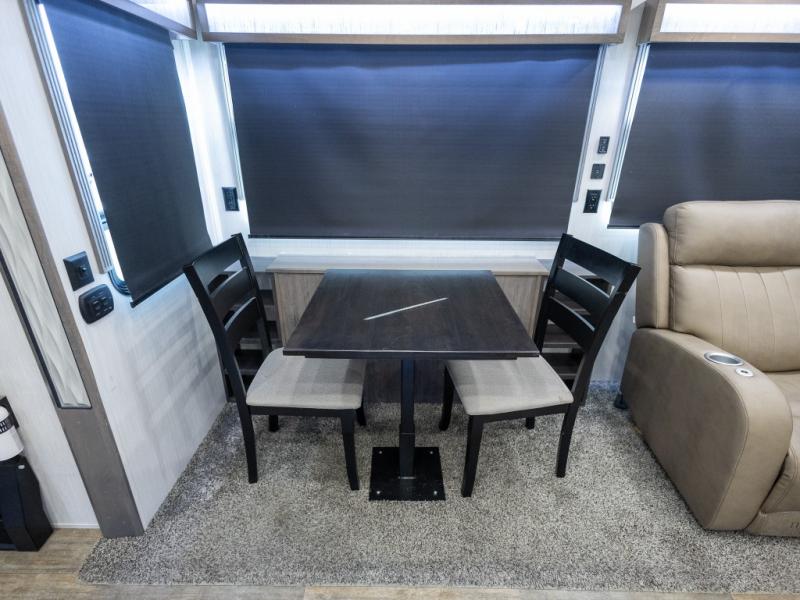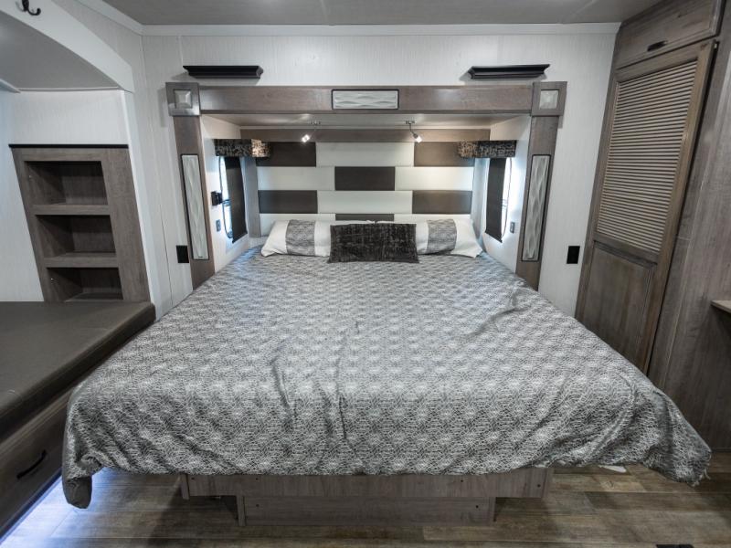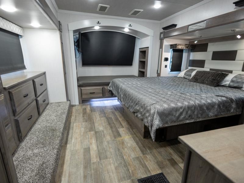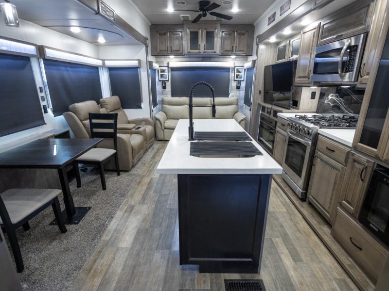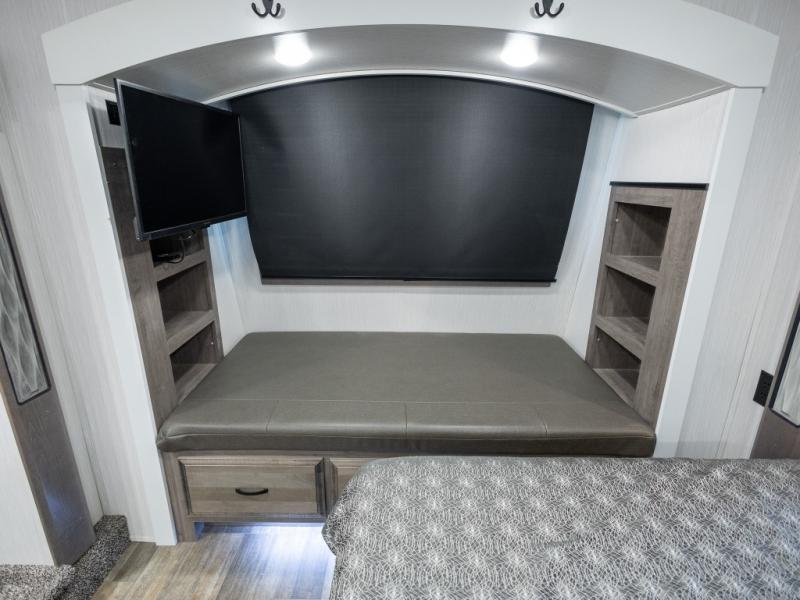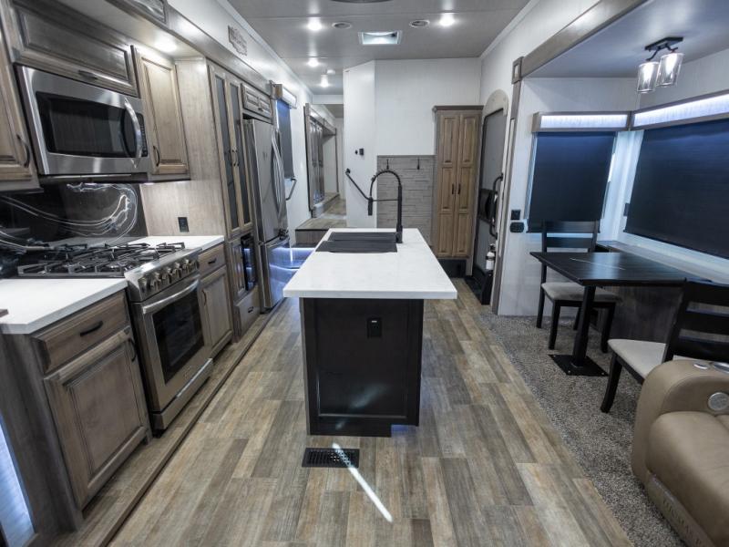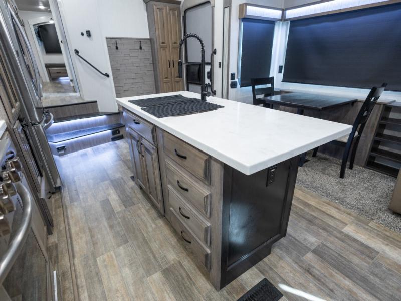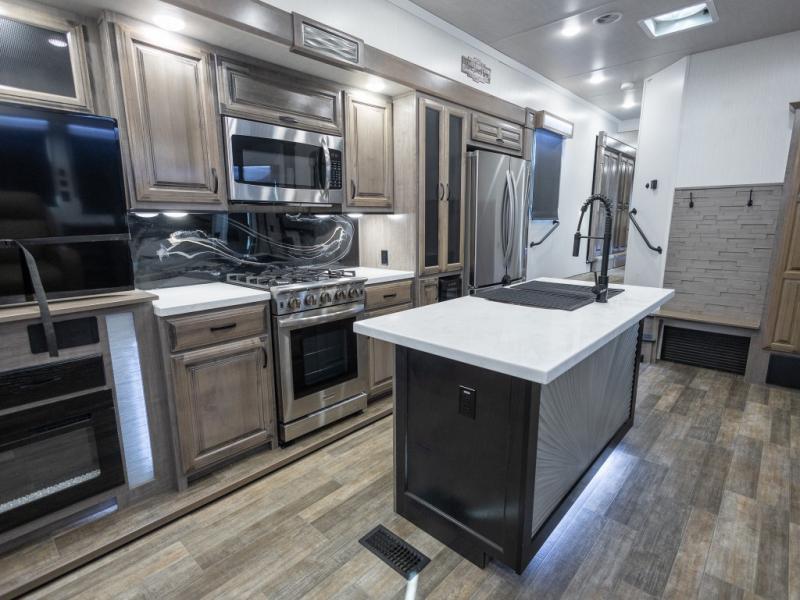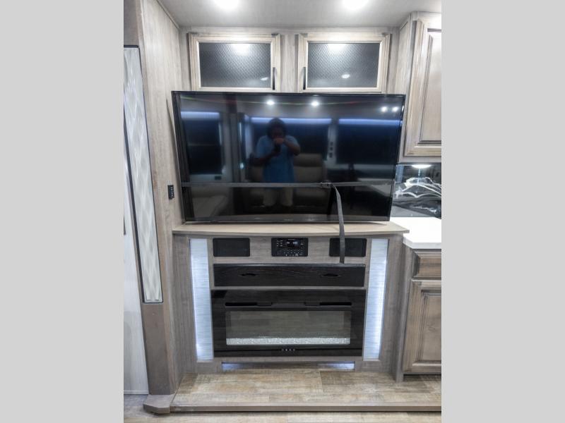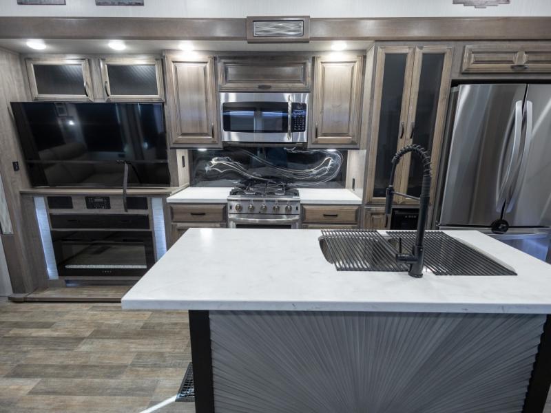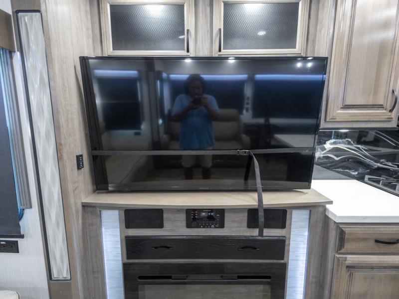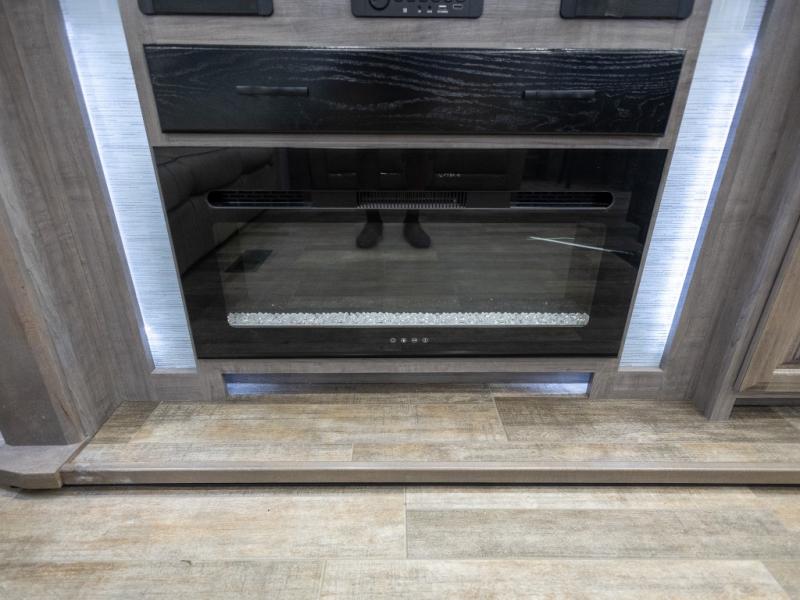 Stay in luxury in this fifth wheel with your own private bedroom including a bench with storage to sit and read a book or place your shoes on, two slide outs offering more interior floor space to walk around your upgraded luxury king mattress and watch a show on the 32" TV. You can add a washer/dryer option if you like, and the vanity will come in handy when getting ready for the day. The full bathroom offers two faucets in the large sink, plus a shower with a seat. The cook will surely love all the floor space with large dual slide outs in the combined living and kitchen area to make meals. The kitchen island is a great place to serve meals, wash dishes and you can add a dishwasher drawer option if you like. The fireplace with thermostat, the 55" 4K TV, and the power theater seats plus hide-a-bed sofa offer a cozy place to relax and visit with other RVers. And you might like to add the pull-out kitchen option to cook outdoors.