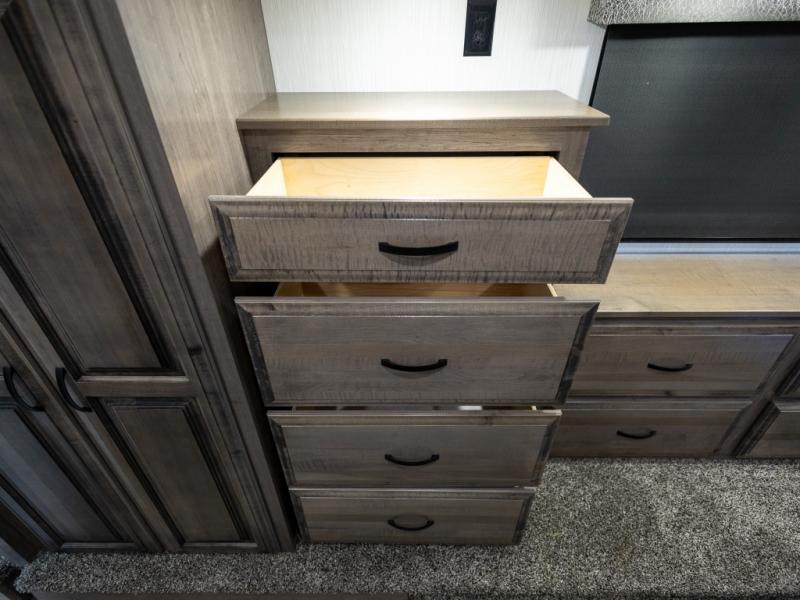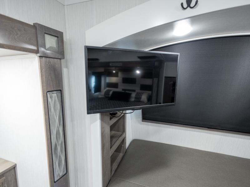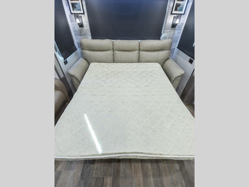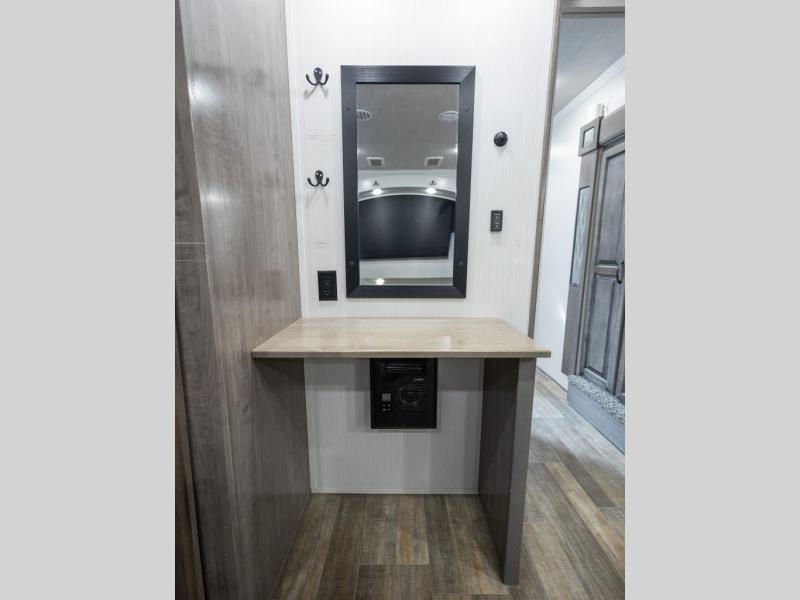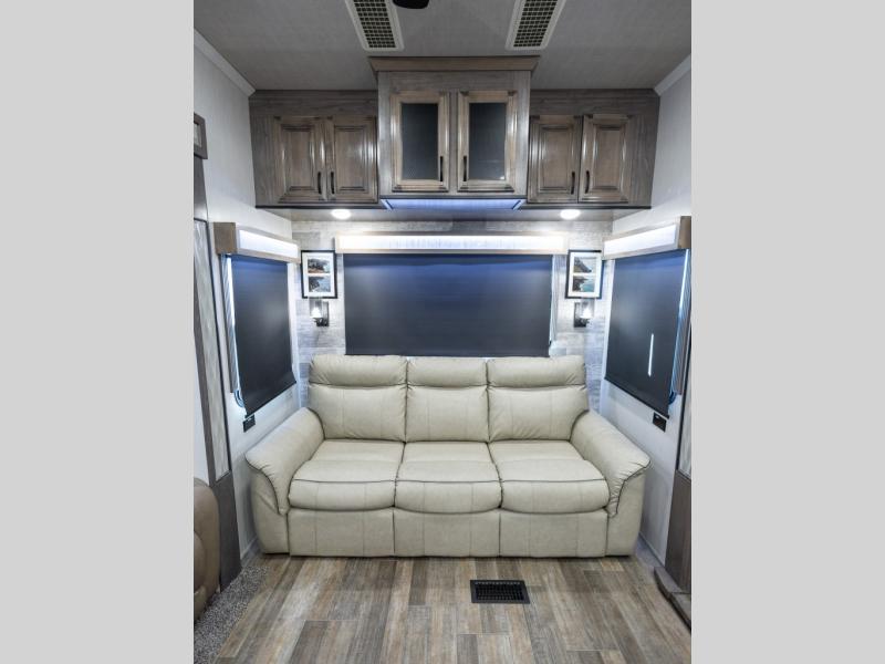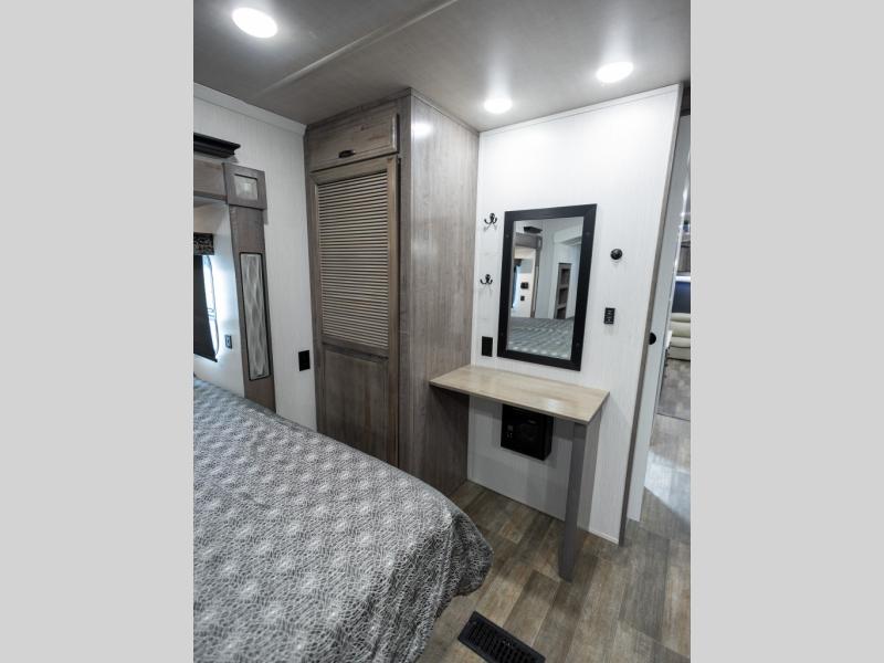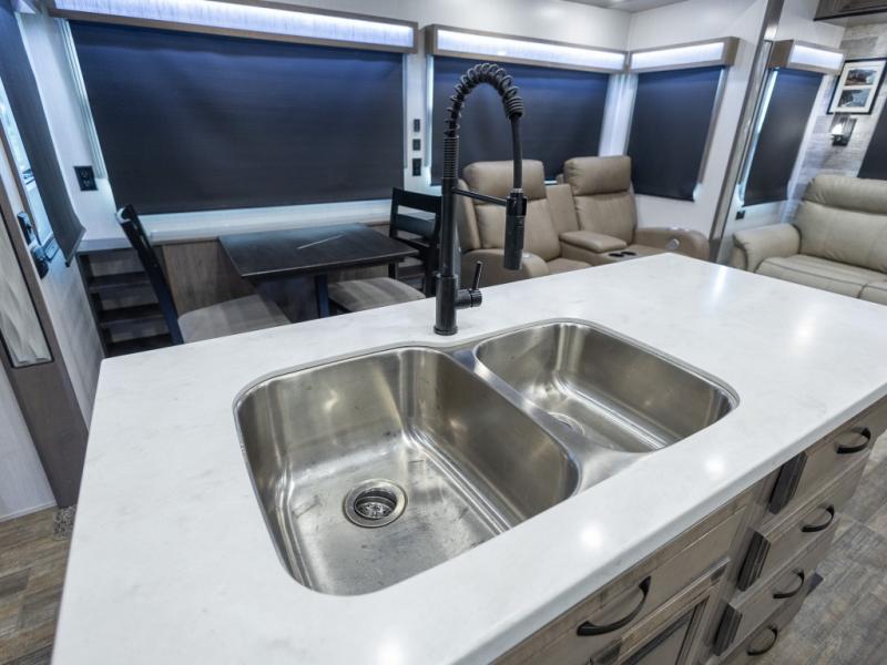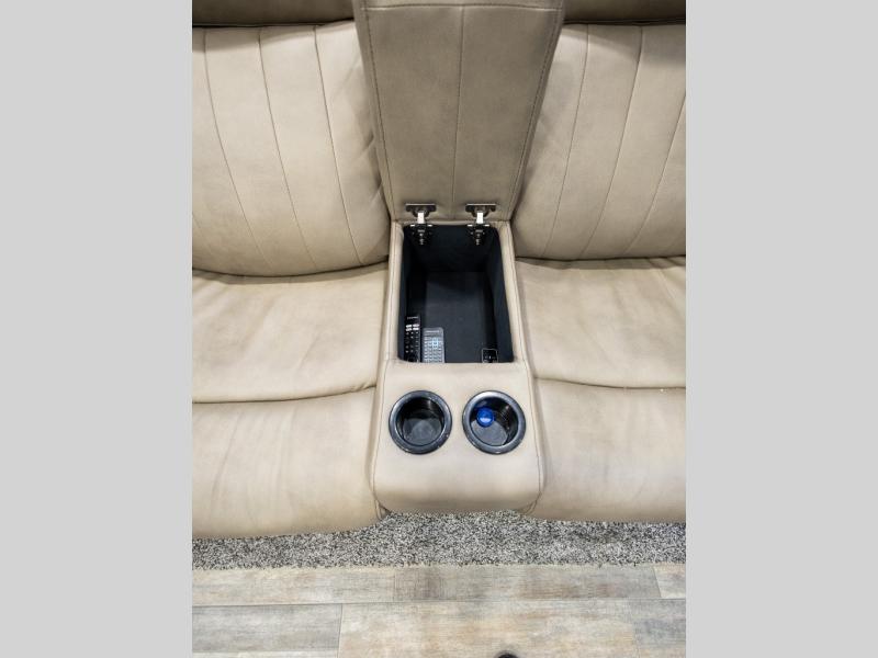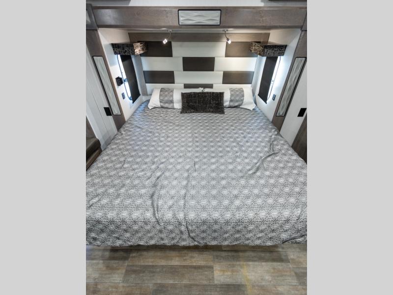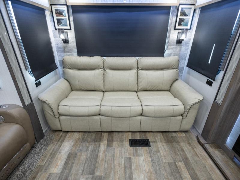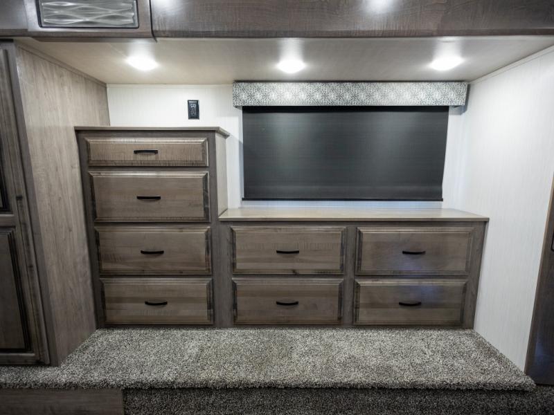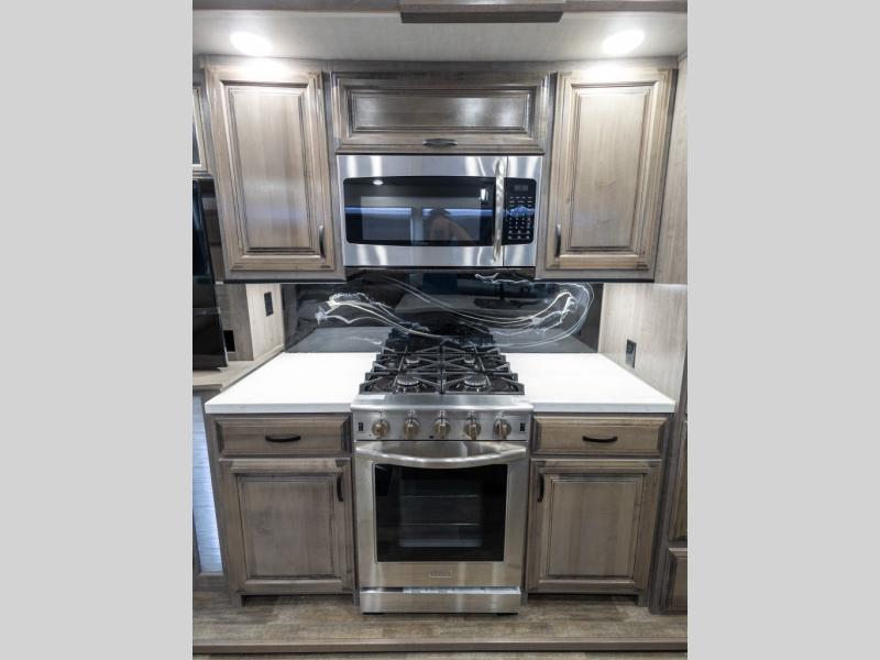Stay in luxury in this fifth wheel with your own private bedroom including a bench with storage to sit and read a book or place your shoes on, two slide outs offering more interior floor space to walk around your upgraded luxury king mattress and watch a show on the 32" TV. You can add a washer/dryer option if you like, and the vanity will come in handy when getting ready for the day. The full bathroom offers two faucets in the large sink, plus a shower with a seat. The cook will surely love all the floor space with large dual slide outs in the combined living and kitchen area to make meals. The kitchen island is a great place to serve meals, wash dishes and you can add a dishwasher drawer option if you like. The fireplace with thermostat, the 55" 4K TV, and the power theater seats plus hide-a-bed sofa offer a cozy place to relax and visit with other RVers. And you might like to add the pull-out kitchen option to cook outdoors.