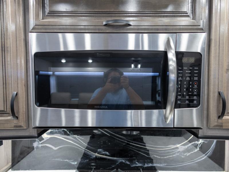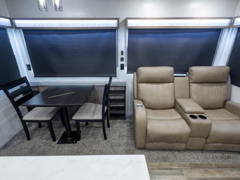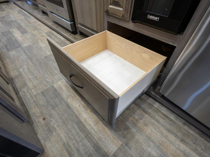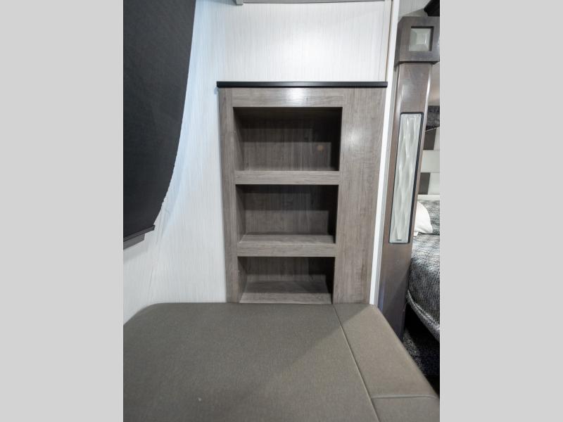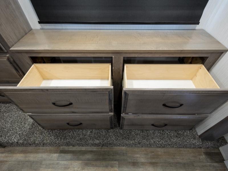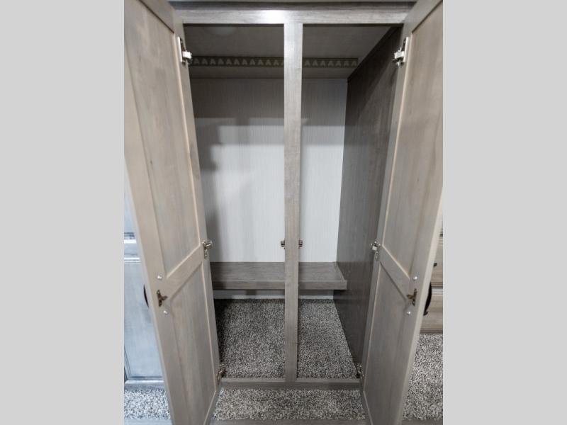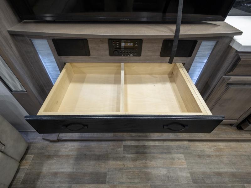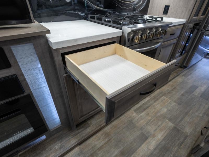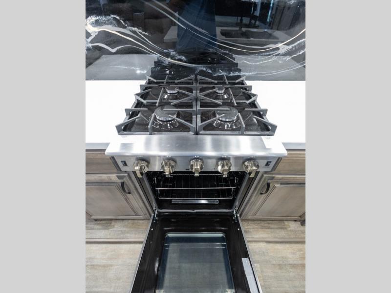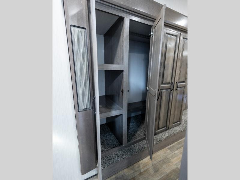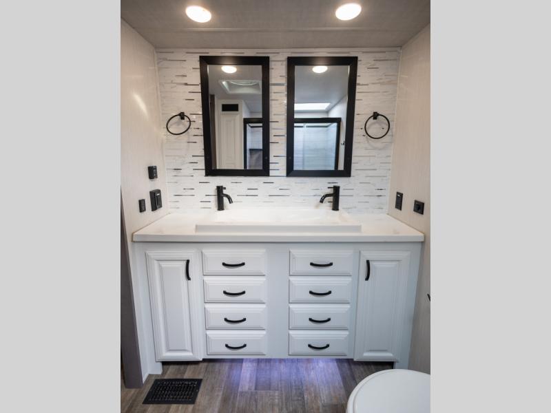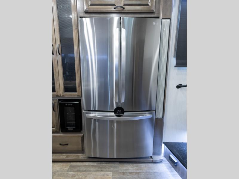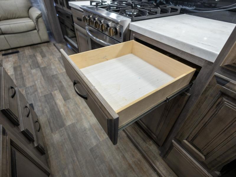 Stay in luxury in this fifth wheel with your own private bedroom including a bench with storage to sit and read a book or place your shoes on, two slide outs offering more interior floor space to walk around your upgraded luxury king mattress and watch a show on the 32" TV. You can add a washer/dryer option if you like, and the vanity will come in handy when getting ready for the day. The full bathroom offers two faucets in the large sink, plus a shower with a seat. The cook will surely love all the floor space with large dual slide outs in the combined living and kitchen area to make meals. The kitchen island is a great place to serve meals, wash dishes and you can add a dishwasher drawer option if you like. The fireplace with thermostat, the 55" 4K TV, and the power theater seats plus hide-a-bed sofa offer a cozy place to relax and visit with other RVers. And you might like to add the pull-out kitchen option to cook outdoors.