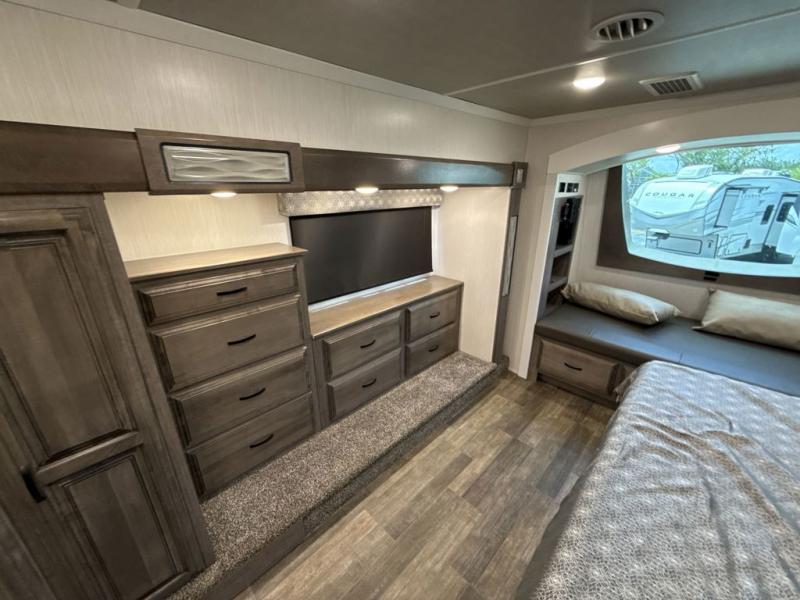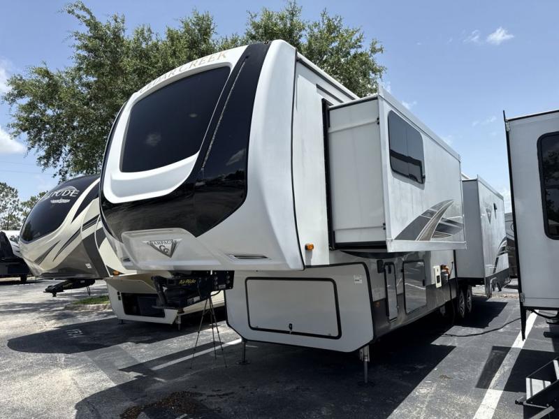 With any Cedar Creek Champagne Edition fifth wheel by Forest River you can extend your stay during any climate and where ever you decide to set up! Each is built with an all aluminum super structure, 100% aluminum framed windows and baggage doors, large surface 12V heating pads on all tanks, the Dexter Safety and Performance package, plus the Standard Level-Up 6-point hydraulic leveling system. The fifth wheels are powered by Firefly Integrations with advanced electrical automation, and includes the King WiFi router/range extender, the Truma AquaGo instant water heater for constant, endless supply of hot water, and a heated front storage compartment. Inside you will find luxury and convenience throughout with features like Ashley Grey high sheen maple cabinet doors and drawers with hidden hinges, the Champagne LED lighting package, Intra-Vac central vacuum system with front storage port, two Whisper Quiet, ducted air conditioners with dual zone control and cold air returns, and residential appliances to mention a few.
