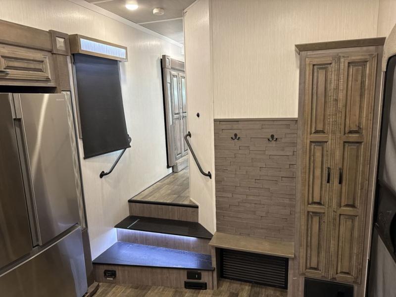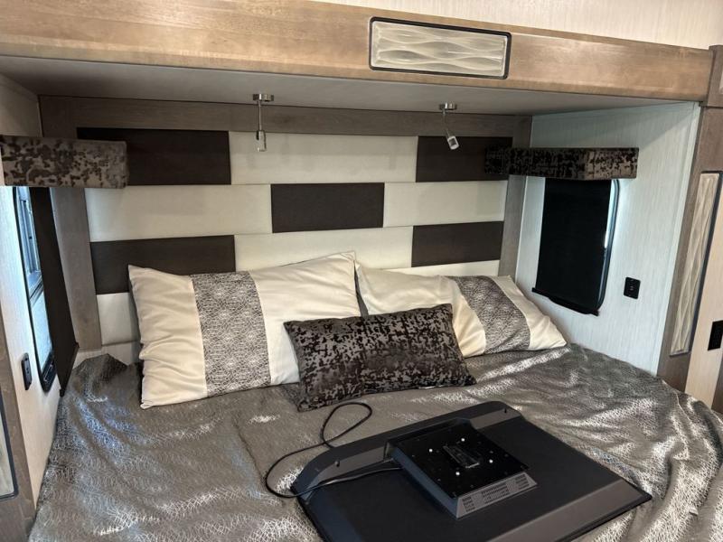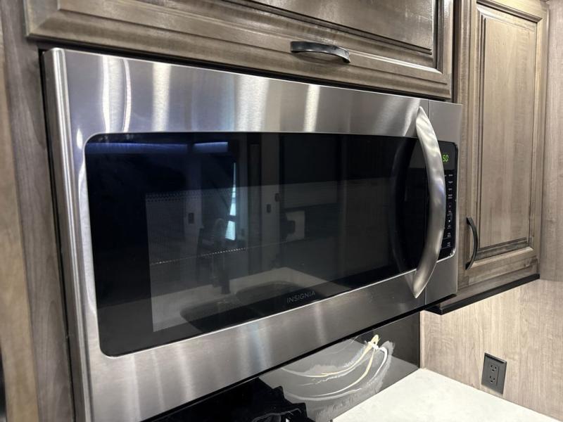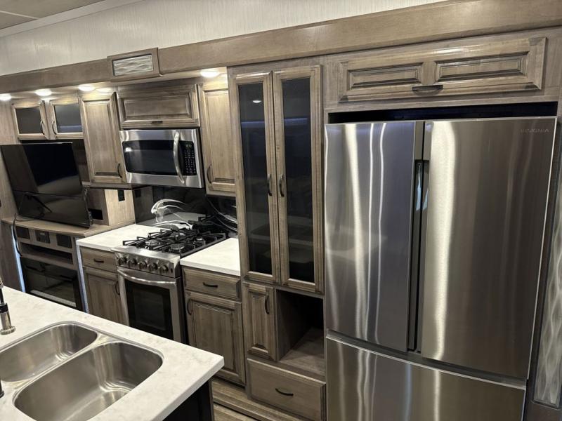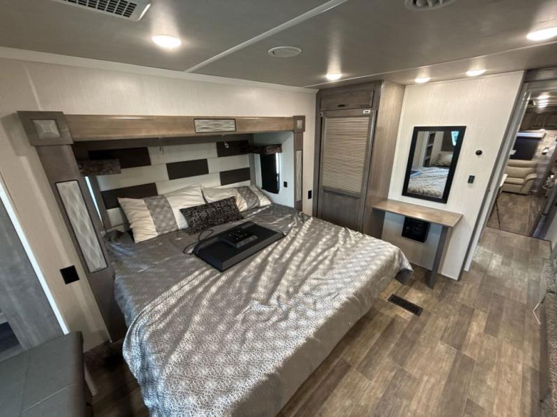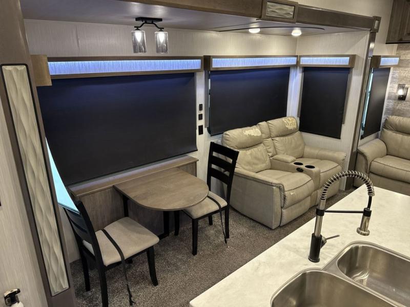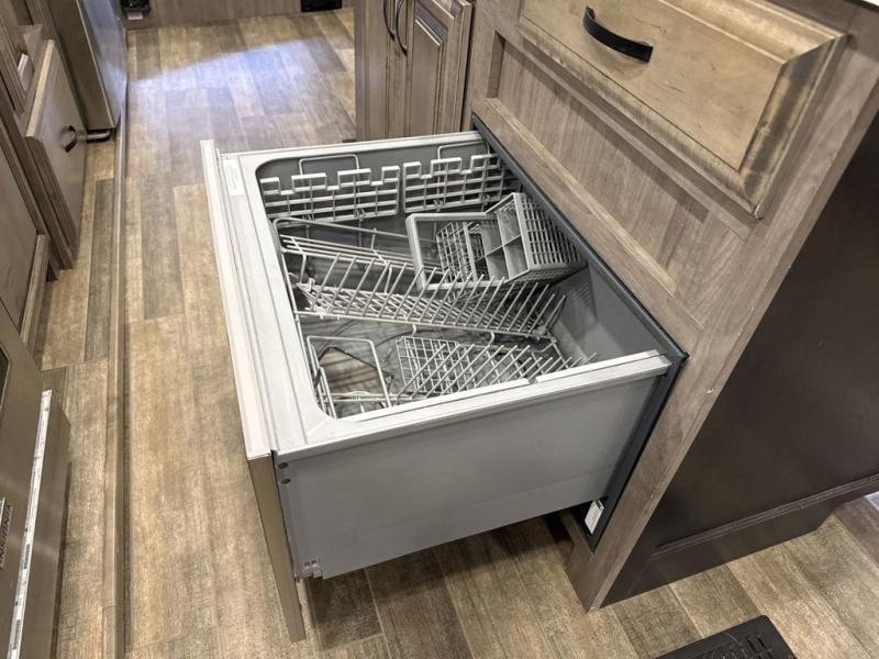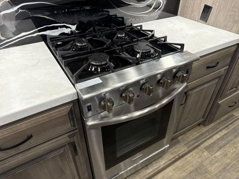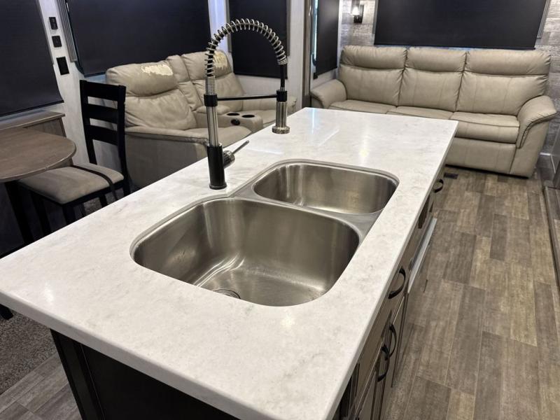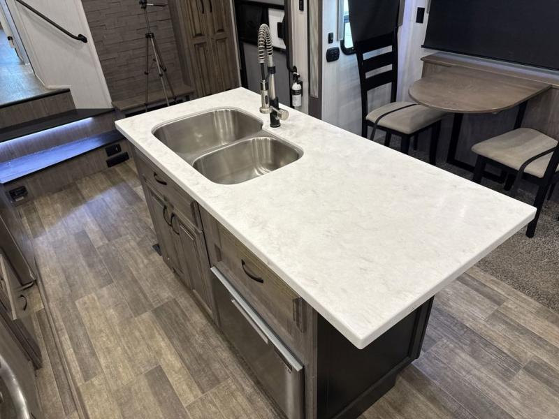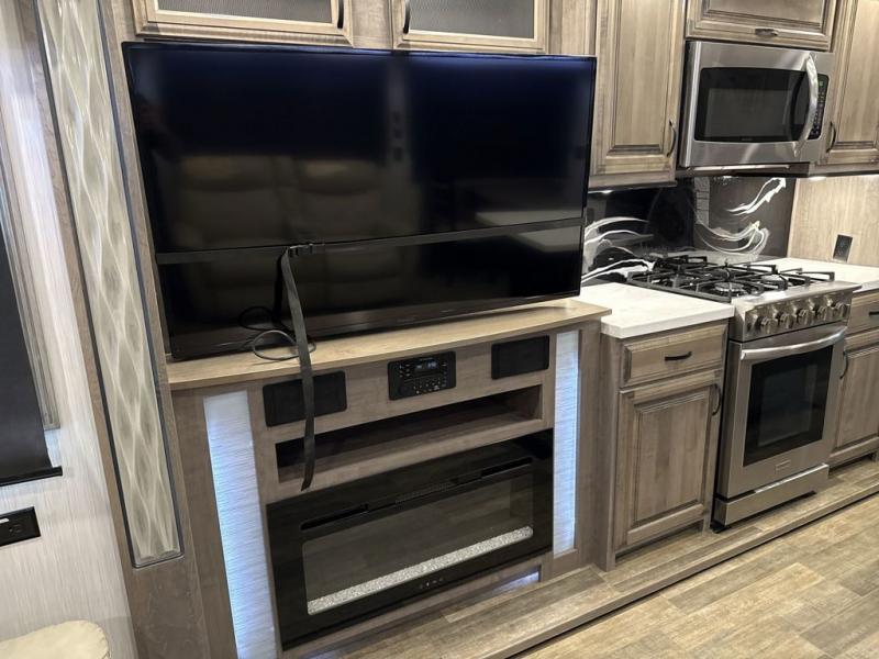 Stay in luxury in this fifth wheel with your own private bedroom including a bench with storage to sit and read a book or place your shoes on, two slide outs offering more interior floor space to walk around your upgraded luxury king mattress and watch a show on the 32" TV. You can add a washer/dryer option if you like, and the vanity will come in handy when getting ready for the day. The full bathroom offers two faucets in the large sink, plus a shower with a seat. The cook will surely love all the floor space with large dual slide outs in the combined living and kitchen area to make meals. The kitchen island is a great place to serve meals, wash dishes and you can add a dishwasher drawer option if you like. The fireplace with thermostat, the 55" 4K TV, and the power theater seats plus hide-a-bed sofa offer a cozy place to relax and visit with other RVers. And you might like to add the pull-out kitchen option to cook outdoors.
