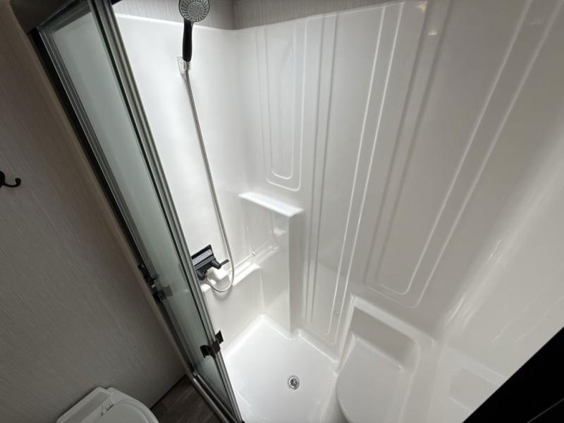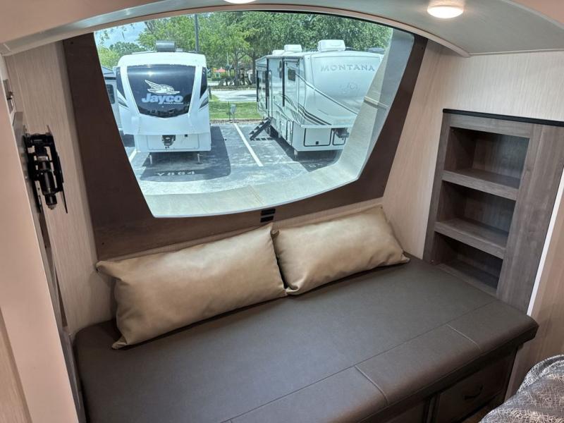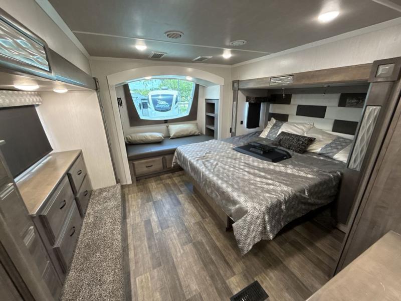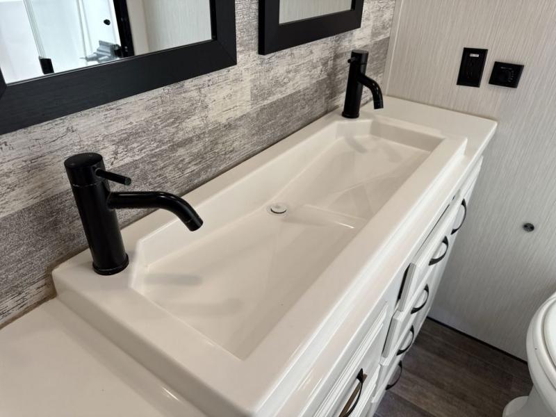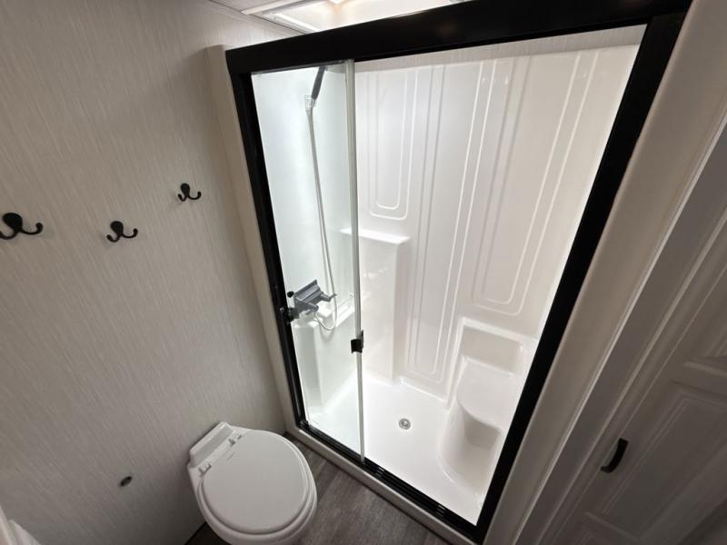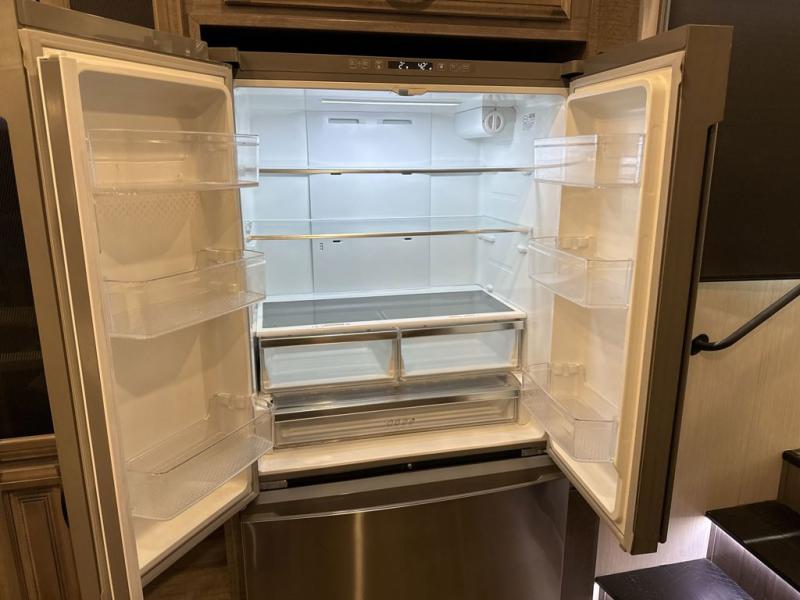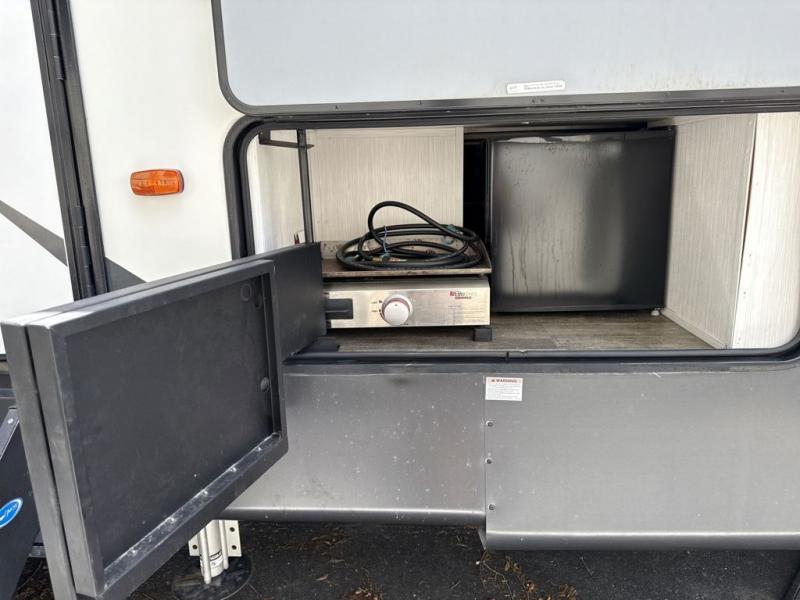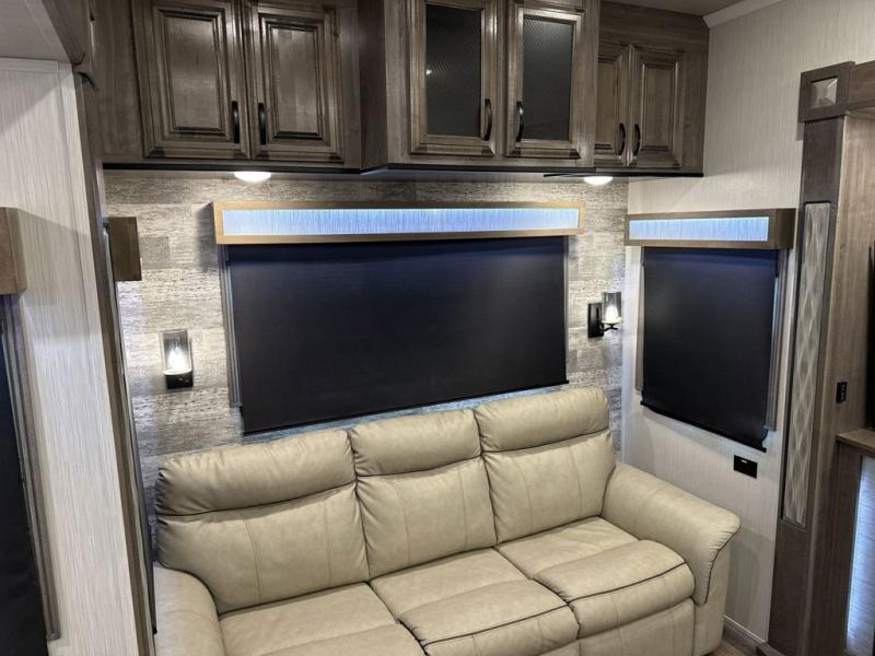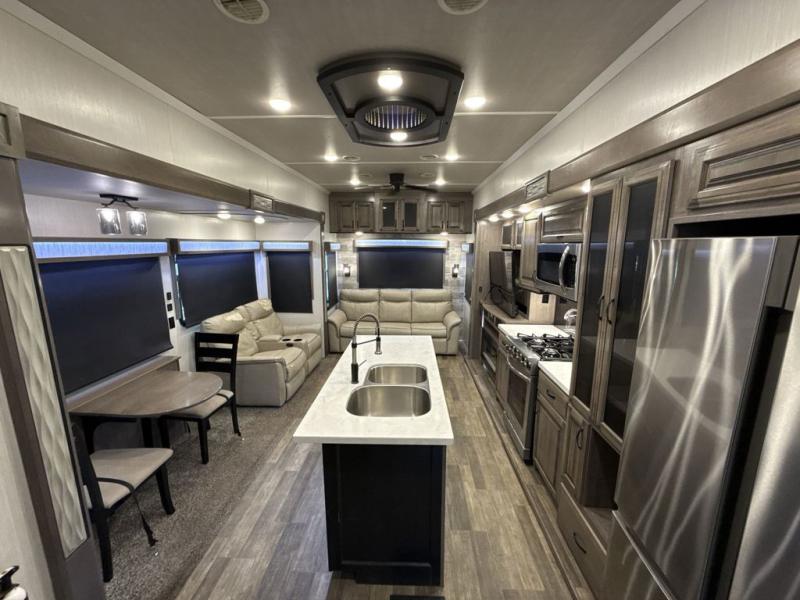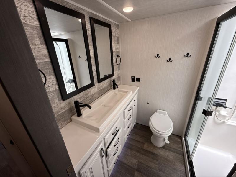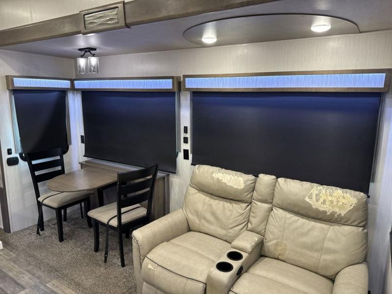 Stay in luxury in this fifth wheel with your own private bedroom including a bench with storage to sit and read a book or place your shoes on, two slide outs offering more interior floor space to walk around your upgraded luxury king mattress and watch a show on the 32" TV. You can add a washer/dryer option if you like, and the vanity will come in handy when getting ready for the day. The full bathroom offers two faucets in the large sink, plus a shower with a seat. The cook will surely love all the floor space with large dual slide outs in the combined living and kitchen area to make meals. The kitchen island is a great place to serve meals, wash dishes and you can add a dishwasher drawer option if you like. The fireplace with thermostat, the 55" 4K TV, and the power theater seats plus hide-a-bed sofa offer a cozy place to relax and visit with other RVers. And you might like to add the pull-out kitchen option to cook outdoors.