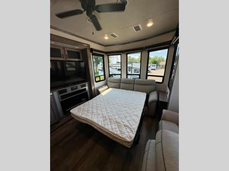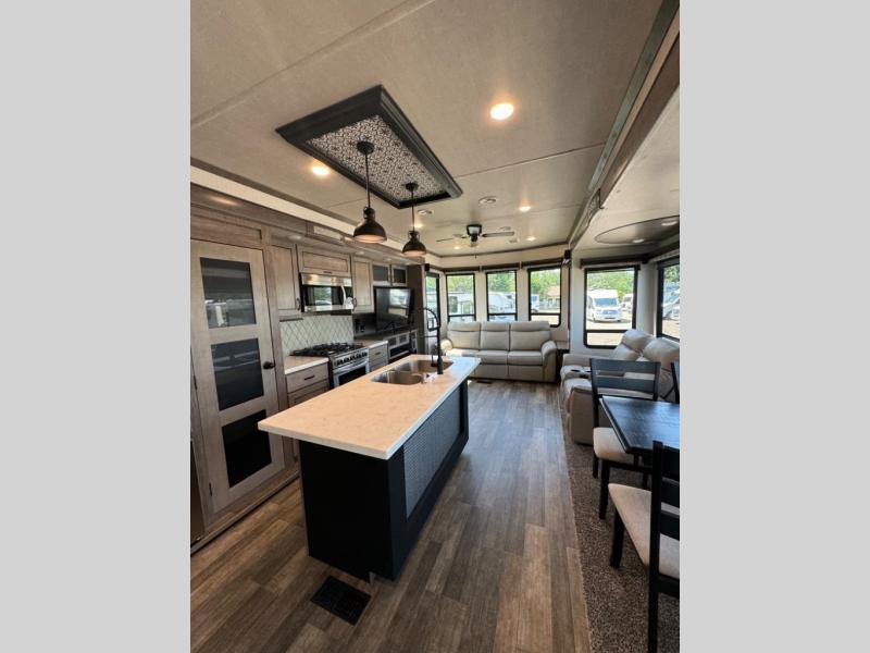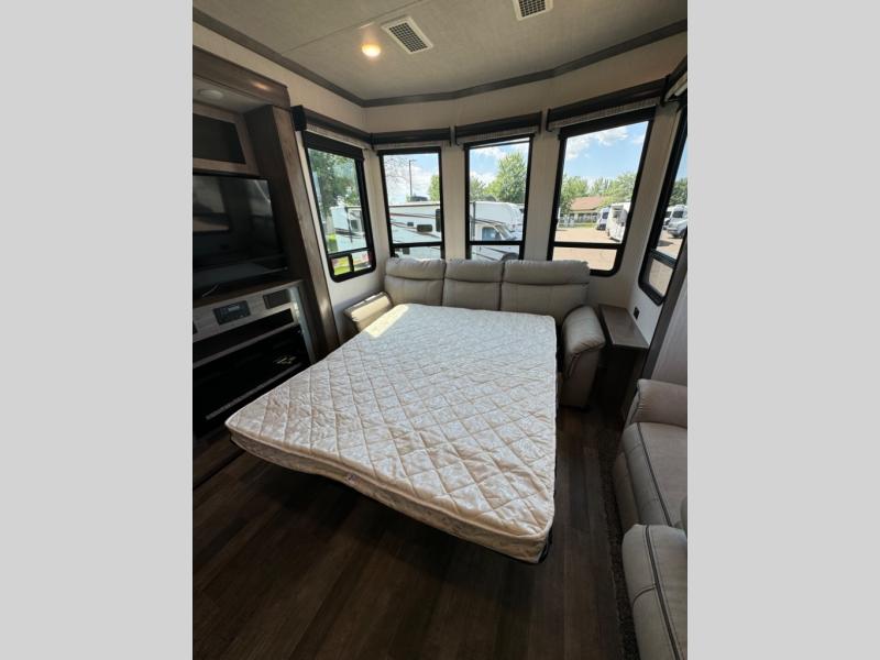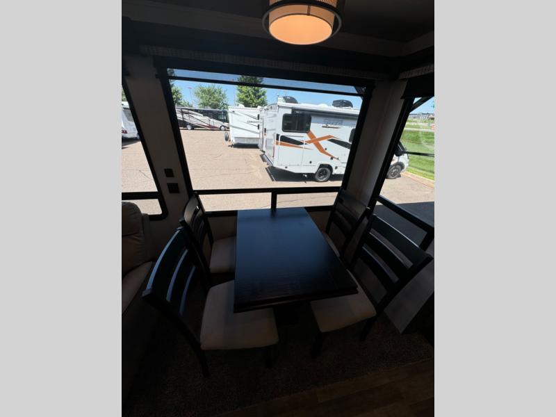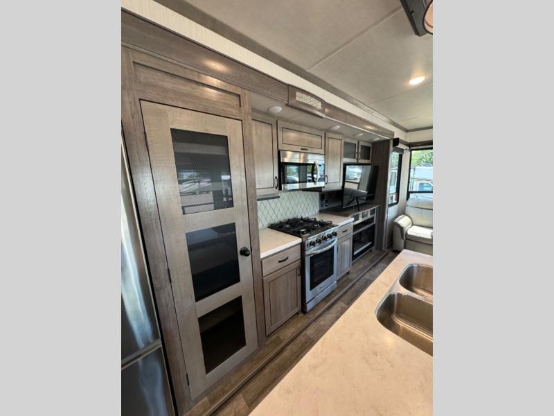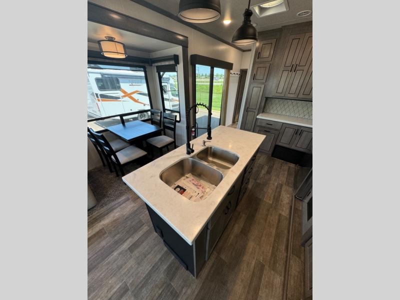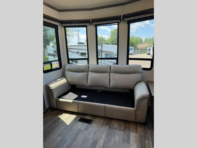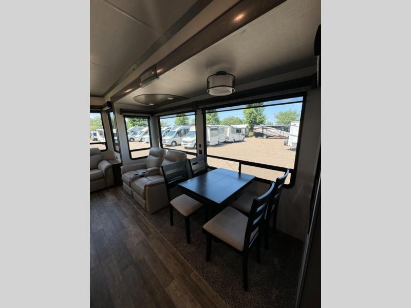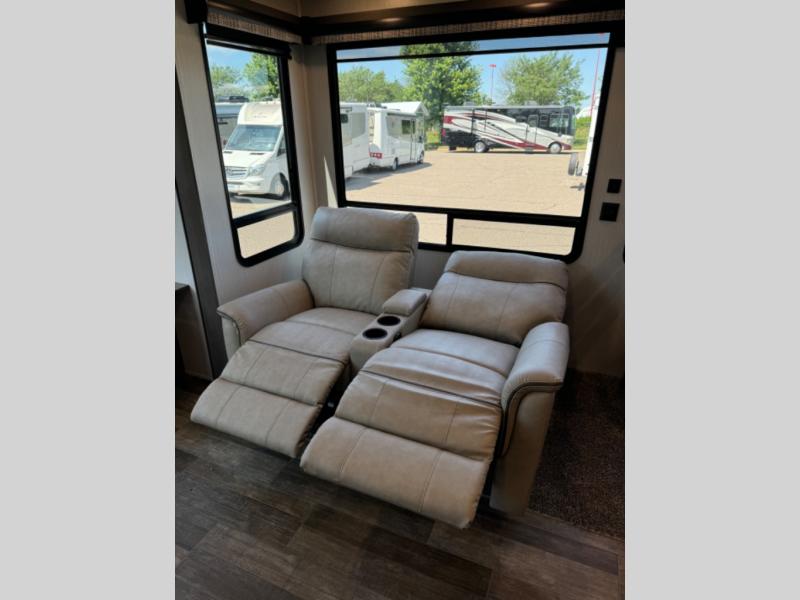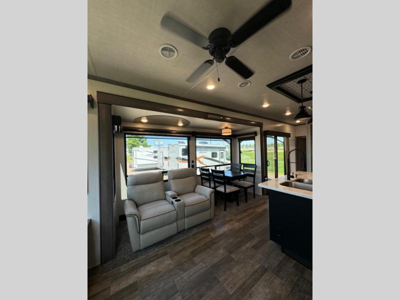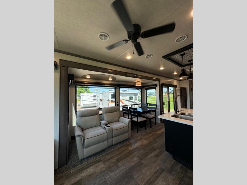Your wait is over, this destination trailer is ready for your next stay! As you enter you will feel the comfort and spaciousness of the combined kitchen and living area with dual slide outs, and you can relax on the hide-a-bed sofa up front, the power theater seats or eat a snack at the free-standing dinette. You can enjoy the outdoors inside through the full view windows, and will have residential style throughout, plus full amenities in the kitchen. The rear master bedroom offers you a king bed slide, a dresser, a wardrobe and a closet prepped for a washer/dryer option as well as the second entry so you can get outside quickly to relax under the 18' electric awning. You will find so many more features to enjoy, plus there are several options you might like to add to enhance this already amazing destination trailer.