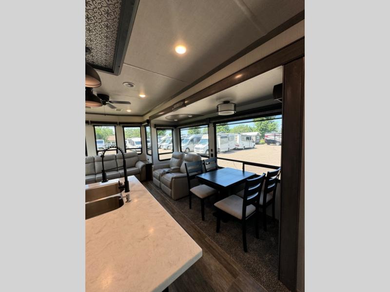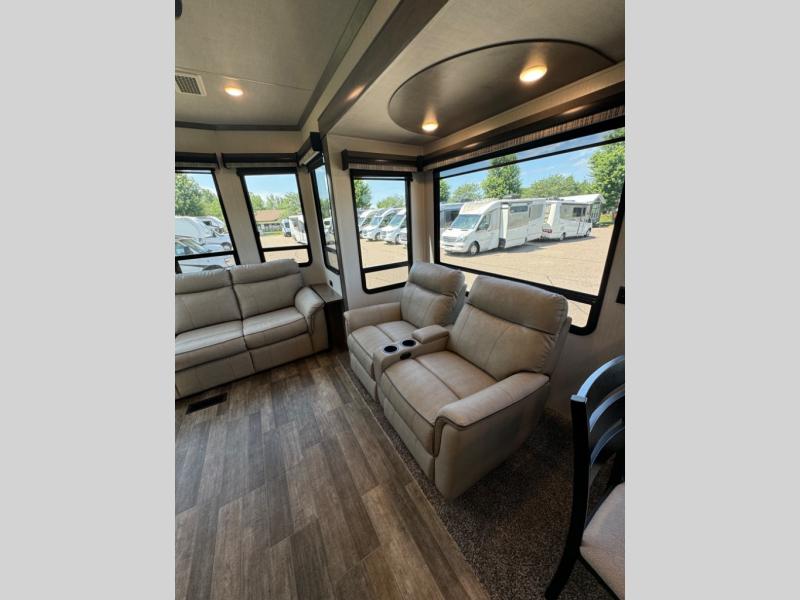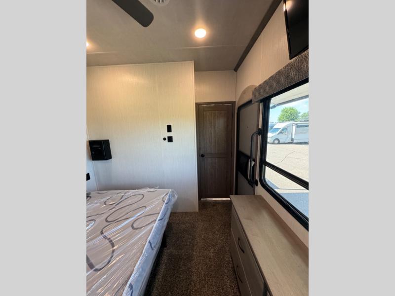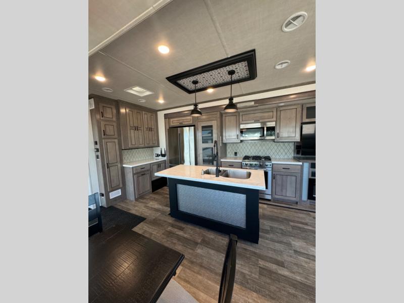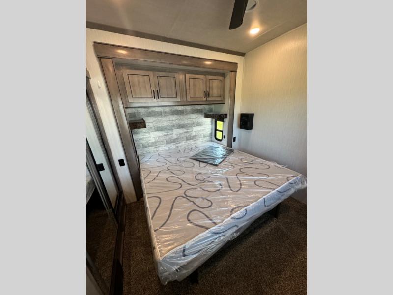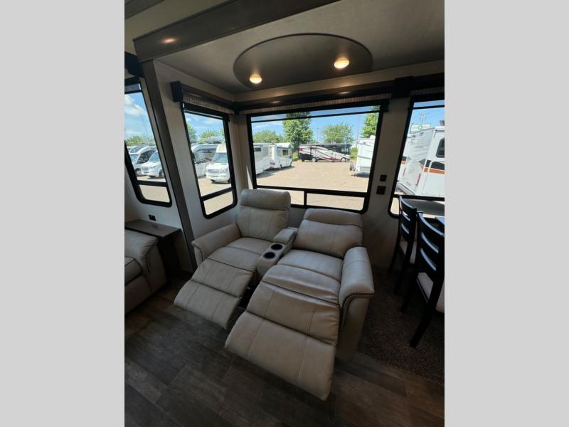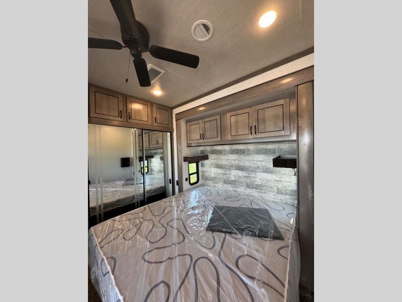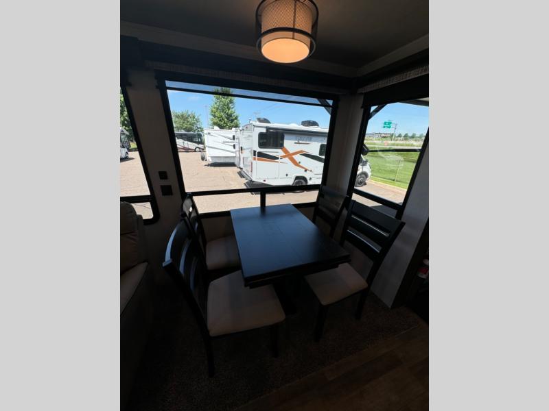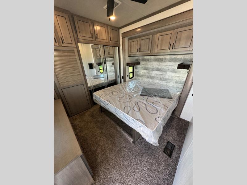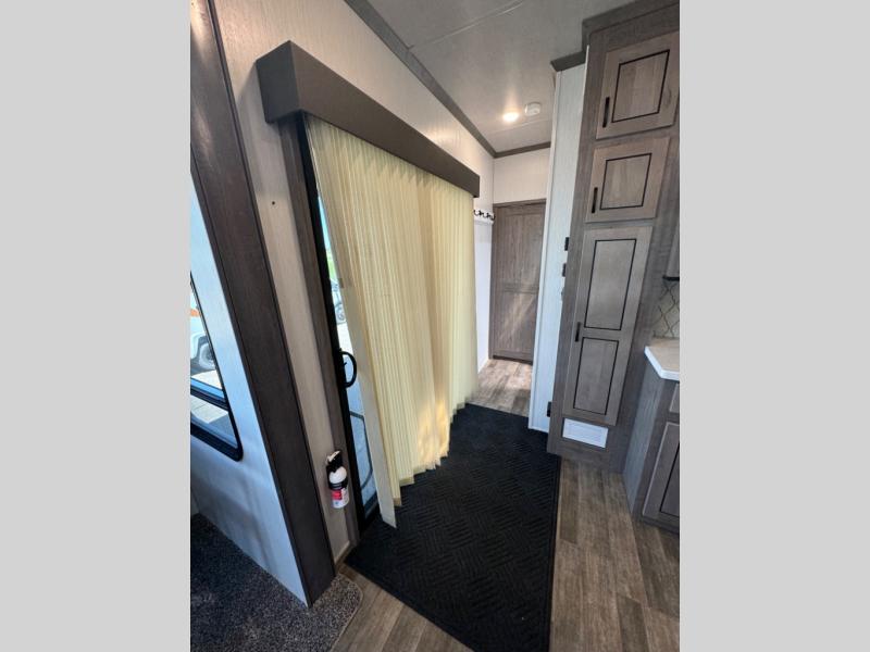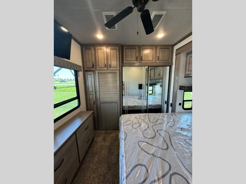 Your wait is over, this destination trailer is ready for your next stay! As you enter you will feel the comfort and spaciousness of the combined kitchen and living area with dual slide outs, and you can relax on the hide-a-bed sofa up front, the power theater seats or eat a snack at the free-standing dinette. You can enjoy the outdoors inside through the full view windows, and will have residential style throughout, plus full amenities in the kitchen. The rear master bedroom offers you a king bed slide, a dresser, a wardrobe and a closet prepped for a washer/dryer option as well as the second entry so you can get outside quickly to relax under the 18' electric awning. You will find so many more features to enjoy, plus there are several options you might like to add to enhance this already amazing destination trailer.