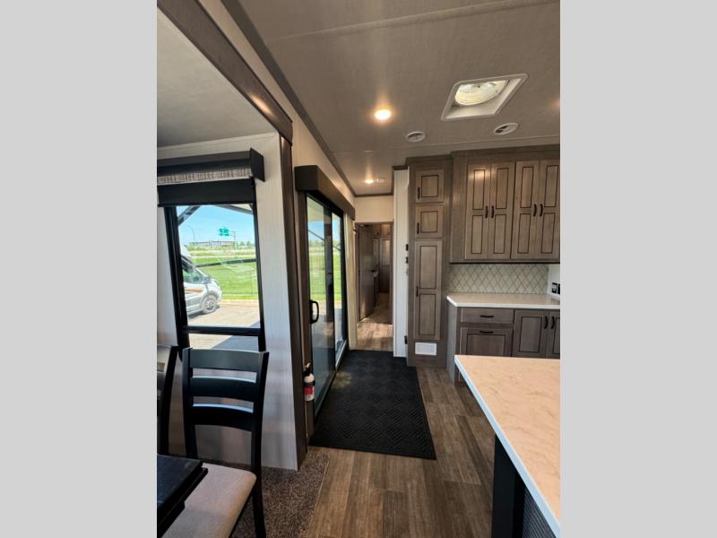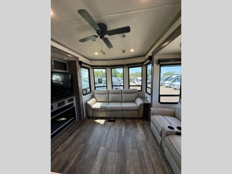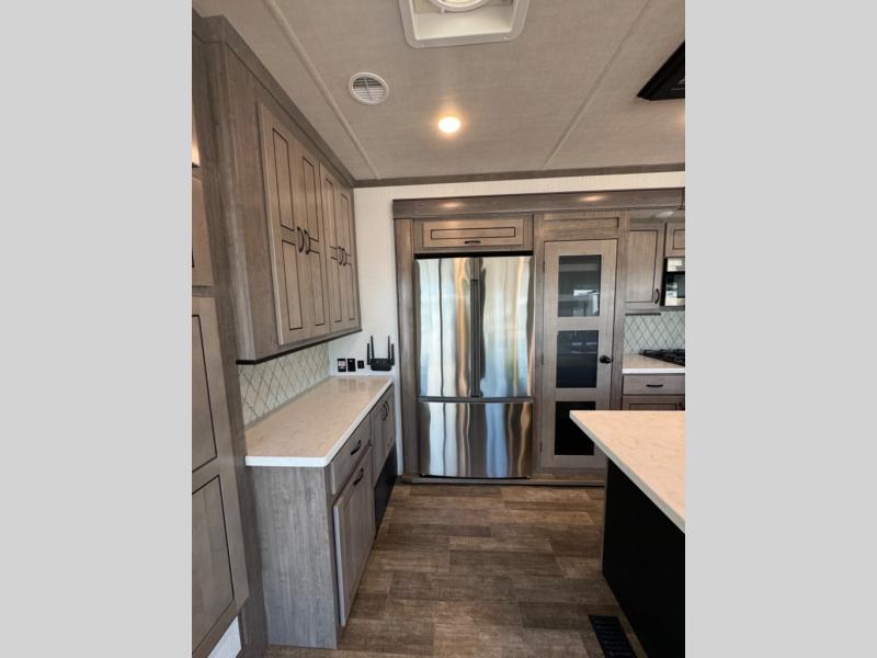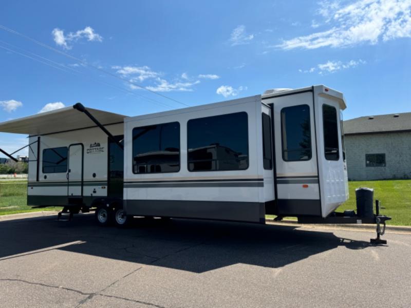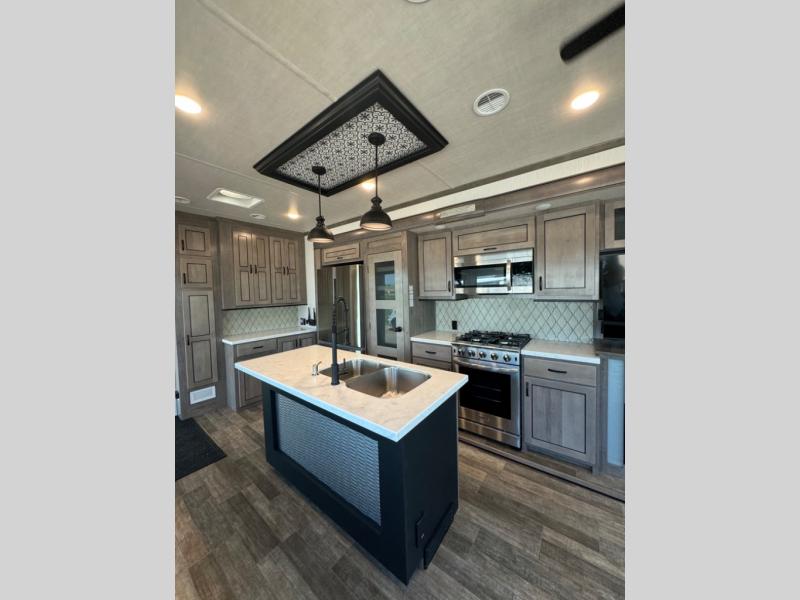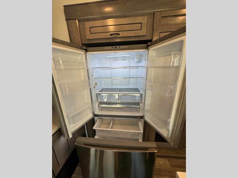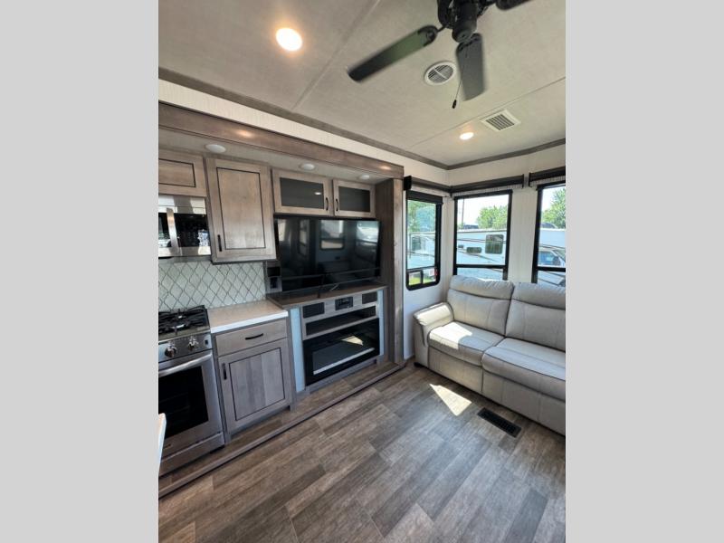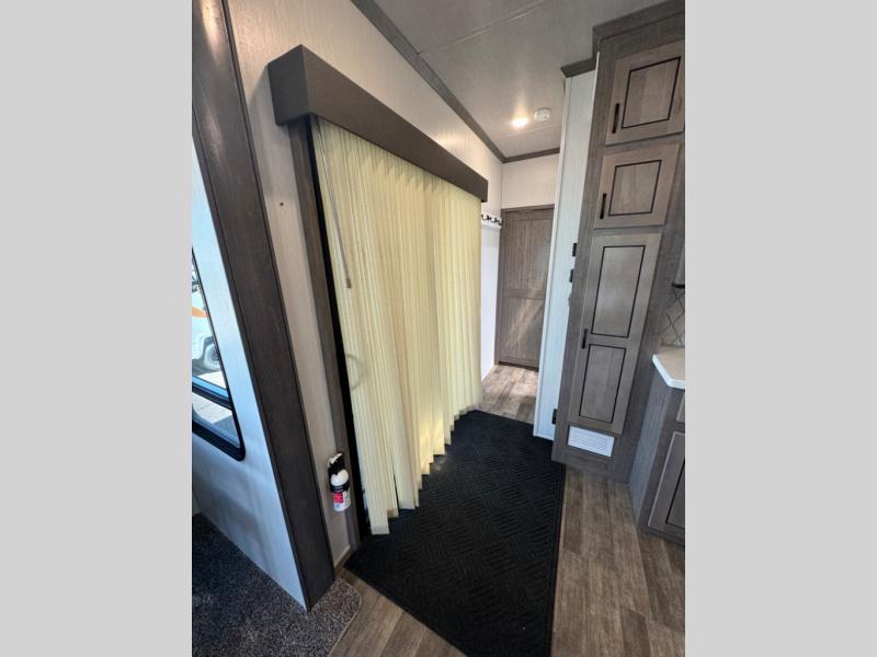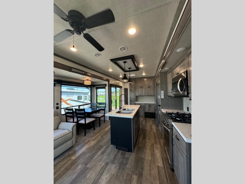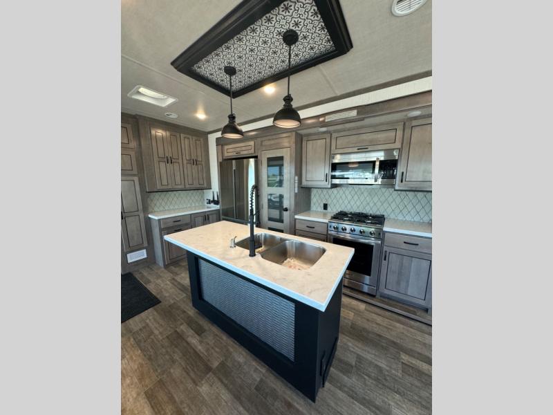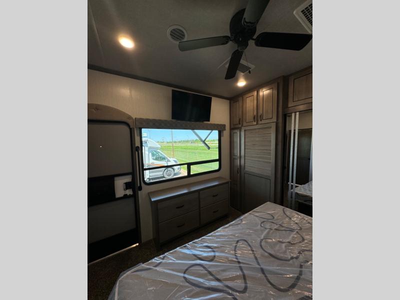 Your wait is over, this destination trailer is ready for your next stay! As you enter you will feel the comfort and spaciousness of the combined kitchen and living area with dual slide outs, and you can relax on the hide-a-bed sofa up front, the power theater seats or eat a snack at the free-standing dinette. You can enjoy the outdoors inside through the full view windows, and will have residential style throughout, plus full amenities in the kitchen. The rear master bedroom offers you a king bed slide, a dresser, a wardrobe and a closet prepped for a washer/dryer option as well as the second entry so you can get outside quickly to relax under the 18' electric awning. You will find so many more features to enjoy, plus there are several options you might like to add to enhance this already amazing destination trailer.