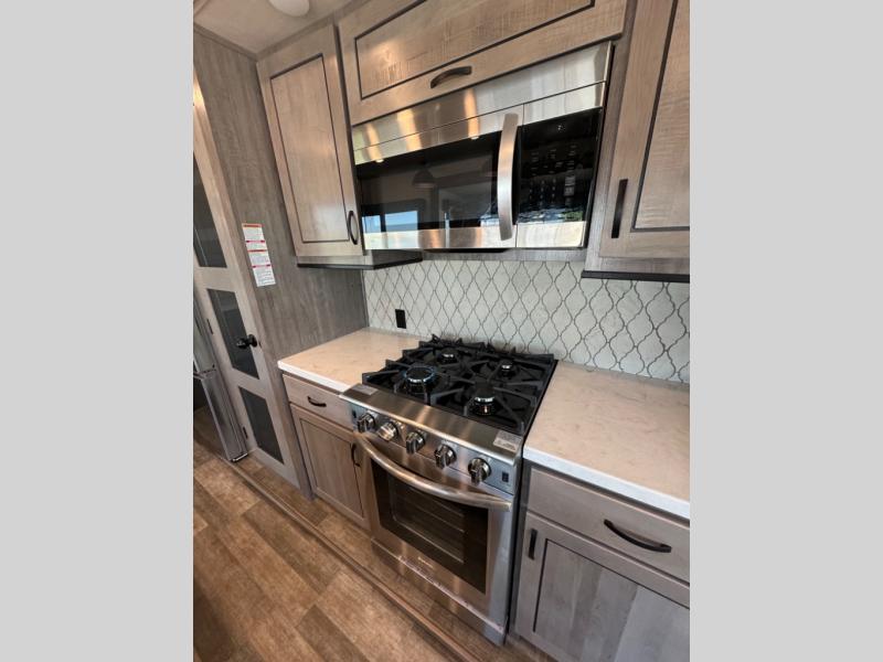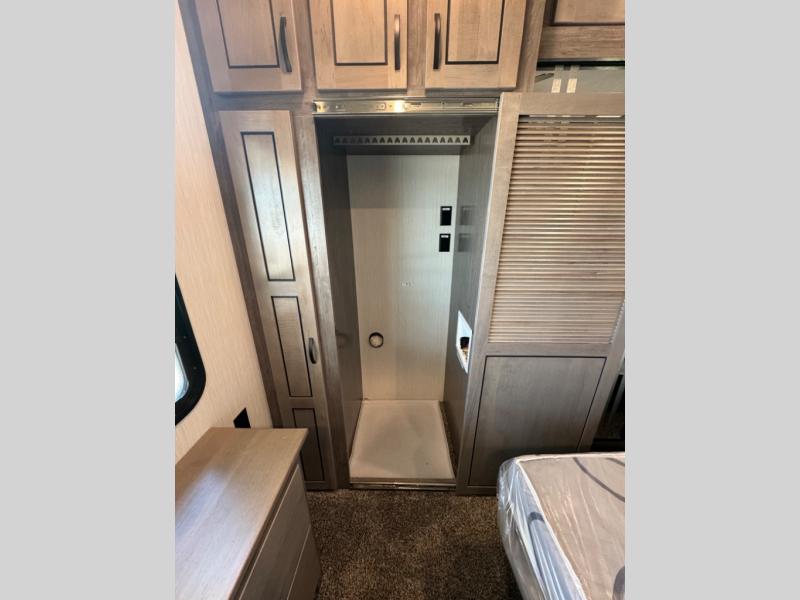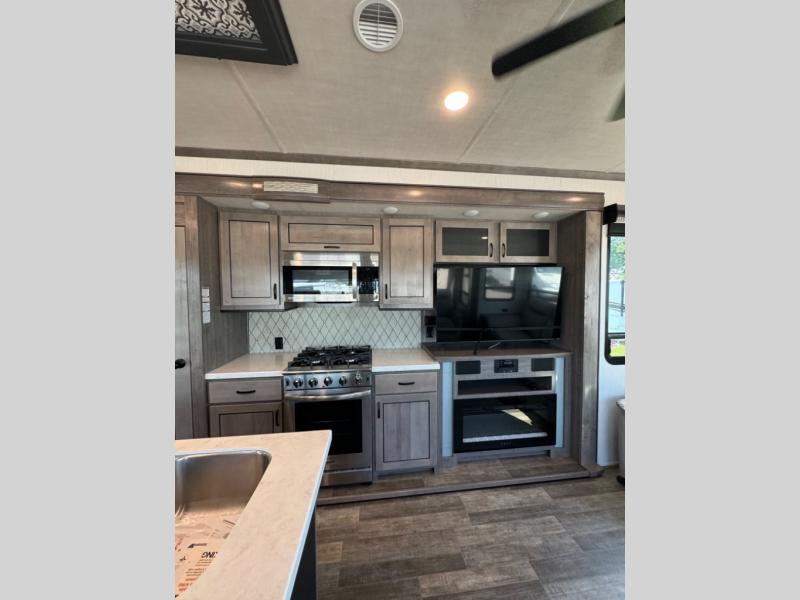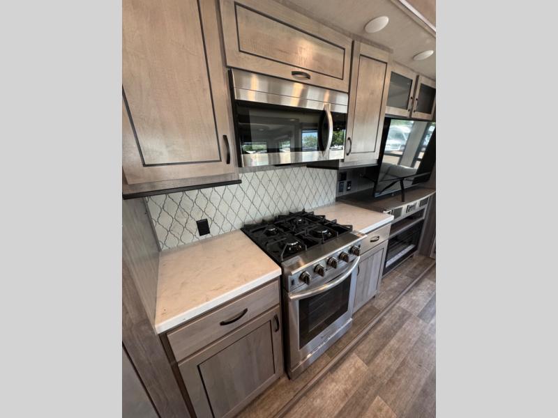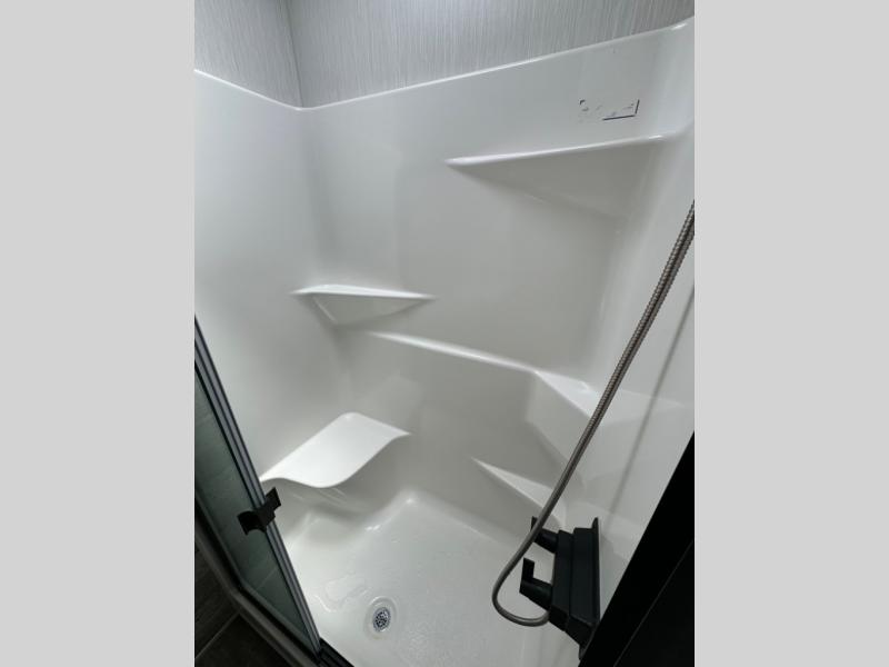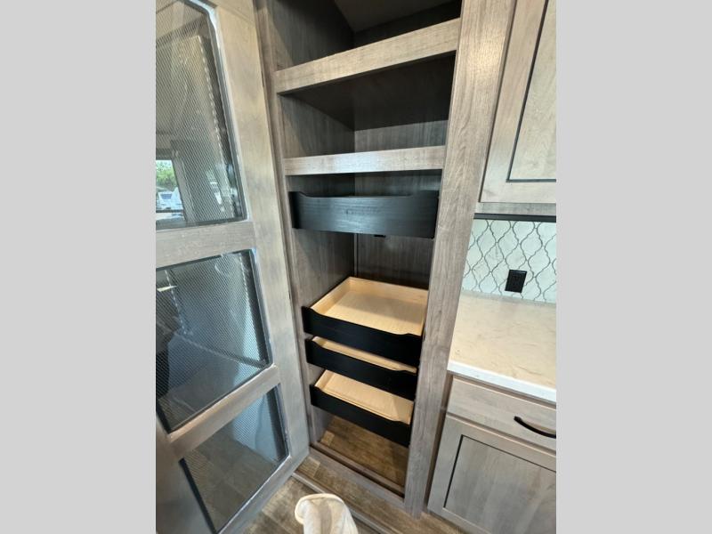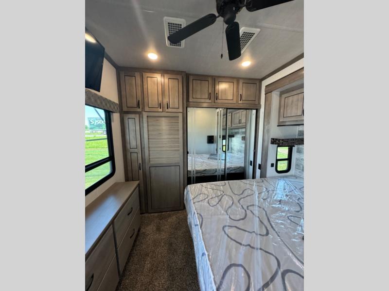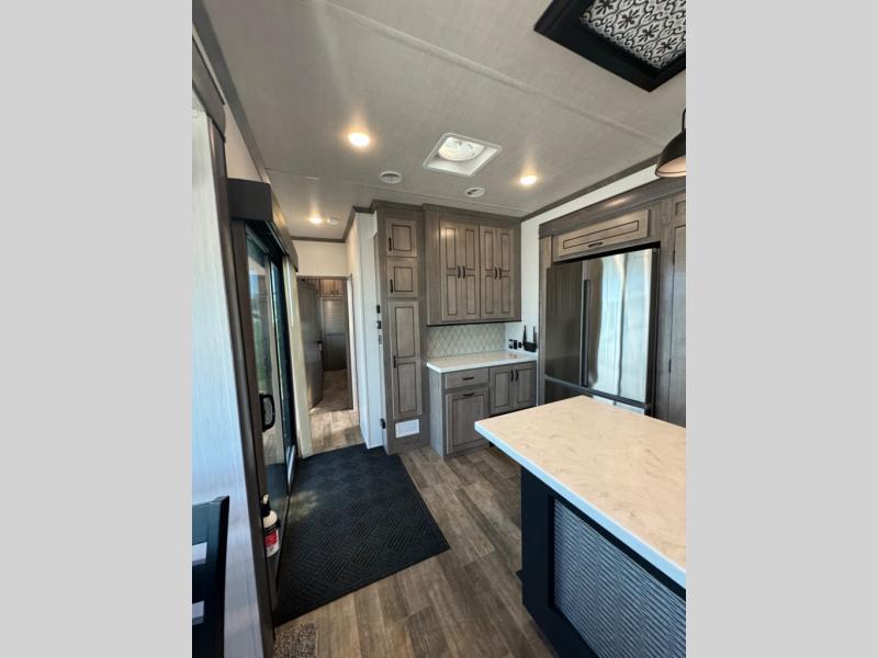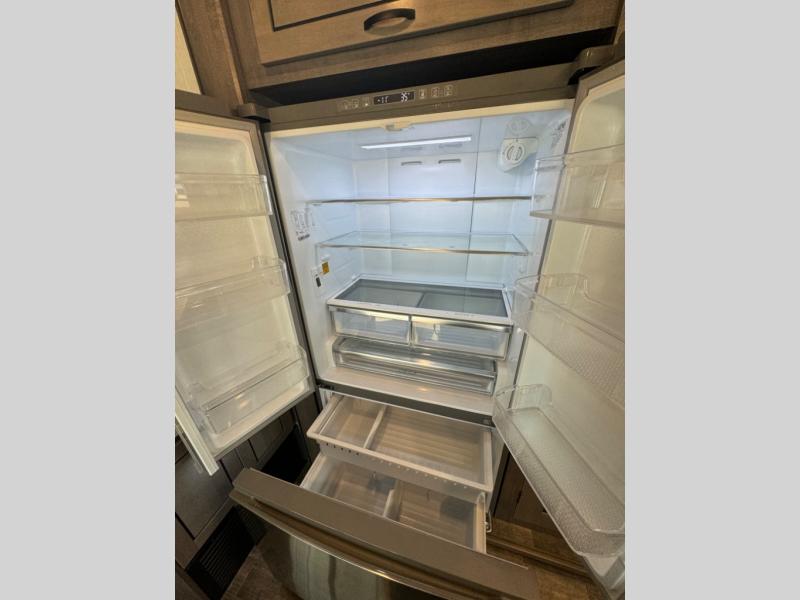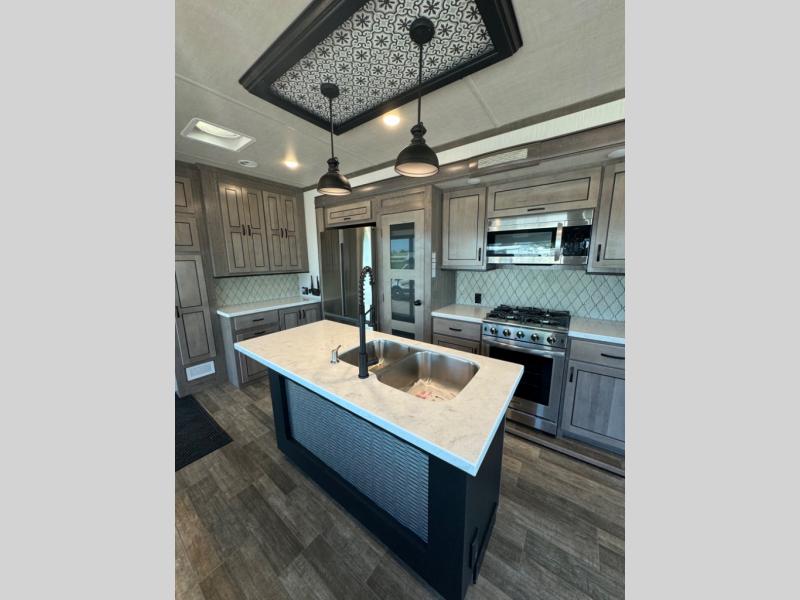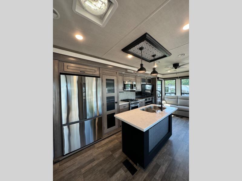 Your wait is over, this destination trailer is ready for your next stay! As you enter you will feel the comfort and spaciousness of the combined kitchen and living area with dual slide outs, and you can relax on the hide-a-bed sofa up front, the power theater seats or eat a snack at the free-standing dinette. You can enjoy the outdoors inside through the full view windows, and will have residential style throughout, plus full amenities in the kitchen. The rear master bedroom offers you a king bed slide, a dresser, a wardrobe and a closet prepped for a washer/dryer option as well as the second entry so you can get outside quickly to relax under the 18' electric awning. You will find so many more features to enjoy, plus there are several options you might like to add to enhance this already amazing destination trailer.