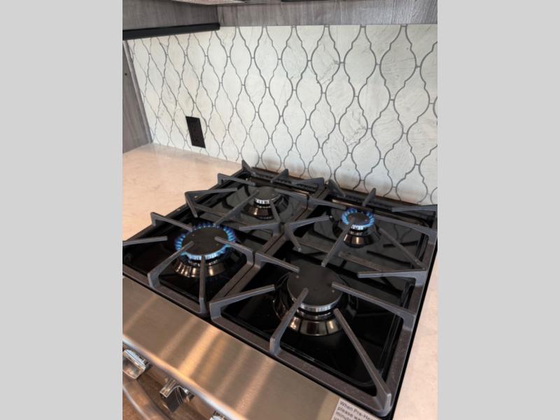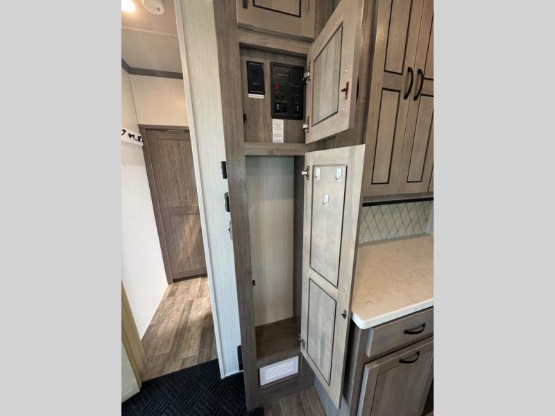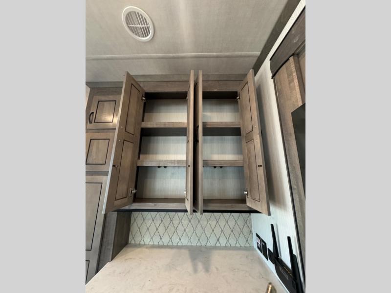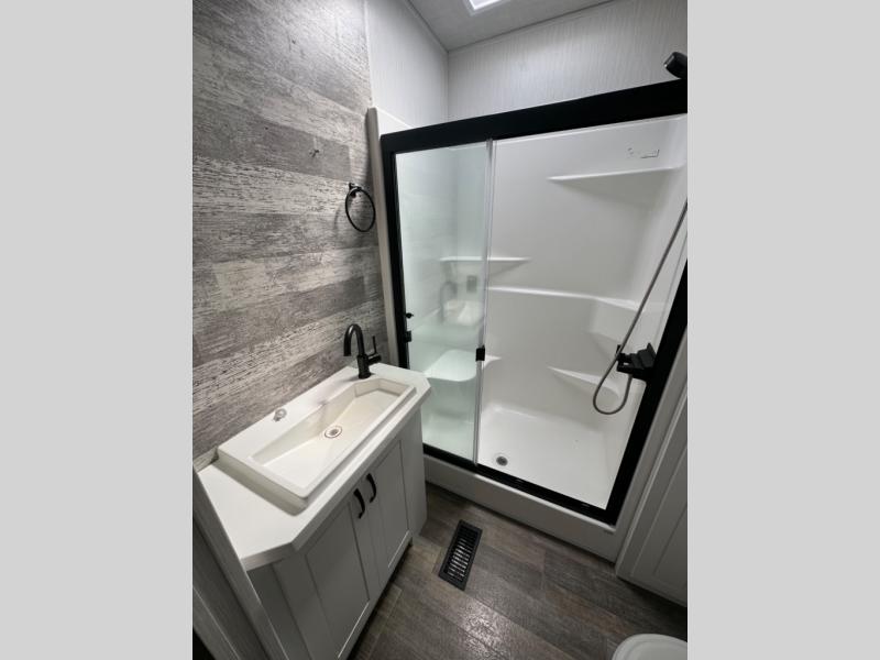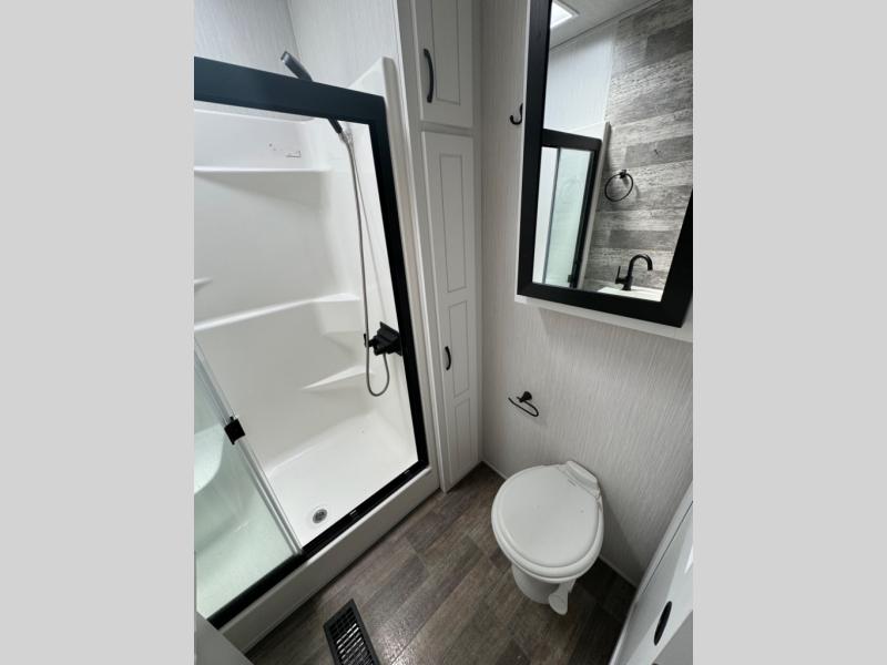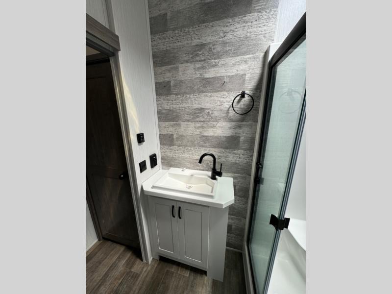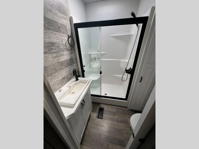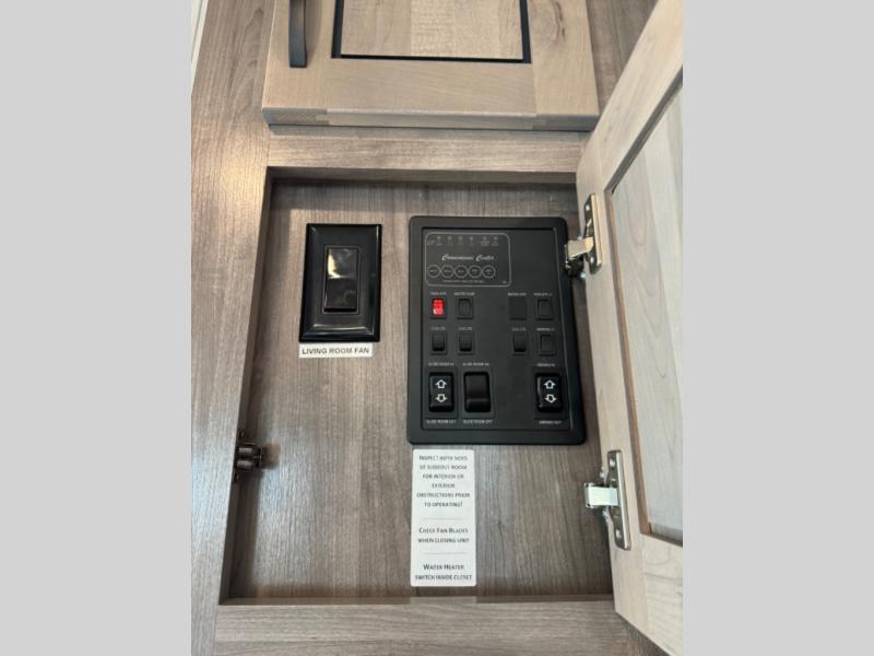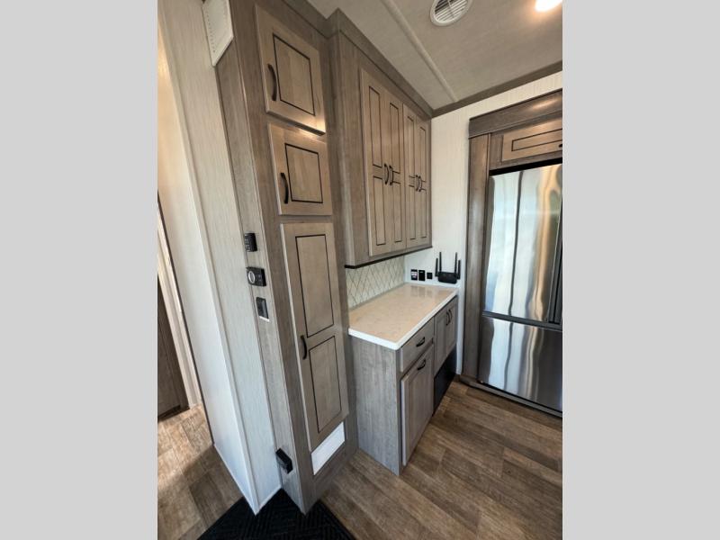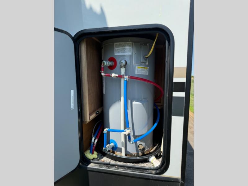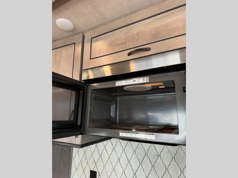 Your wait is over, this destination trailer is ready for your next stay! As you enter you will feel the comfort and spaciousness of the combined kitchen and living area with dual slide outs, and you can relax on the hide-a-bed sofa up front, the power theater seats or eat a snack at the free-standing dinette. You can enjoy the outdoors inside through the full view windows, and will have residential style throughout, plus full amenities in the kitchen. The rear master bedroom offers you a king bed slide, a dresser, a wardrobe and a closet prepped for a washer/dryer option as well as the second entry so you can get outside quickly to relax under the 18' electric awning. You will find so many more features to enjoy, plus there are several options you might like to add to enhance this already amazing destination trailer.