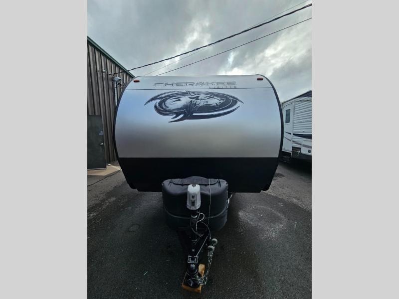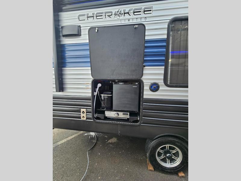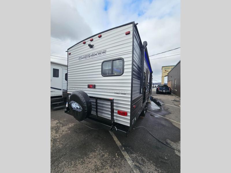 Fall in love with everything about this single-slide Cherokee travel trailer by Forest River. This model features a rear kitchen where you can easily prepare your favorite meals for your family. After you set up camp outside, come inside and relax on the sofa or booth dinette which can both be easily converted into additional sleeping space at night. The bathroom can be accessed from one of the two entry doors that lead into the main hallway and the master suite. Outside, enjoy the extra storage space with the pass-through storage, an outside kitchen, and an outside TV mount!