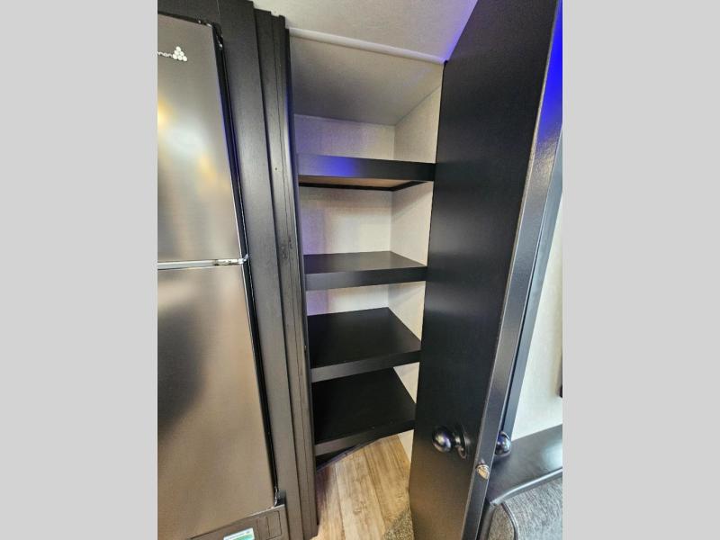 What I liked most: Doors have a bead board look to them adding character. Dark wood cabinetry with brushed nickel hardware looks classy. Two doors into bathroom. Lots of light from windows. Rear kitchen area has decent counter space. Full size pantry with actual hinged door. A travel trailer I could live in for a bit.
