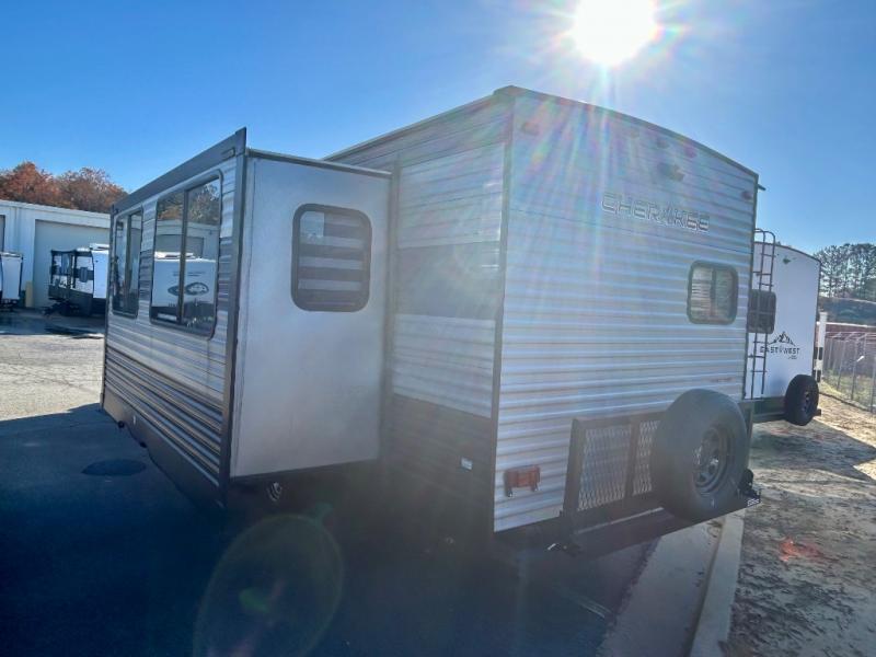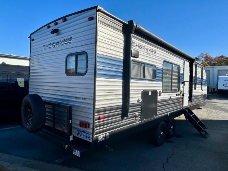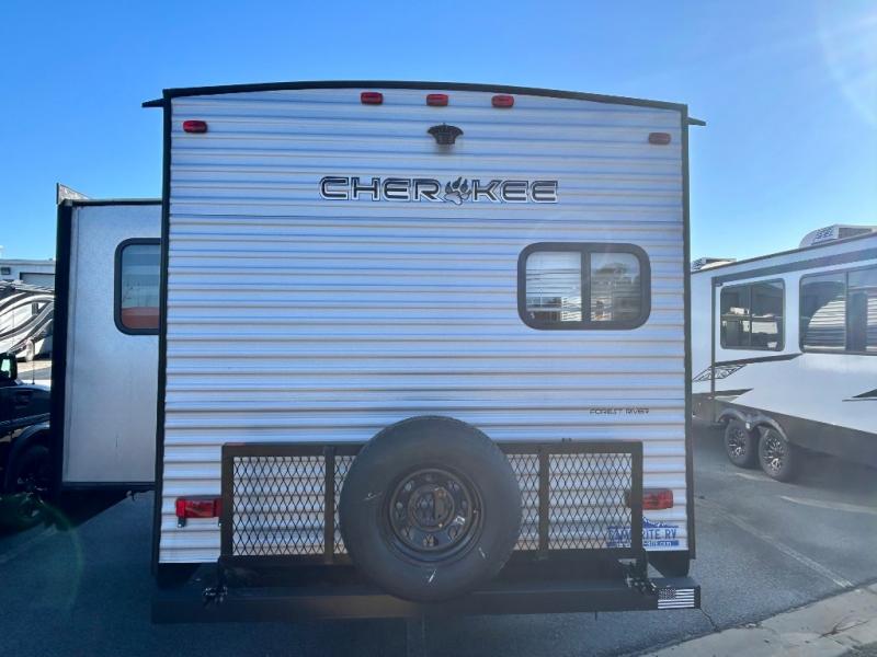 Fall in love with everything about this single-slide Cherokee travel trailer by Forest River. This model features a rear kitchen where you can easily prepare your favorite meals for your family. After you set up camp outside, come inside and relax on the sofa or booth dinette which can both be easily converted into additional sleeping space at night. The bathroom can be accessed from one of the two entry doors that lead into the main hallway and the master suite. Outside, enjoy the extra storage space with the pass-through storage, an outside kitchen, and an outside TV mount!