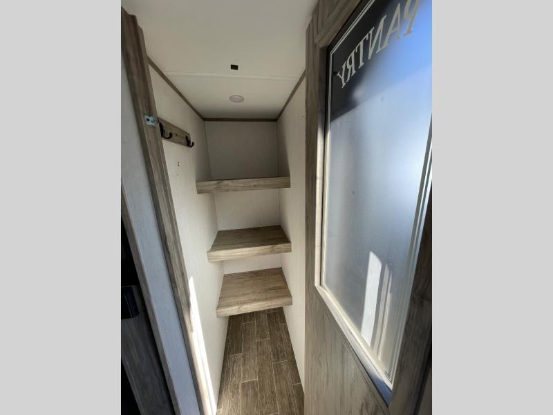 Looking for the perfect trailer for two with a spacious bathroom and bedroom? This Alpha Wolf provides a rear oversized bathroom complete with linen storage and a sliding door that saves space and looks great. The front bedroom includes a walk-around queen bed, dual wardrobes, a sliding door plus windows for natural lighting and great views. The main living and kitchen area is spacious as well with a large slide out that includes theater seating with a removable table across from the entertainment center with a fireplace, a 12V residential style refrigerator for lots of cold storage, and a pantry for your snacks and dry goods. You can decide to cook indoors on the three burner cooktop, or head outdoors to cook on the outside kitchen!
