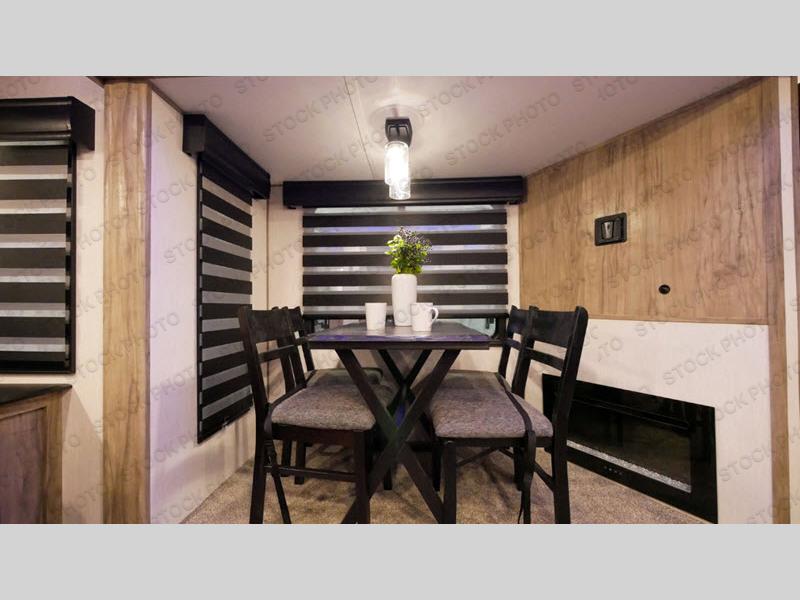 Inside, the rear living area features large panoramic windows, theater seating, and a booth dinette that converts for additional sleeping space. The entertainment center provides room for a TV and storage, making it easy to relax at the campsite.