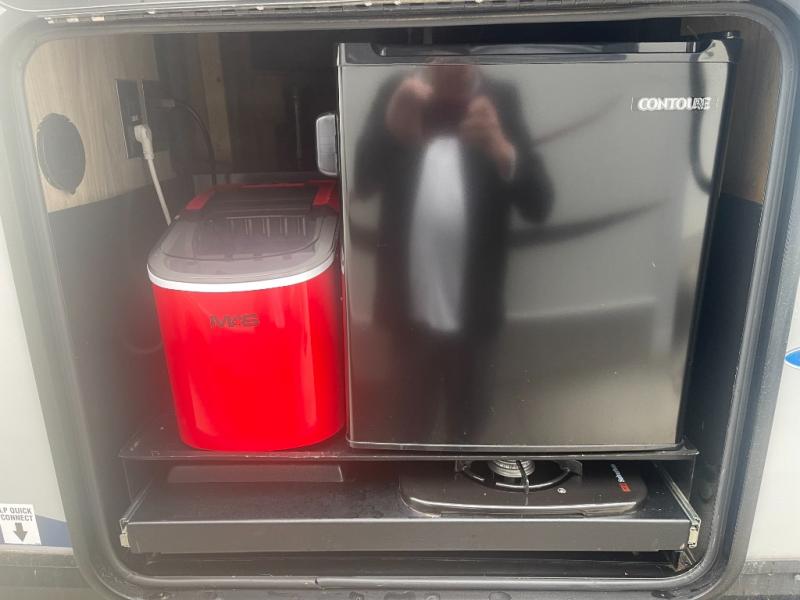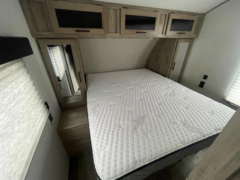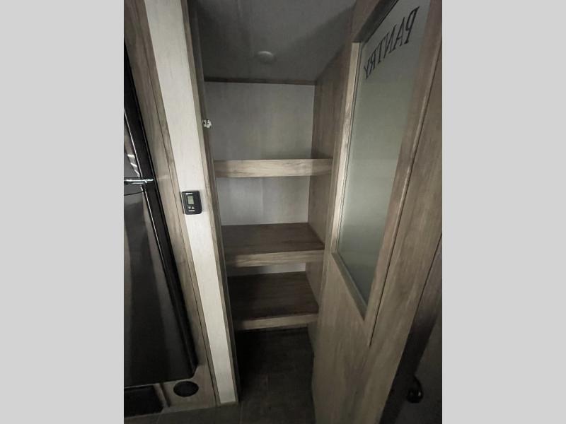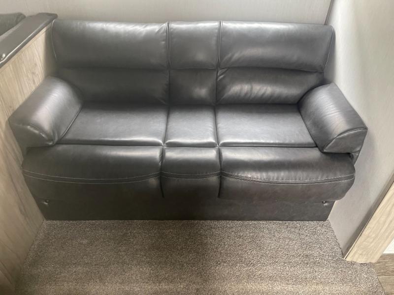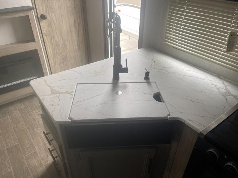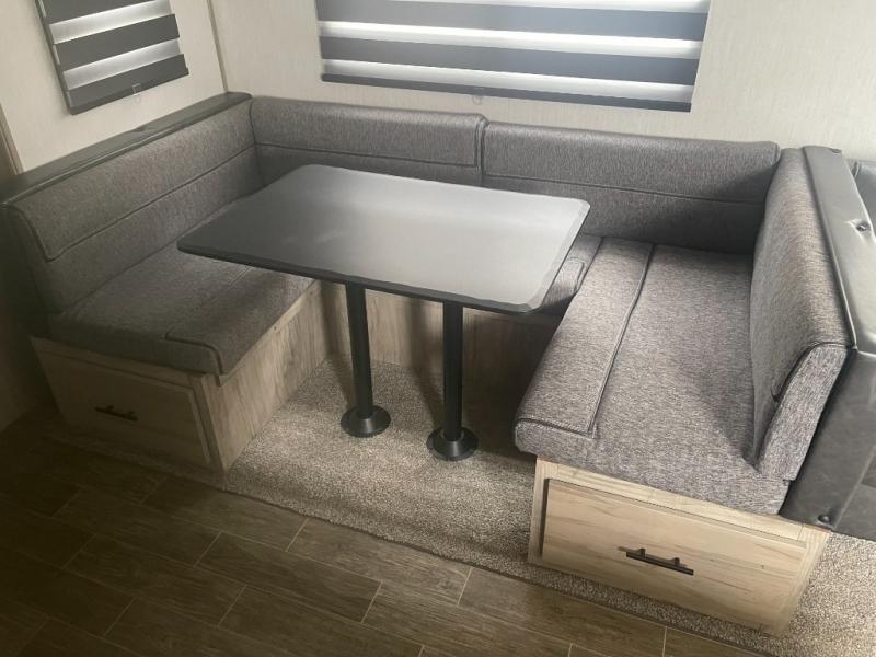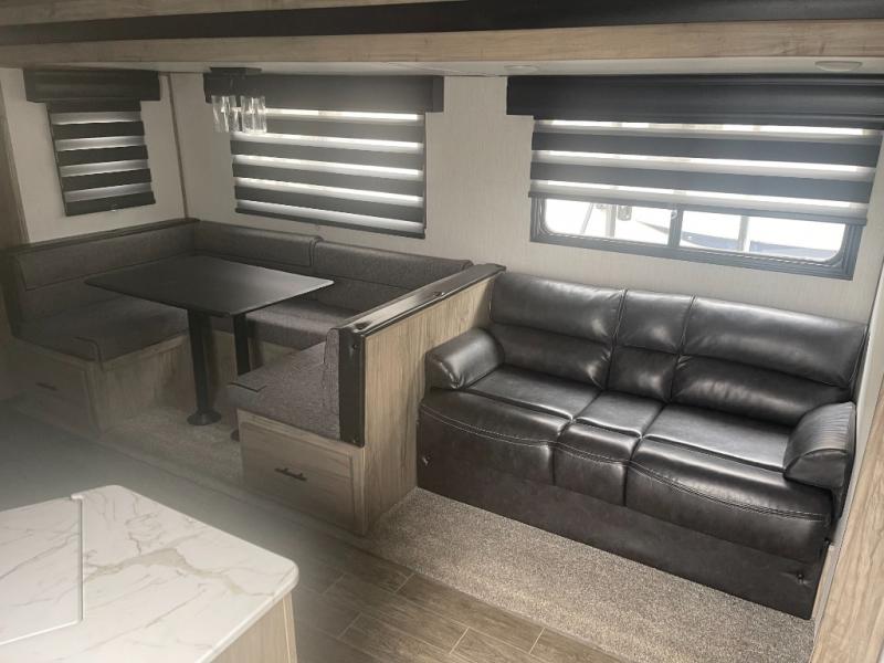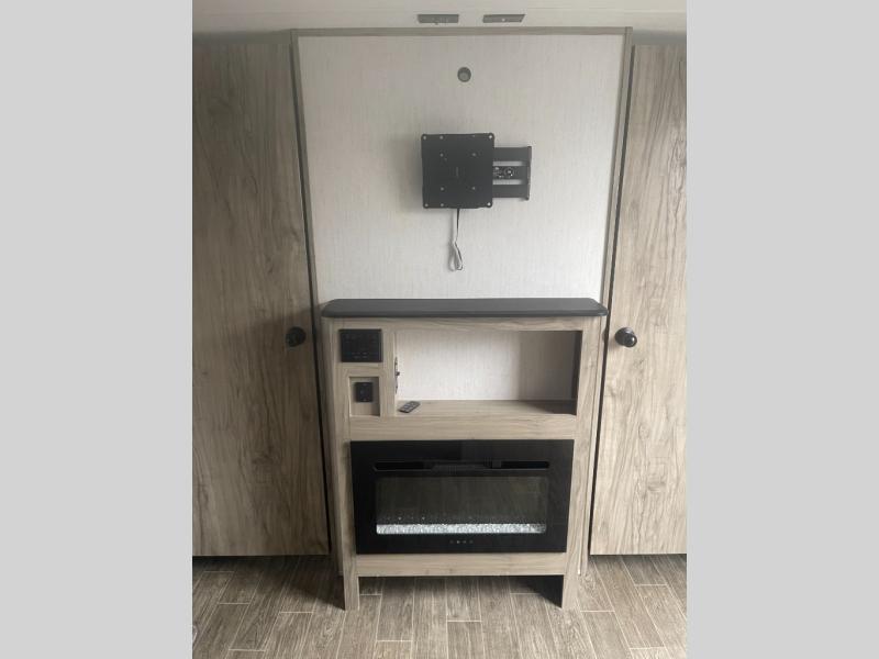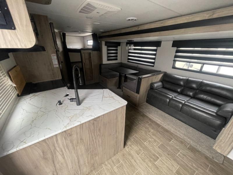 Spend your weekends with the whole family in the most popular multi-sleeper with this travel trailer! The dual entry doors make for a smooth flow of traffic in and out of the unit, plus one of the doors leads directly into the rear corner bathroom so you can get back to playing outdoors fast. The oversized U-shaped dinette is big enough for everyone to gather around at meal times and to play games. If mother nature is raining on your parade then you can relax on the jackknife sofa and enjoy the electric fireplace, just grab a snack from the large pantry and a drink from the 12V residential refrigerator.. If you're feeling brave then you can head outdoors and watch the rain poor down as you stay protected underneath the oversized 20' awning, plus there is a deluxe outside kitchen for you to cook while you watch the kids play when the sun is shining!