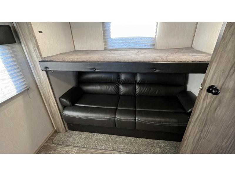 This is the first triple slide multi-sleeper travel trailer by Alpha Wolf! The rear bunkhouse has a flip up 28" x 72" bunk above the jackknife sofa with drawer storage below it and a 38" x 72" bunk above another storage area with an area prepped for a TV, plus access directly into the half bathroom which also has an entrance/exit door. The kitchen island will make meal prep a breeze and the booth dinette is a great place to enjoy your meals at, as well as play games and convert into an extra sleeping space. The jackknife sofa can also convert into an extra sleeping space when you're not relaxing on it while enjoying the fireplace. The walk-through bathroom includes a radius shower and a linen closet to store your towels, and leads directly into the front private bedroom. You will enjoy a good night's rest each night on the queen bed and keep your clothes looking their best in either one of the shirt closets!