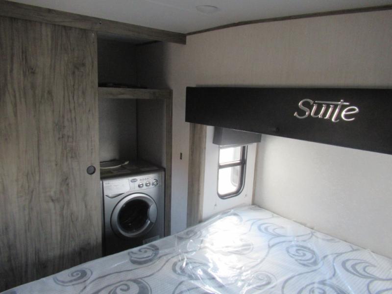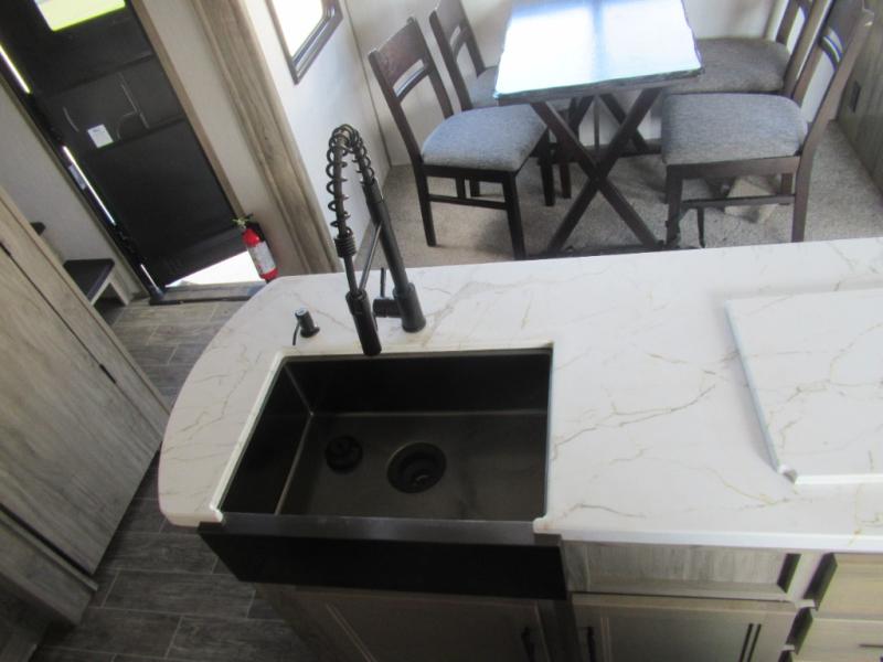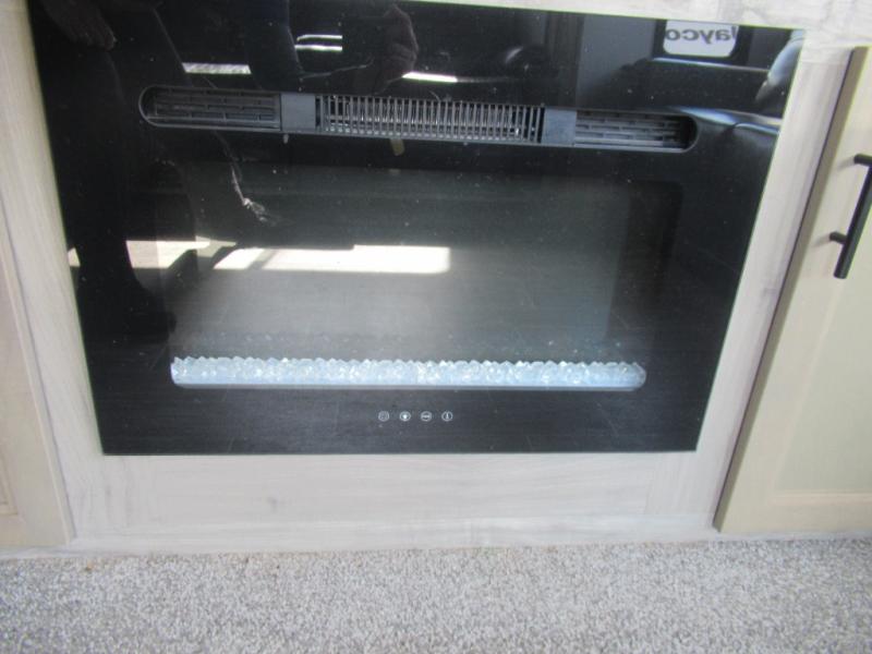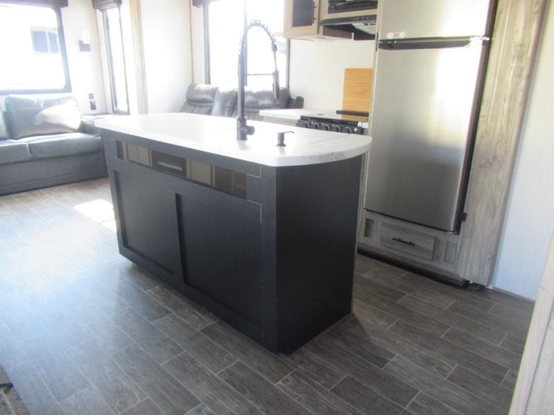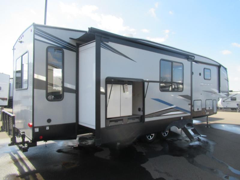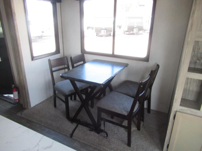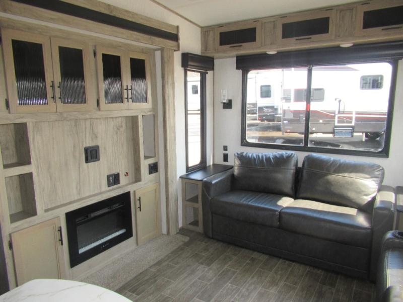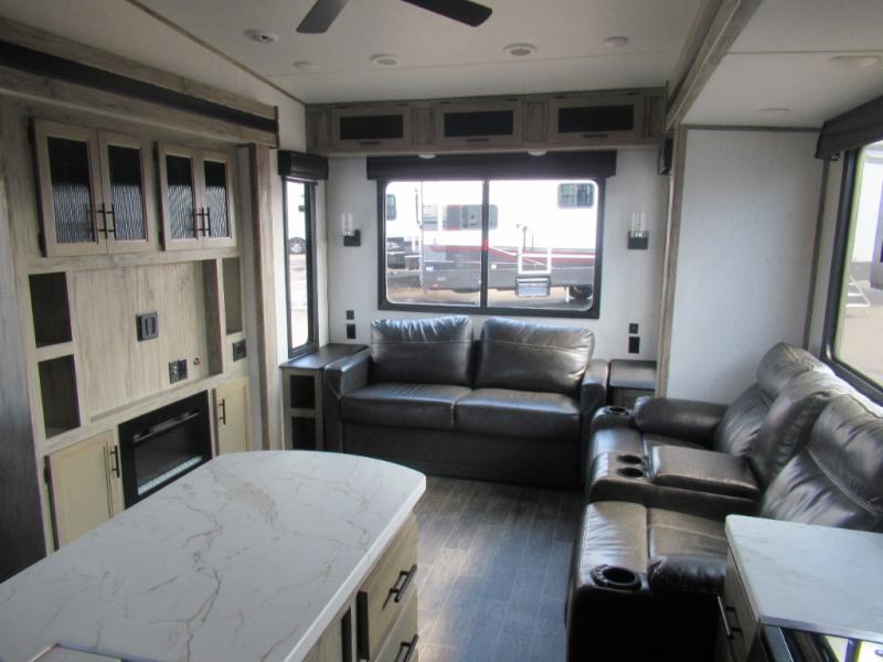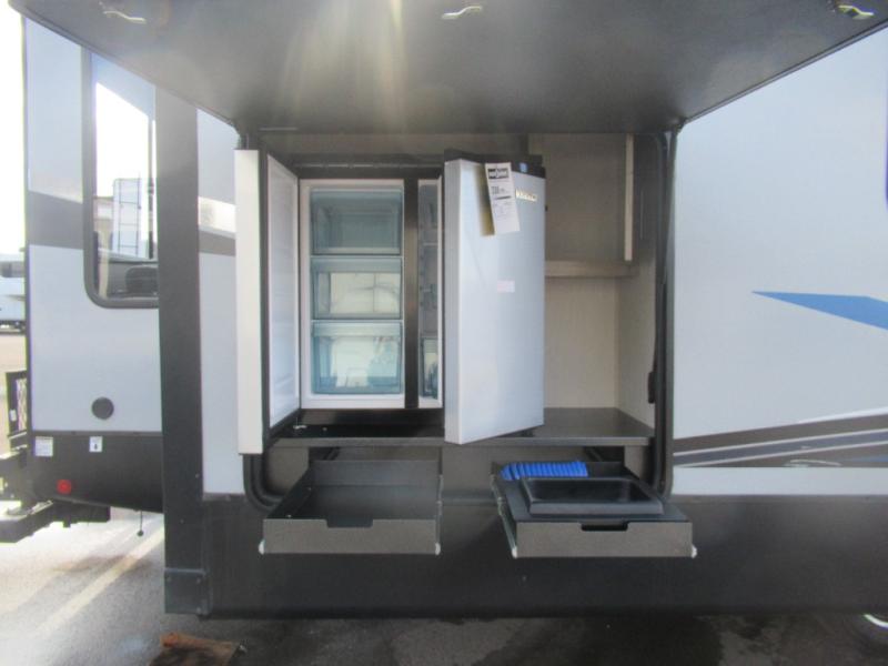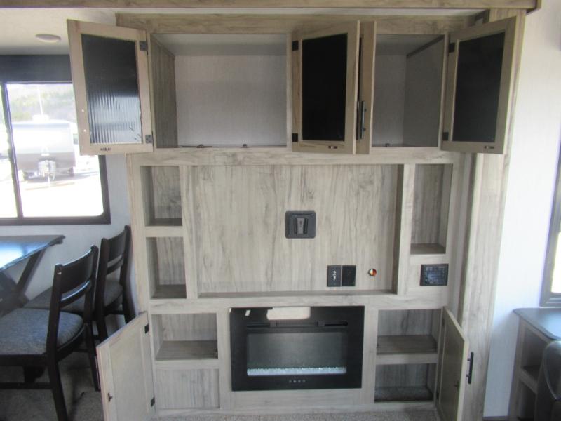 Step inside the most popular couples coach with this fifth wheel! You won't even feel like you're at the campground when you're relaxing at the home theatre seating while enjoying a heated massage in front of the fireplace. The stylish free-standing table has four seats with a panoramic rear window to view the lake while you play a few card games, just brew your favorite cup of coffee at the coffee bar and you're all set to have a good time. You can also have a fun time underneath the 15' awning with a cold beverage from the residential refrigerator at the outside kitchen. Enjoy a good night's rest each night on the king bed inside the front private bedroom, and keep your clothes looking their best with the front wall wardrobe with shelves, and if you choose to add the optional washer and dryer you can extend your trips with clean clothes!