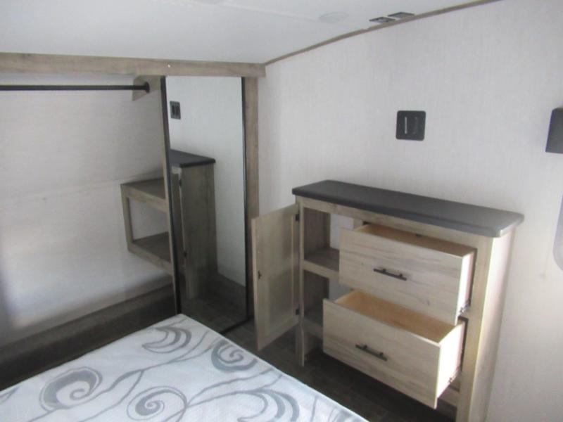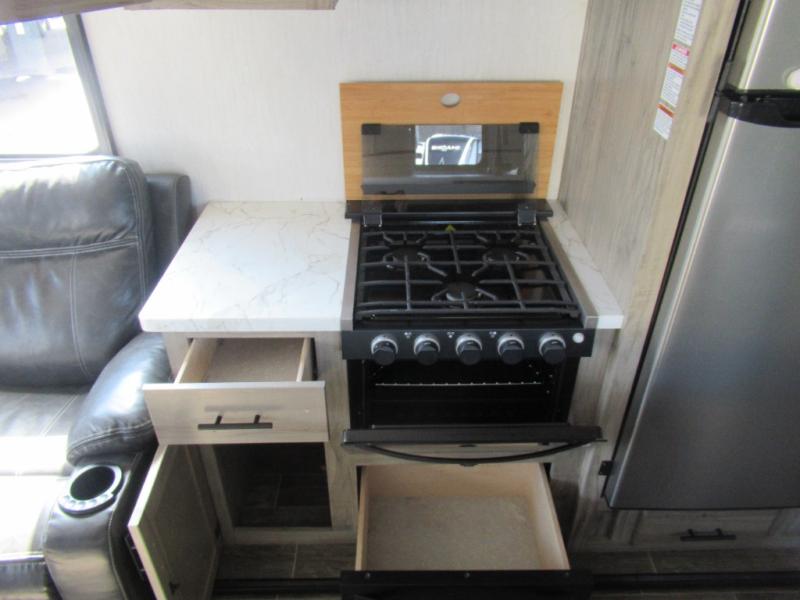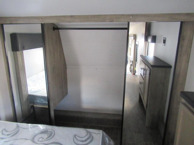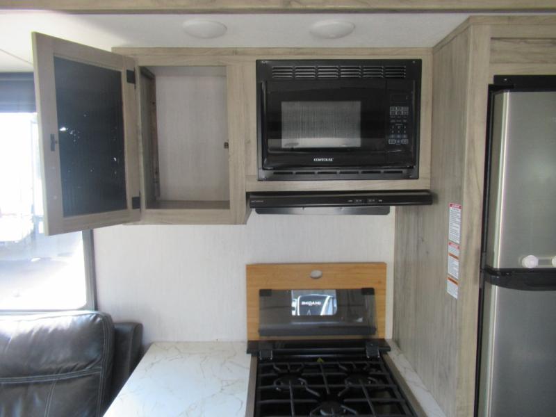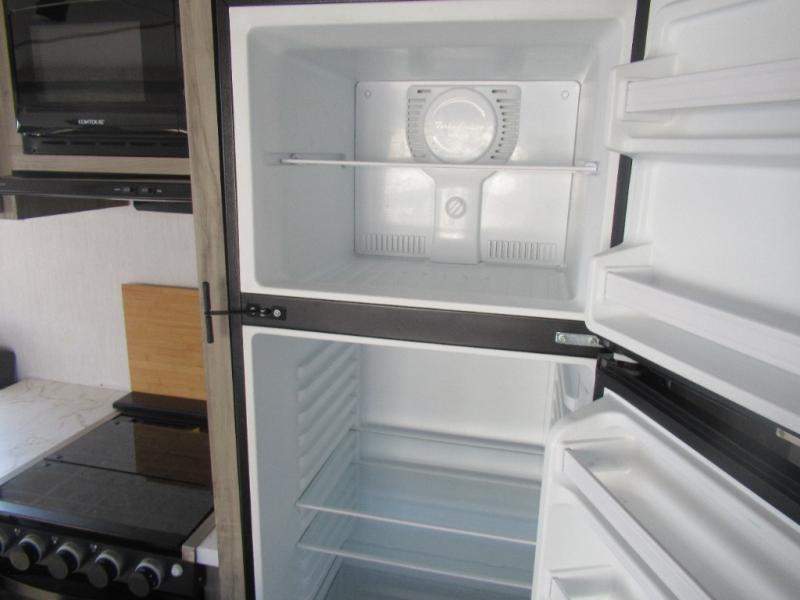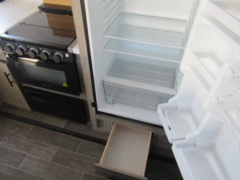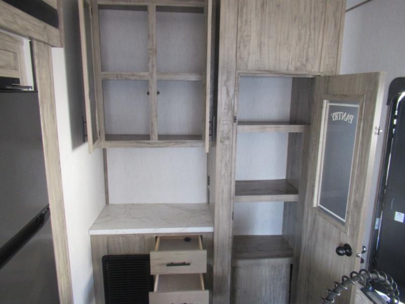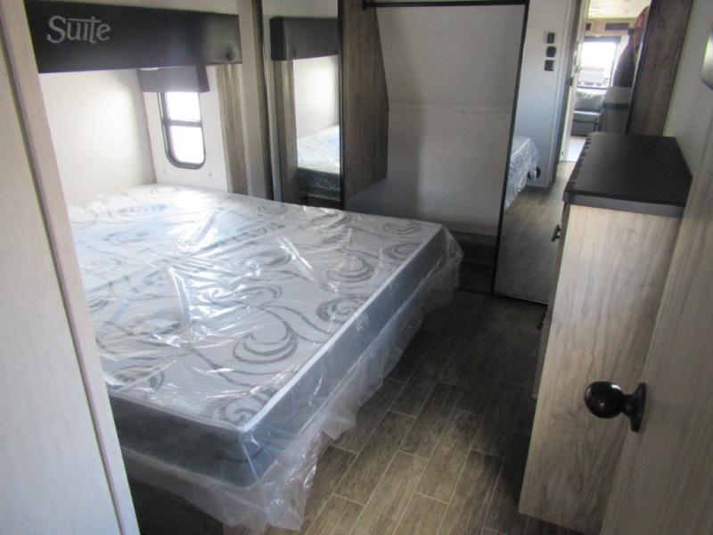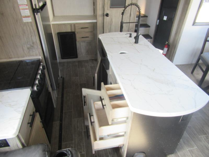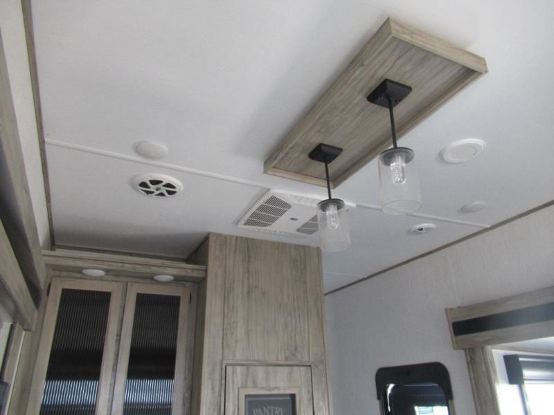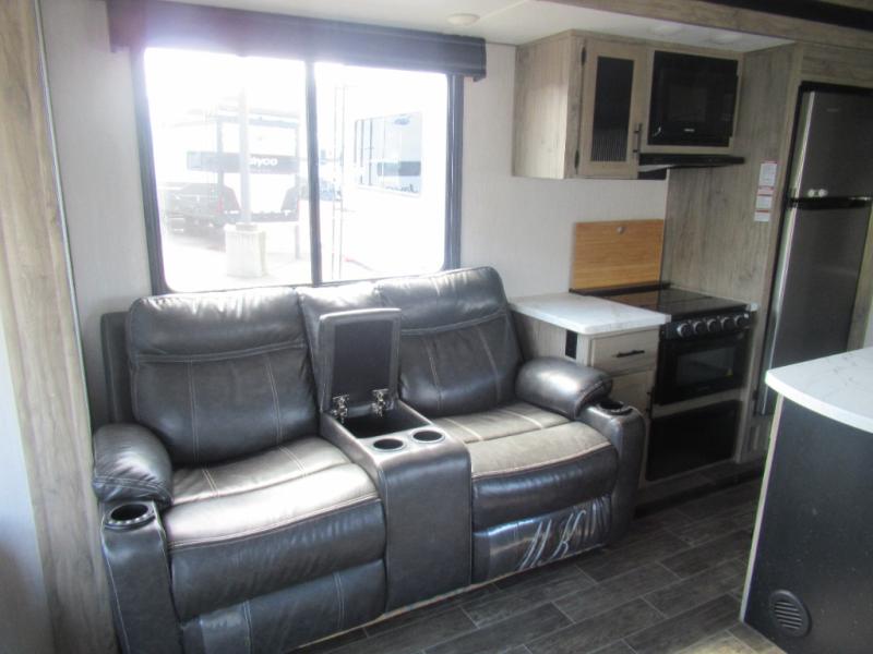 Step inside the most popular couples coach with this fifth wheel! You won't even feel like you're at the campground when you're relaxing at the home theatre seating while enjoying a heated massage in front of the fireplace. The stylish free-standing table has four seats with a panoramic rear window to view the lake while you play a few card games, just brew your favorite cup of coffee at the coffee bar and you're all set to have a good time. You can also have a fun time underneath the 15' awning with a cold beverage from the residential refrigerator at the outside kitchen. Enjoy a good night's rest each night on the king bed inside the front private bedroom, and keep your clothes looking their best with the front wall wardrobe with shelves, and if you choose to add the optional washer and dryer you can extend your trips with clean clothes!