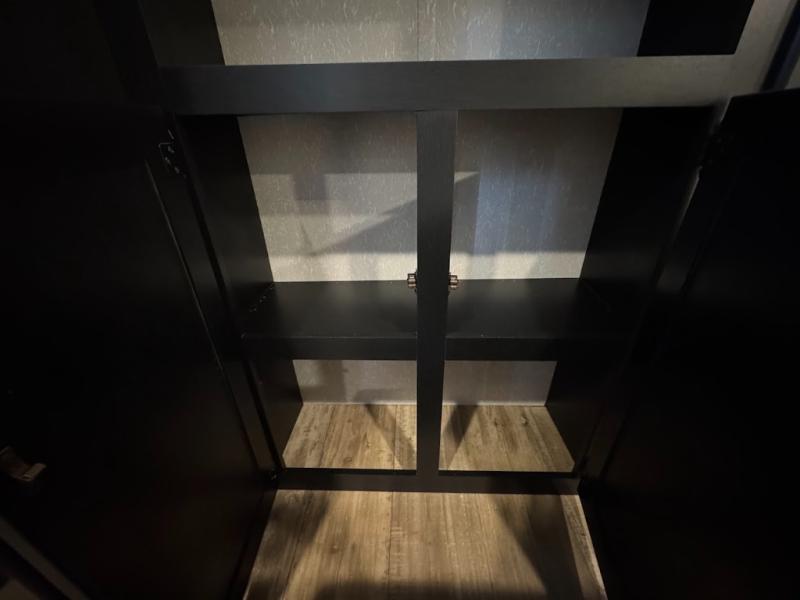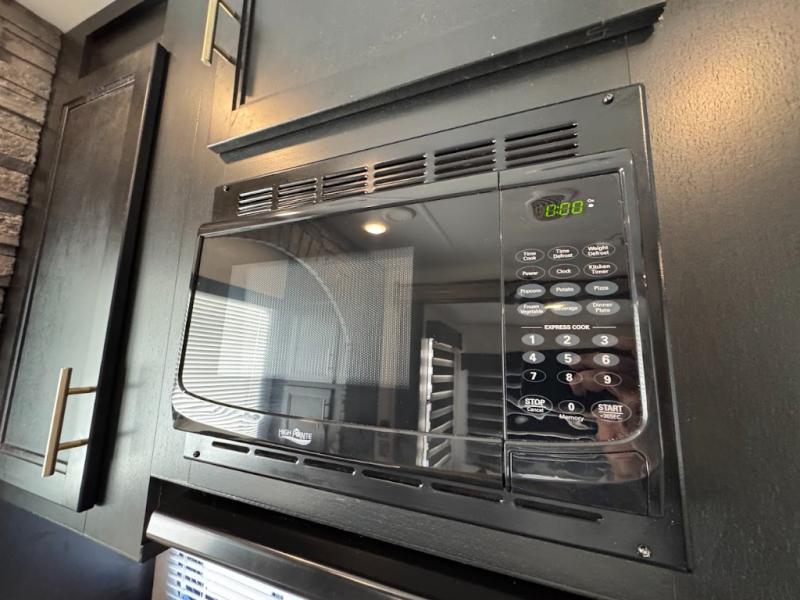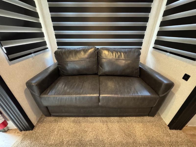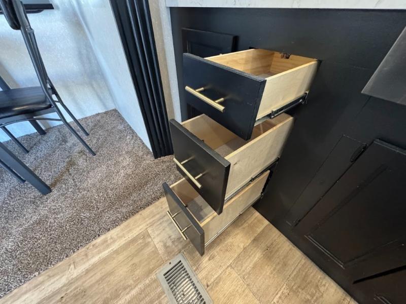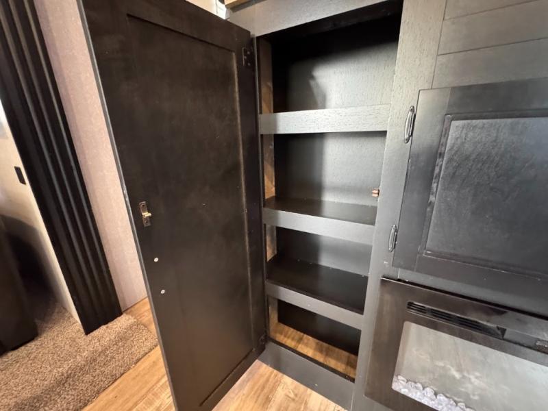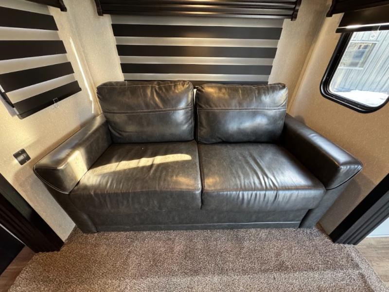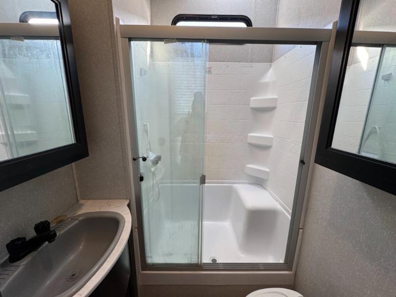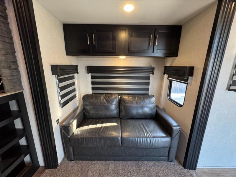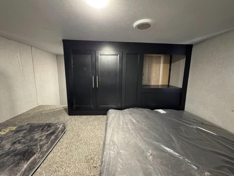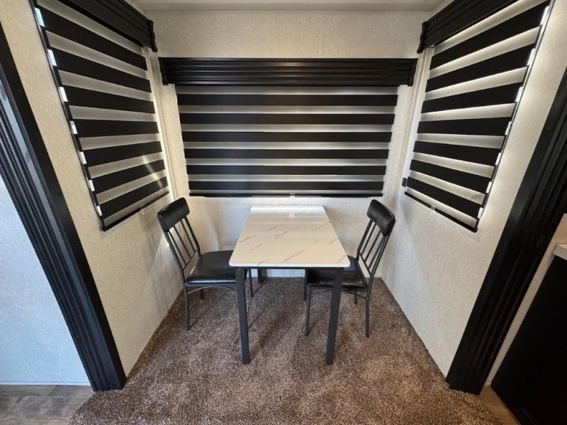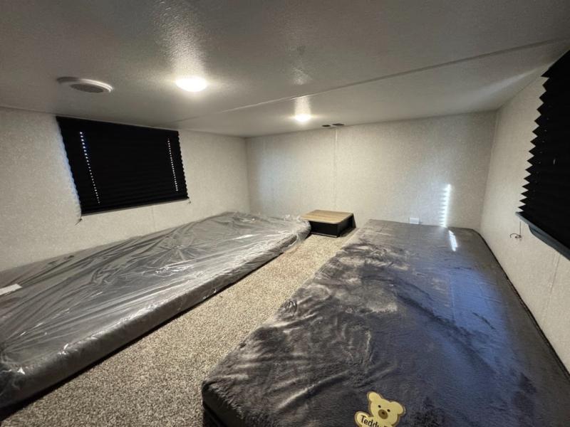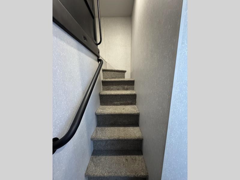 This separate kitchen offers ample counter space, a breakfast bar with two stools, a great view of your place out of the front window, and a free-standing dinette with more windows. After eating a meal together everyone can relax in the separate living area with dual opposing slide outs with hide-a-bed sofas plus there are two overstuffed recliners to watch a show on the massive flat screen TV. Take turns getting ready for bed in the full bathroom, and the kids will quickly head up stairs to the loft with two mats and storage while you retire to your spacious rear bedroom with a queen bed and your own storage.