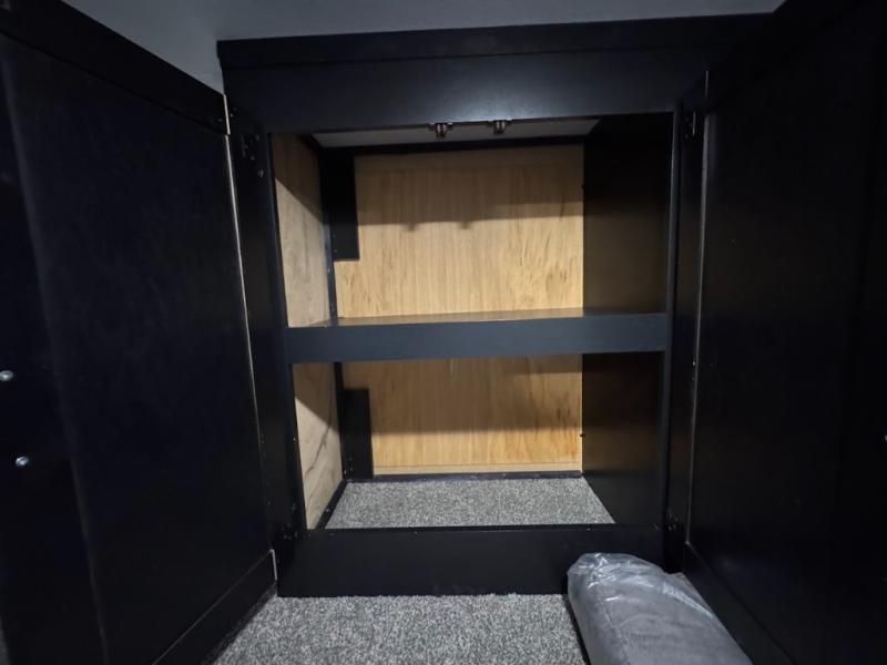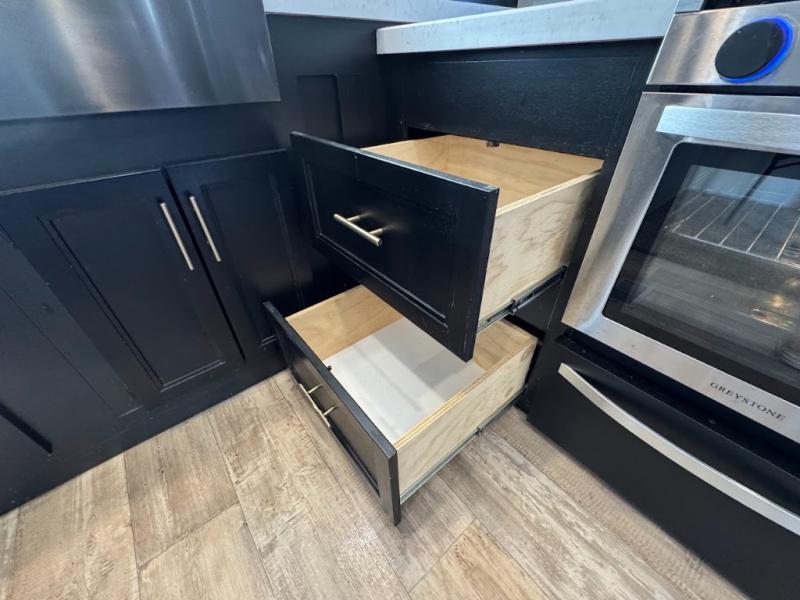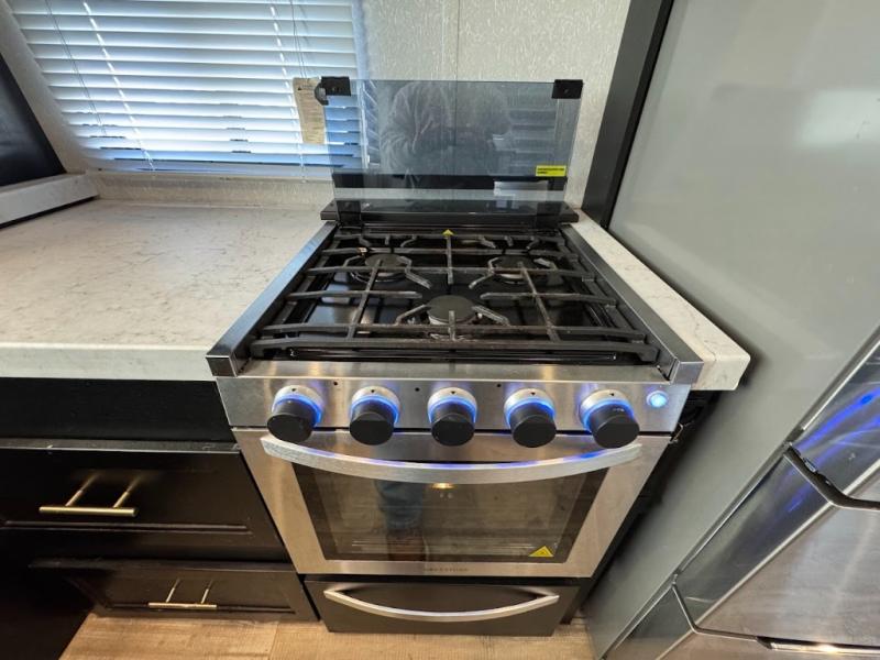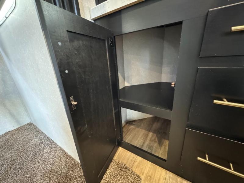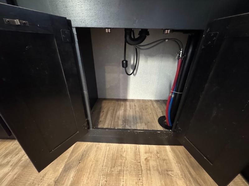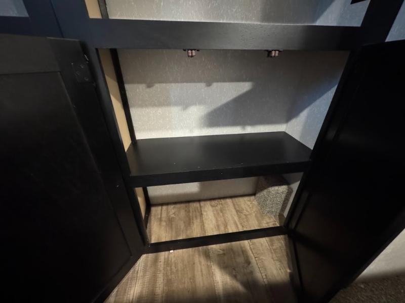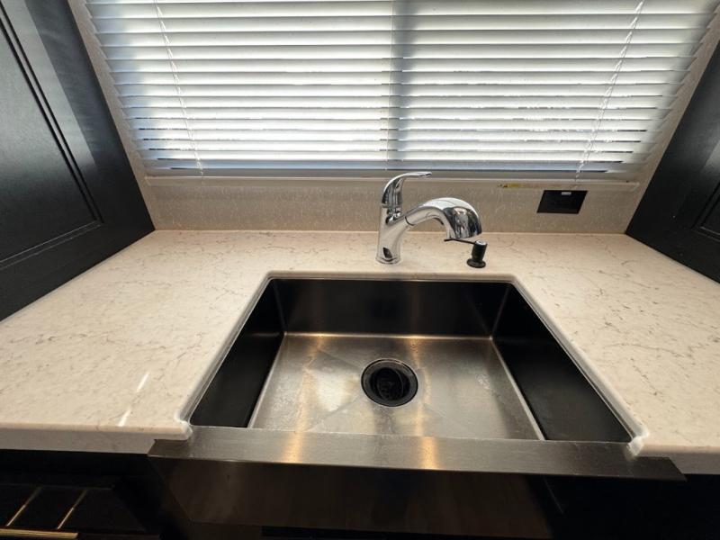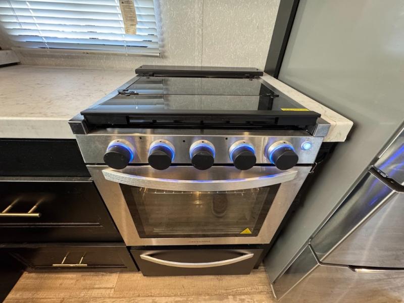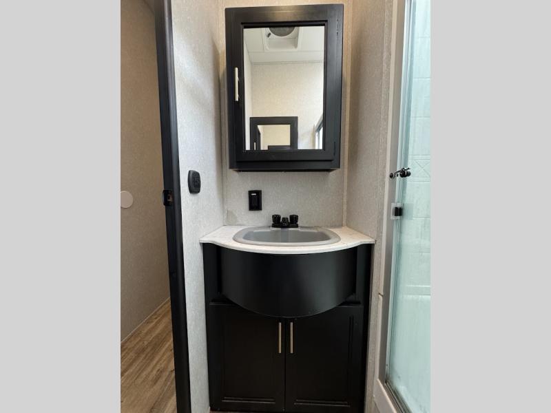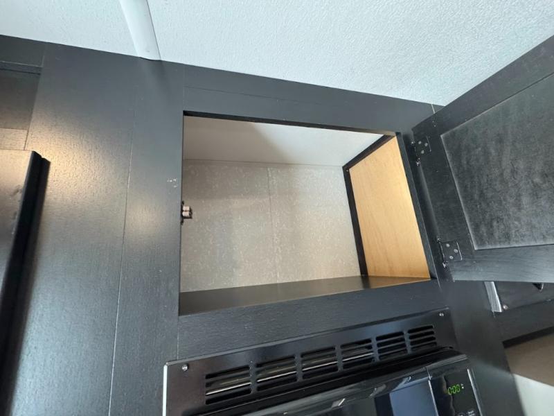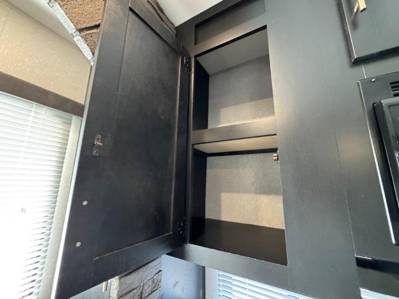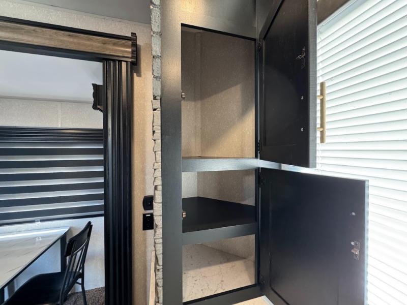 This separate kitchen offers ample counter space, a breakfast bar with two stools, a great view of your place out of the front window, and a free-standing dinette with more windows. After eating a meal together everyone can relax in the separate living area with dual opposing slide outs with hide-a-bed sofas plus there are two overstuffed recliners to watch a show on the massive flat screen TV. Take turns getting ready for bed in the full bathroom, and the kids will quickly head up stairs to the loft with two mats and storage while you retire to your spacious rear bedroom with a queen bed and your own storage.