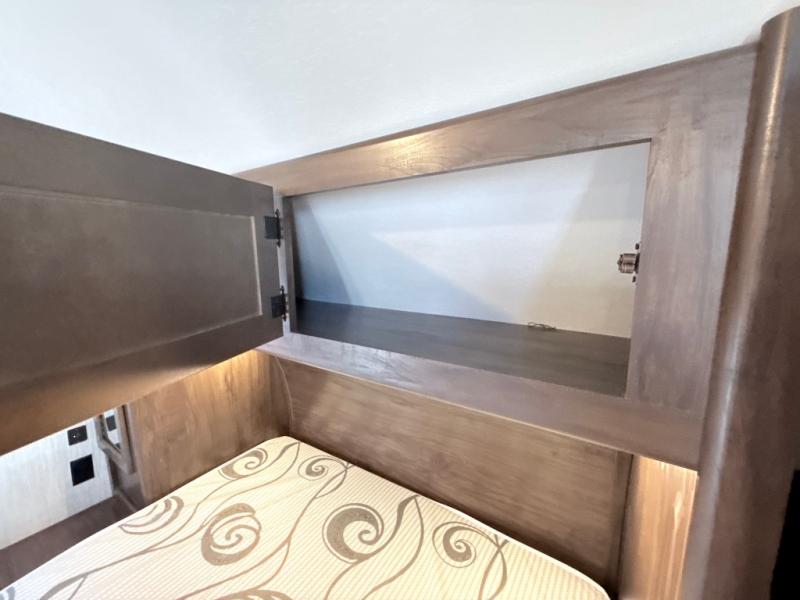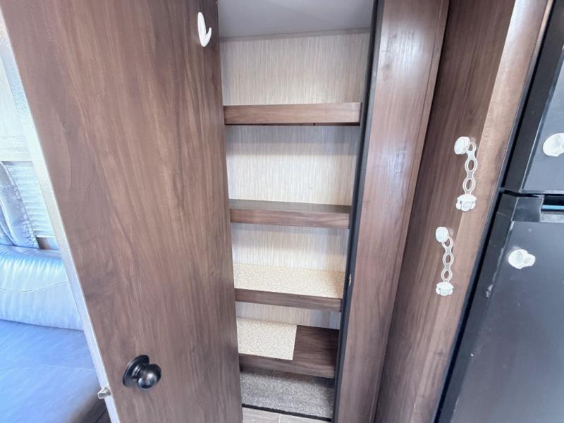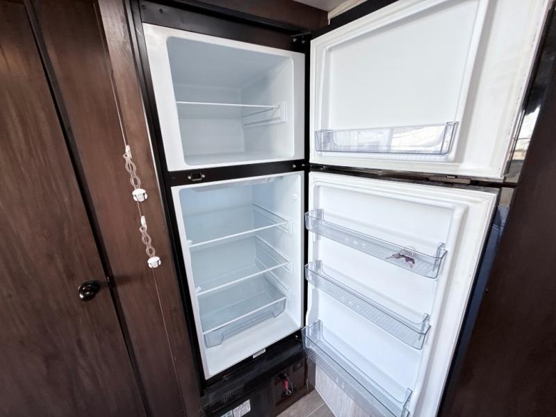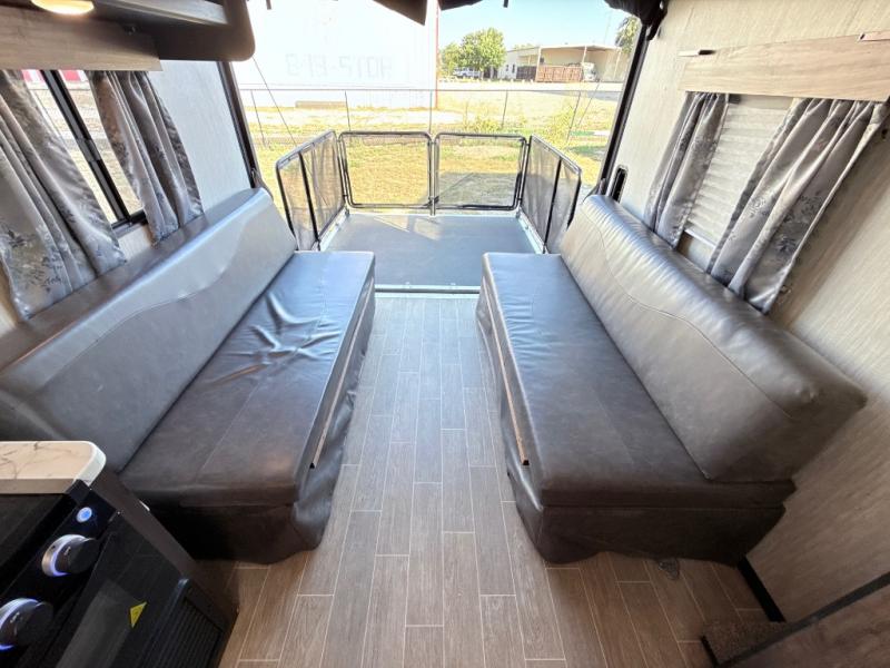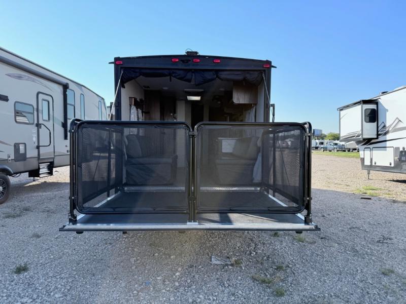 You will love this Cherokee Grey Wolf toy hauler with a rear ramp door for loading and unloading your toys and gear. If you position the fold-down sofas up against the wall, you will have even more room for extra gear when you are moving down the road. Set up camp and easily create a great dining area with the table between each fold-down sofa. You can also create your best meals in a breeze with either the three-burner cooktop or the oven, plus there is a microwave for those quick meals. A large pantry allows you to pack all of the snacks and canned goods you need for your adventure. You will appreciate the master suite up front for a great night's rest on the queen bed along with easy access into the dual-entry bath.