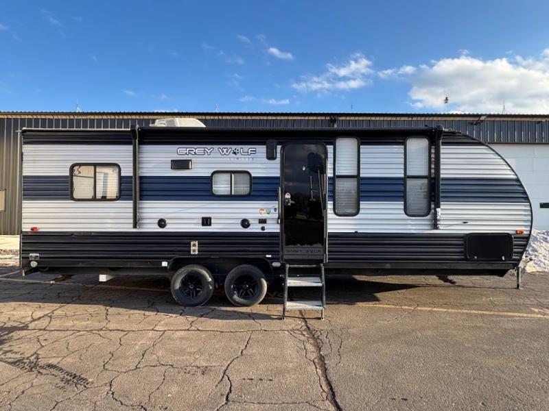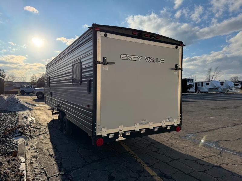 Whether it's a journey that will take you to new locations or a tried-and-true getaway to that favorite and memorable destination, the Forest River Cherokee Grey Wolf travel trailers and toy haulers are going to make the trip worth it every single time! You can travel in confidence with the premium wheel package, seamless roofing membrane with heat reflectivity, Power Gear frame technology with space-saver rail design, and Cherokee back-up camera system. The Cherokee Grey Wolf's interior is highly attractive with its stainless steel kitchen suite package, premium bedding ensemble and comforter, and 8" ceiling-mounted subwoofer with accent lighting. You will also find a black waste tank flush-out kit, an outside shower with hot and cold water, an armored underbelly tank enclosure, a power tongue jack, and an RV grill quick connect.