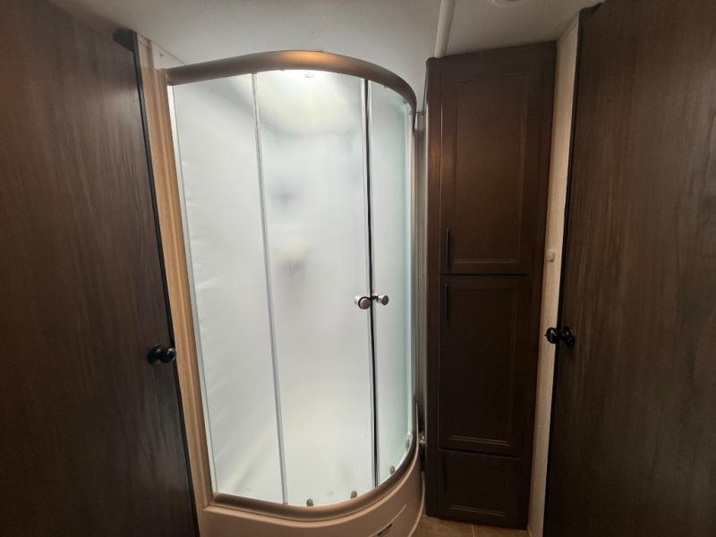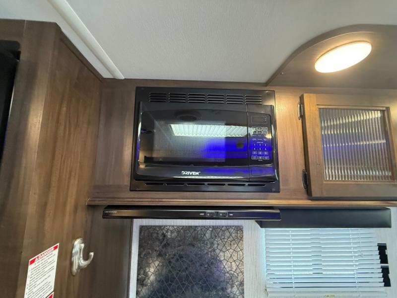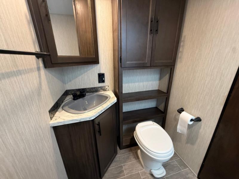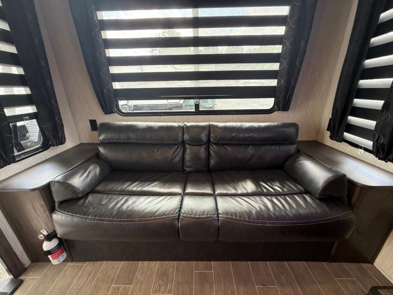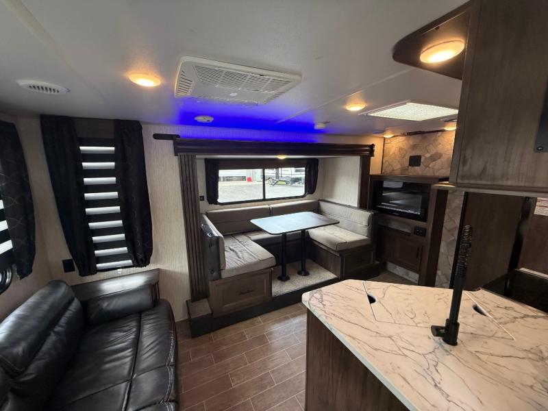 This Cherokee Grey Wolf travel trailer is perfect for your small family and will leave you planning your next outing before you are back from your current weekend away! You will find all of the comforts you need with plenty of livable space including a U-shaped dinette slide. There is also a sofa for more seating when company arrives, and there are end tables on either side to prevent spills. A spacious walk-through bath leads to a front private bedroom where you will enjoy a great night's rest on a comfortable queen-size bed. You will find ample storage for clothing in the wardrobes that are above handy nightstands for your personal things. There are even lights mounted above the bed on each side which makes it easy to read a couple of chapters before drifting off to sleep.