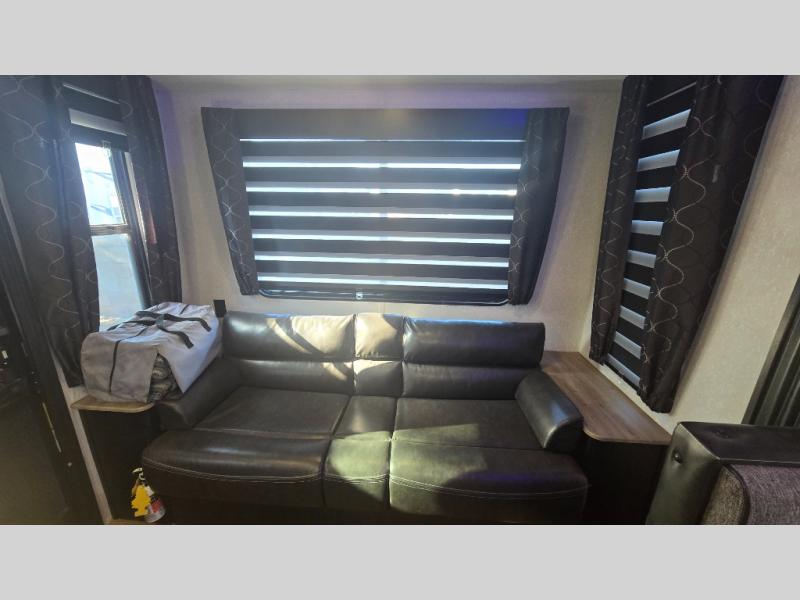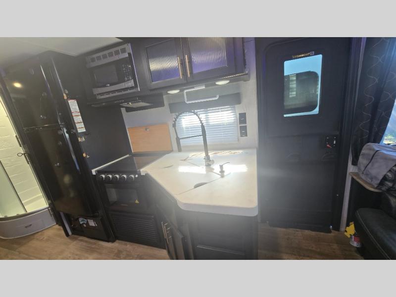 This Cherokee Grey Wolf travel trailer is perfect for your small family and will leave you planning your next outing before you are back from your current weekend away! You will find all of the comforts you need with plenty of livable space including a U-shaped dinette slide. There is also a sofa for more seating when company arrives, plus there are end tables on either side to prevent spills. A spacious walk-through bath leads to a front private bedroom where you will enjoy a great night's rest on a comfortable queen-size bed. You will find ample storage for clothing in the wardrobes that are above handy nightstands for your personal things. There are even lights mounted above the bed on each side which makes it easy to read a couple of chapters before drifting off to sleep.