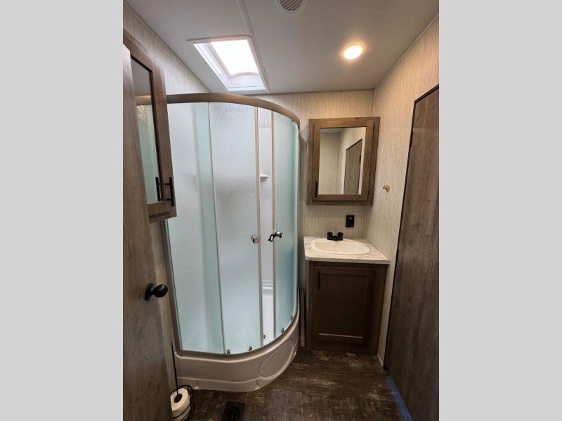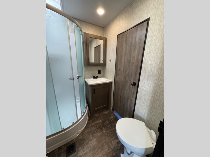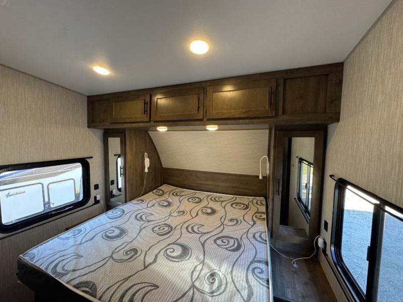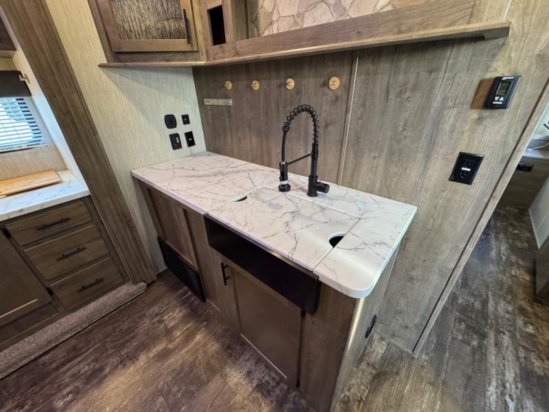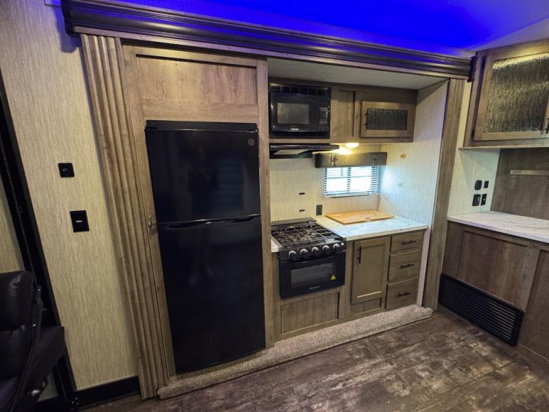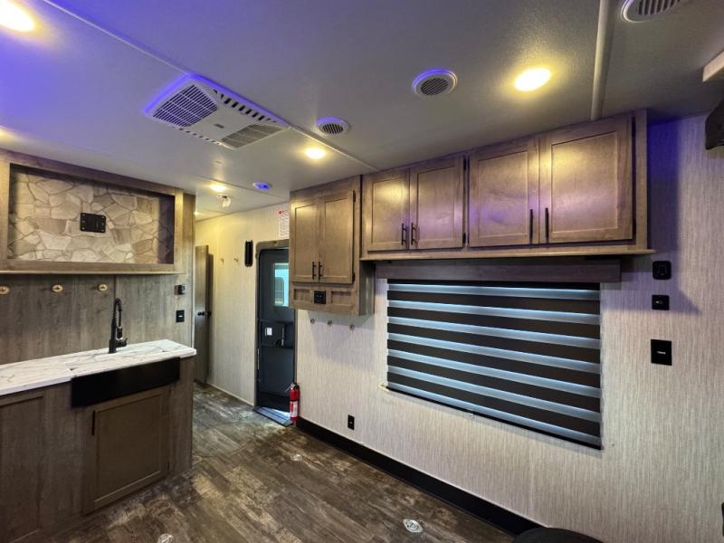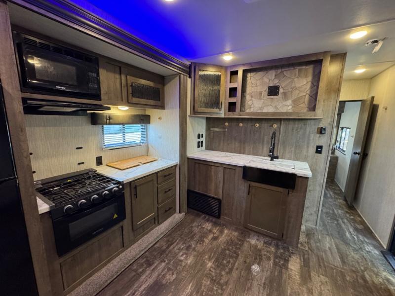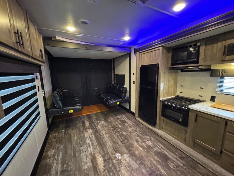 The versatile Cherokee Wolf Pack toy haulers are ready for all your excursions! Each model includes a true high gloss gel coat, a 102" wide body design, and a forced air heated underbelly and enclosed holding tanks so you can camp year around. You will enjoy hassle-free features such as, the in cab tire pressure monitor system, the Happijac bed lift system, and the 100 gallon fresh water capacity. Each model includes a shower skylight, LED interior/exterior lights, Zebra shades in the living area, and a black stainless steel farm sink for that added touch-of-home. The fifth wheels include stabilizer jacks, a second 15K A/C unit in the bedroom, and 50 Amp service. You will appreciate 30 Amp service in the travel trailers, a power tongue jack, and ramp door cables. These toy haulers also include USB charging stations to keep all your gadgets charged and ready to go, premium Teddy Bear bunk mats for comfortability, and a reverse activated light and backup camera for easy loading and unloading!