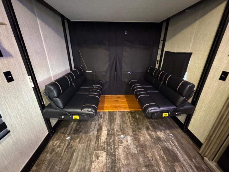 Camping with your favorite ride-on toys just got a whole lot easier in this toy hauler travel trailer. Once your toys are unloaded from the 15' garage, enjoy a cold drink at the removable dinette table before heading out on a trail. The radius shower in the dual entry bath will allow you to clean up once you return, and you'll find all the kitchen appliances needed to prepare dinner after your shower. The kids will find sleeping space on the two sofa beds, and the Happijac power bed above, while you and your spouse enjoy the Wolf Pack king bed in the front master bedroom!