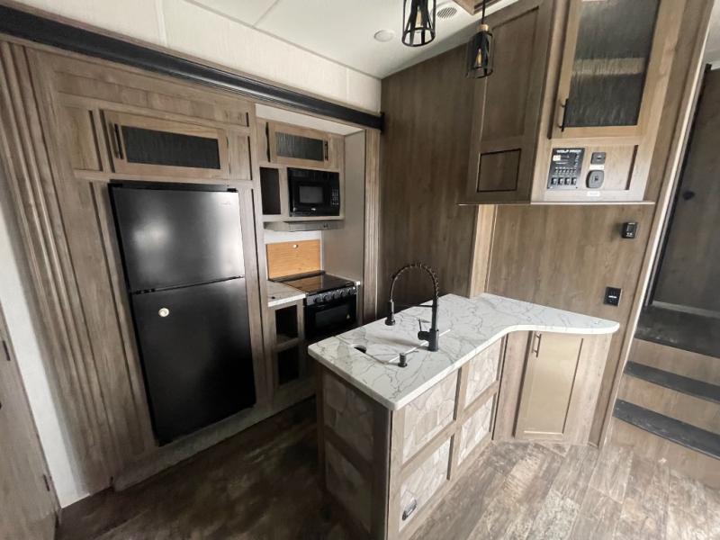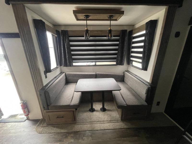 The versatile Cherokee Wolf Pack toy haulers are ready for all your excursions! Each model includes a true high gloss gel coat, a 102" wide body design, and a forced air heated underbelly and enclosed holding tanks so you can camp year around. You will enjoy hassle-free features such as, the in cab tire pressure monitor system, the Happijac bed lift system, and the 100 gallon fresh water capacity. Each model includes a shower skylight, LED interior/exterior lights, Zebra shades in the living area, and a black stainless steel farm sink for that added touch-of-home. The fifth wheels include stabilizer jacks, a second 15K A/C unit in the bedroom, and 50 Amp service. You will appreciate 30 Amp service in the travel trailers, a power tongue jack, and ramp door cables. These toy haulers also include USB charging stations to keep all your gadgets charged and ready to go, premium Teddy Bear bunk mats for comfortability, and a reverse activated light and backup camera for easy loading and unloading!