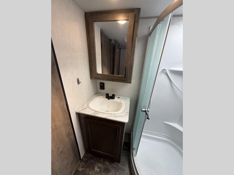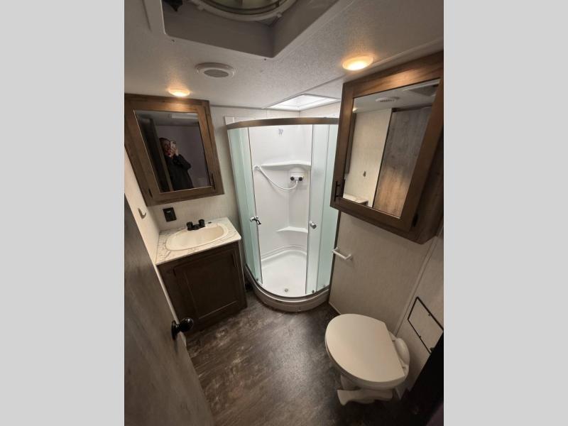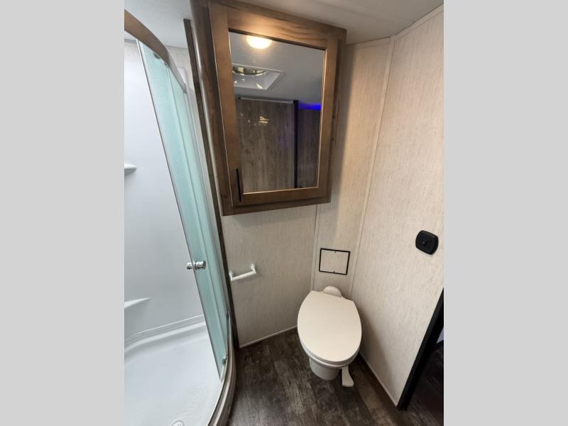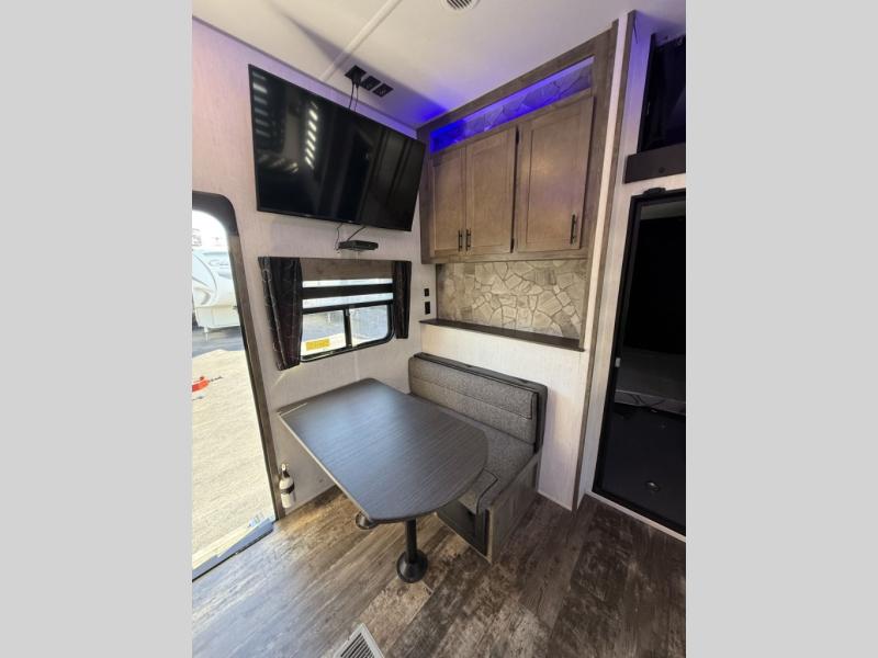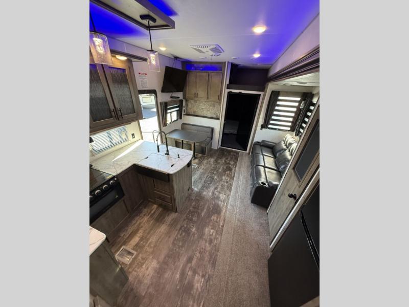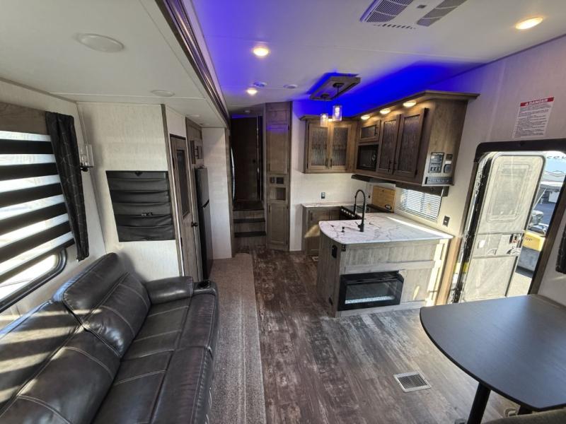 The versatile Cherokee Wolf Pack toy haulers are ready for all your excursions! Each model includes a true high gloss gel coat, a 102" wide body design, and a forced air heated underbelly and enclosed holding tanks so you can camp year around. You will enjoy hassle-free features such as, the in cab tire pressure monitor system, the Happijac bed lift system, and the 100 gallon fresh water capacity. Each model includes a shower skylight, LED interior/exterior lights, Zebra shades in the living area, and a black stainless steel farm sink for that added touch-of-home. The fifth wheels include stabilizer jacks, a second 15K A/C unit in the bedroom, and 50 Amp service. You will appreciate 30 Amp service in the travel trailers, a power tongue jack, and ramp door cables. These toy haulers also include USB charging stations to keep all your gadgets charged and ready to go, premium Teddy Bear bunk mats for comfortability, and a reverse activated light and backup camera for easy loading and unloading!