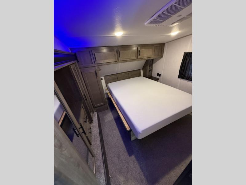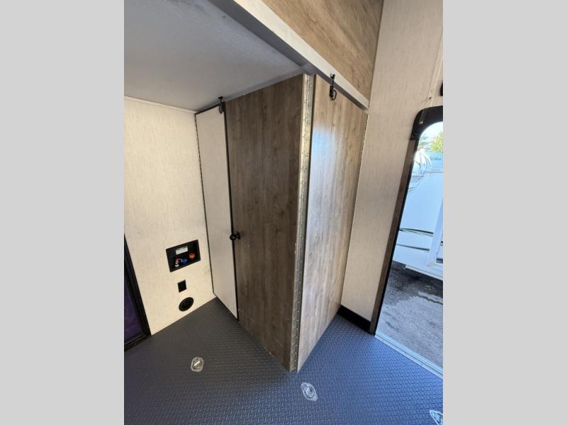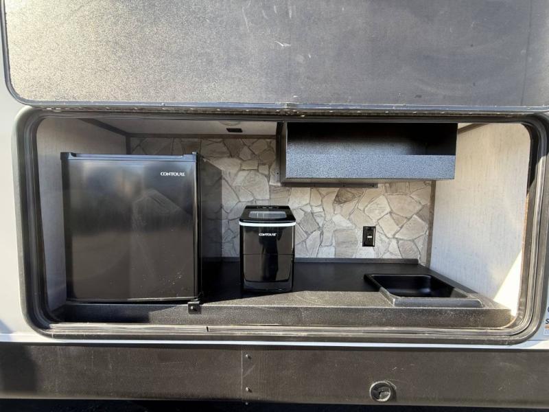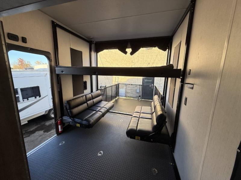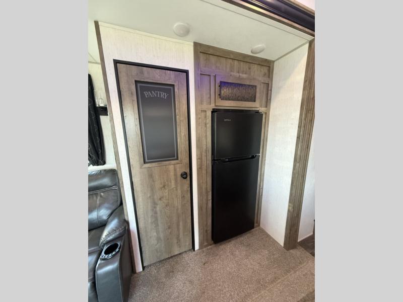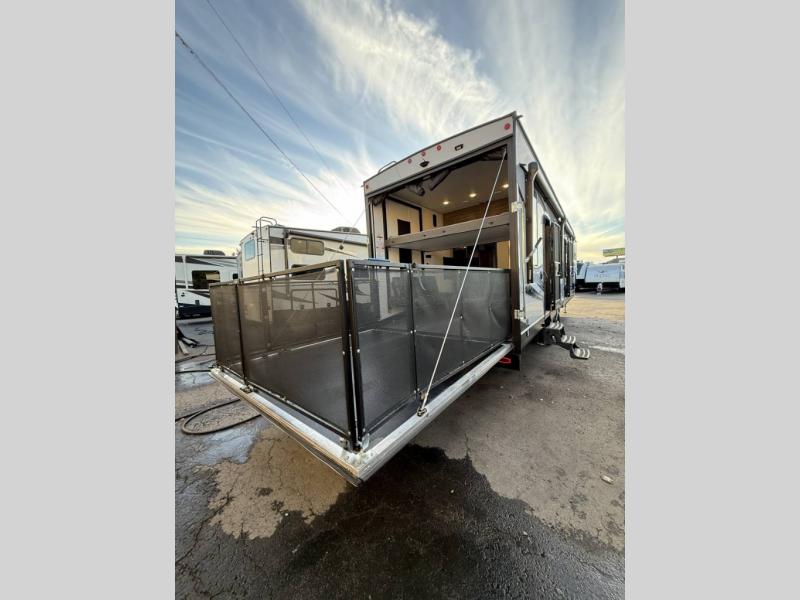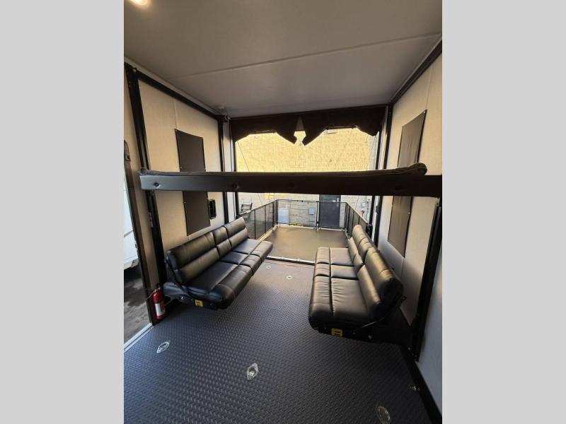 An outside kitchen, a loft, plus dual entry doors make this unit the one! Your guests will love the 13' separate garage that includes a Happijac power bed, plus their own half bath for convenience. The bathroom walls can fold to provide more space when loading toys, and the ramp door can convert to a "party patio" for more fun. Now, that sounds like a fun bunkhouse! Head to the main living area to relax on the party recliner sofa within the large slide, and you can grab a snack from the large pantry. When sleep is calling your name head to front master bedroom for a great night's rest on the Wolf Pack king bed, and you can store your clothes in the slide out wardrobe. This model also includes a pass-through storage with D-rings so you can secure your gear on the way to the campground!