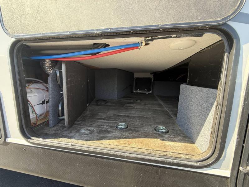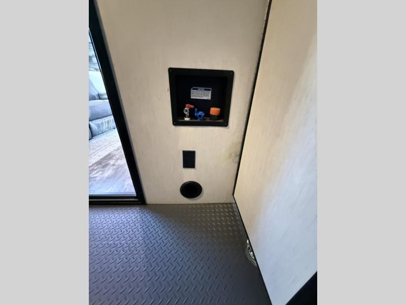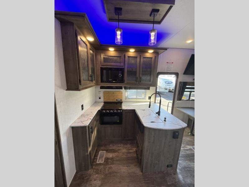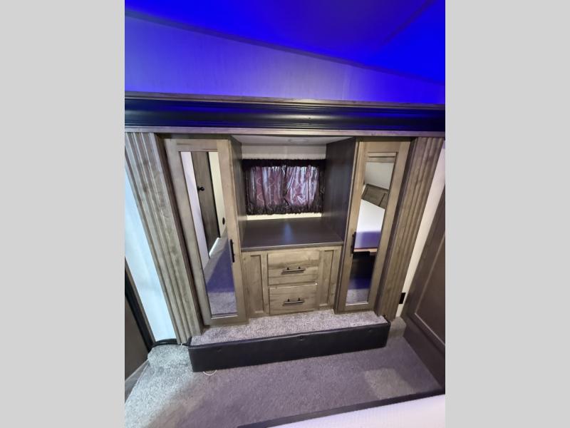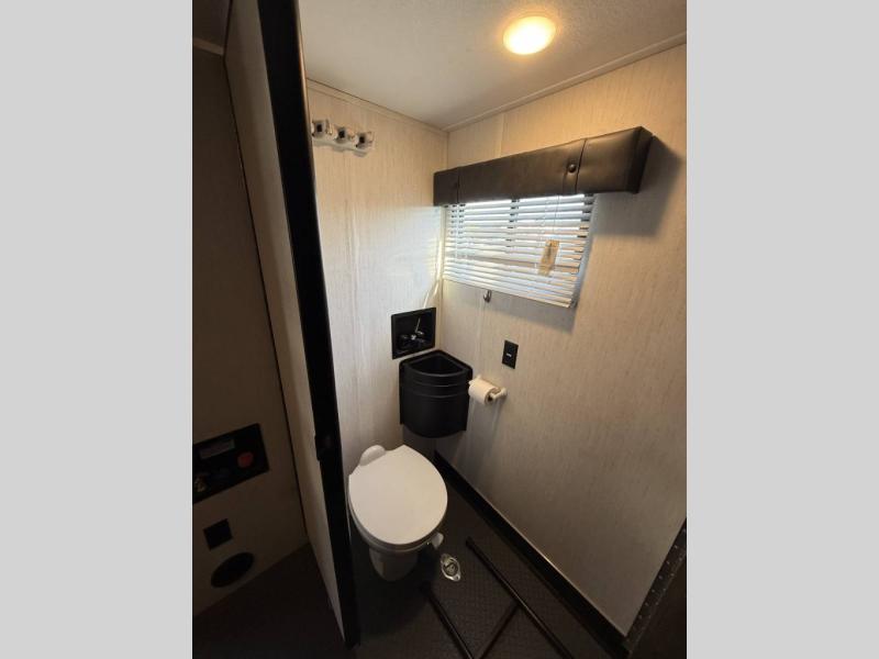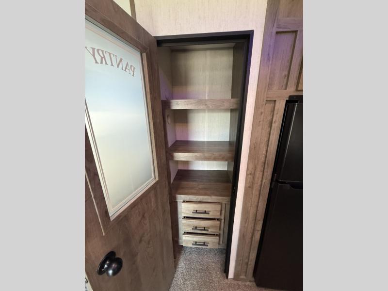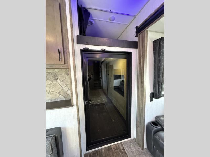 An outside kitchen, a loft, plus dual entry doors make this unit the one! Your guests will love the 13' separate garage that includes a Happijac power bed, plus their own half bath for convenience. The bathroom walls can fold to provide more space when loading toys, and the ramp door can convert to a "party patio" for more fun. Now, that sounds like a fun bunkhouse! Head to the main living area to relax on the party recliner sofa within the large slide, and you can grab a snack from the large pantry. When sleep is calling your name head to front master bedroom for a great night's rest on the Wolf Pack king bed, and you can store your clothes in the slide out wardrobe. This model also includes a pass-through storage with D-rings so you can secure your gear on the way to the campground!