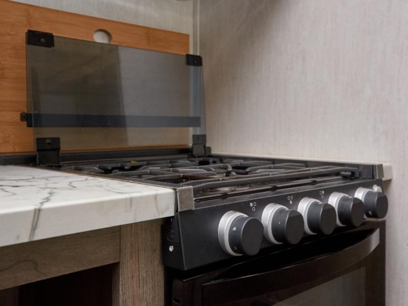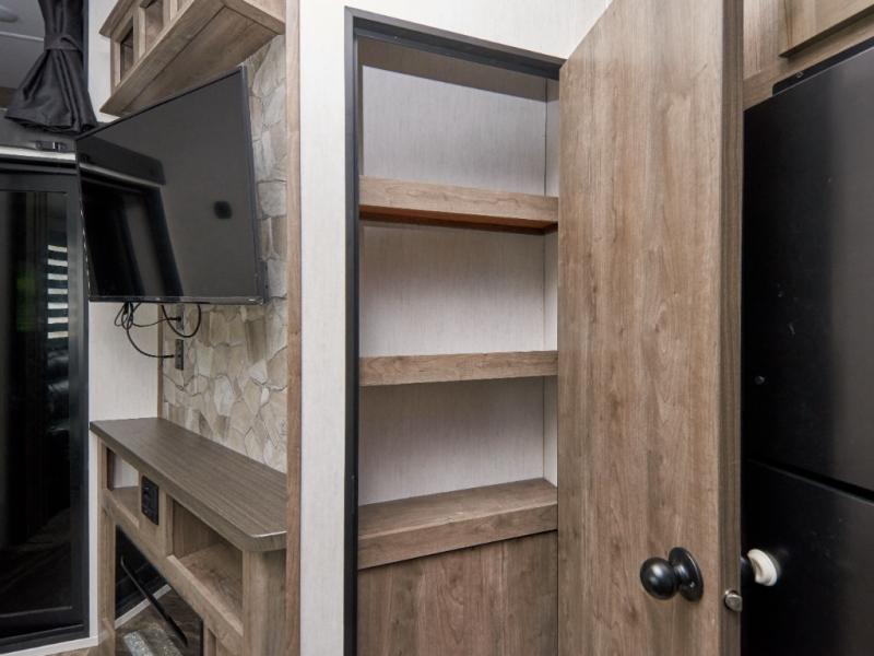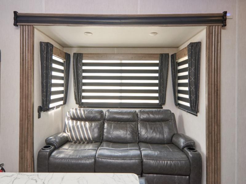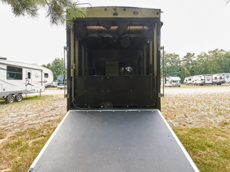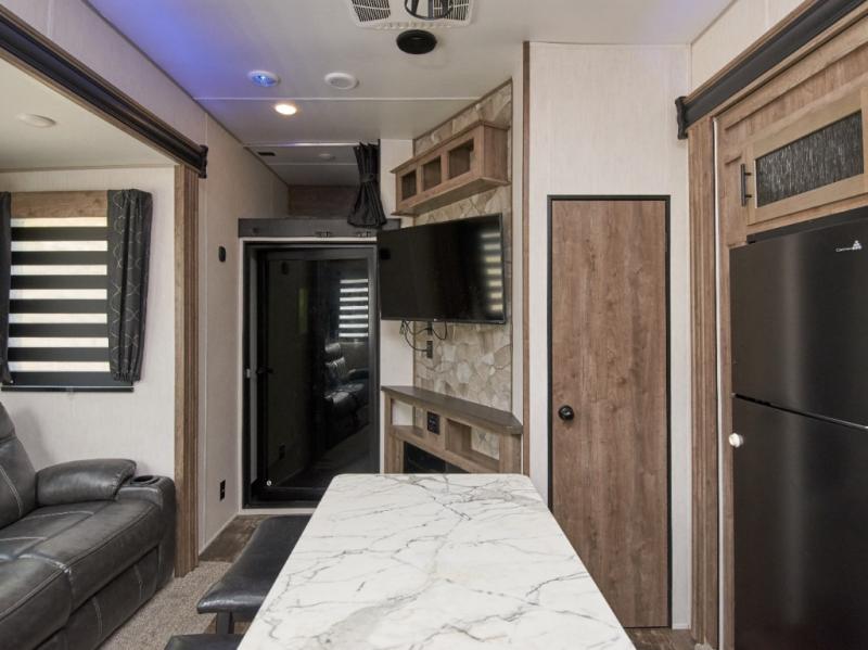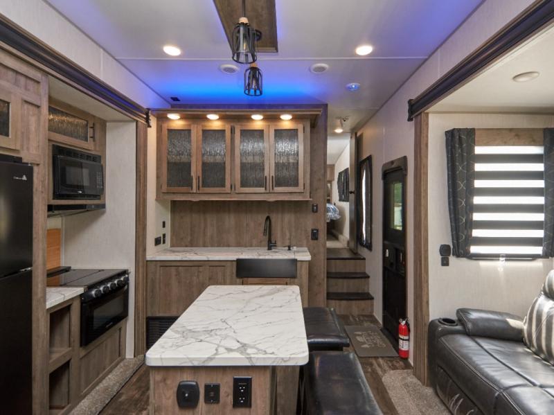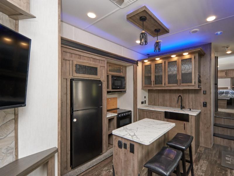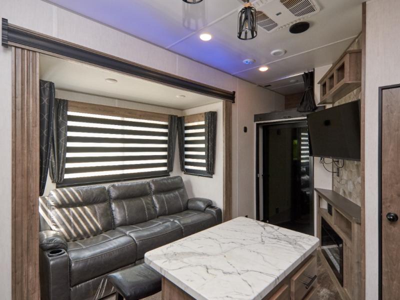 When it’s time to unwind, open the ramp door and transform it into a “party patio”—perfect for hosting friends with a cold drink in hand. Inside, the main living area feels like home with a cozy fireplace, entertainment center, party recliner sofa, and a stylish bar top with stools. The kitchen is fully equipped with a three-burner cooktop, pantry, and generous counter space for easy meal prep.