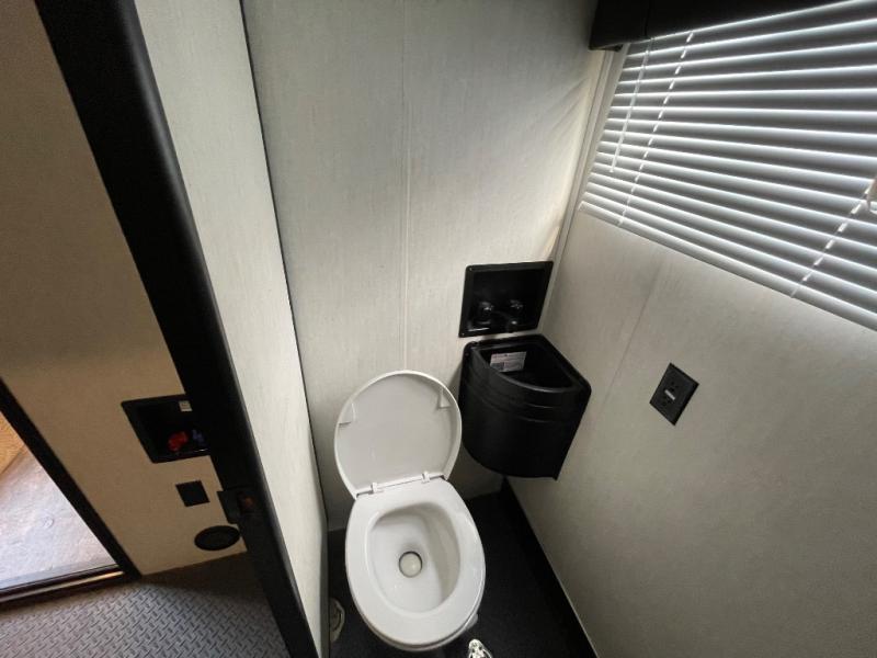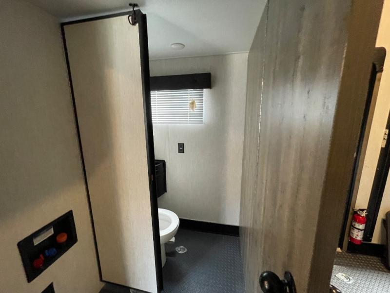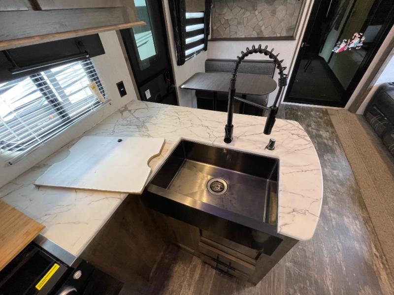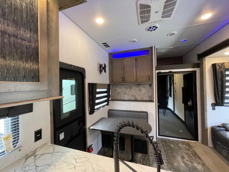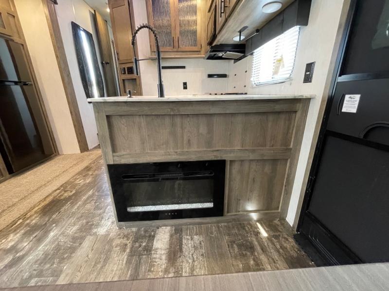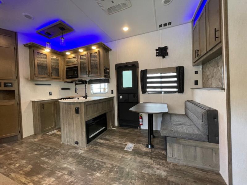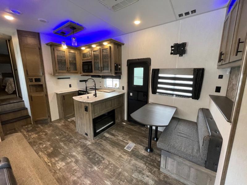 If your outdoors excursions include an ATV, dirt bikes, and plenty of riding gear, you need this spacious toy hauler fifth wheel. The 15' 10" separate garage includes its own half bath with folding walls so you can easily load your toys, plus the loft above provides sleeping space for the kids! The main living area is sure to be a big hangout spot with the party recliner sofa within the large slide, the table with bench seating, and the fireplace. If the weather is nice, you may just spend your whole day outdoors with the outside kitchen, and the two power awnings for maximum shade! After a day of entertaining, you will love retreating to the front master bedroom that includes a Wolf pack king bed, a slide out wardrobe and night stand, and your own door to the dual entry bath!