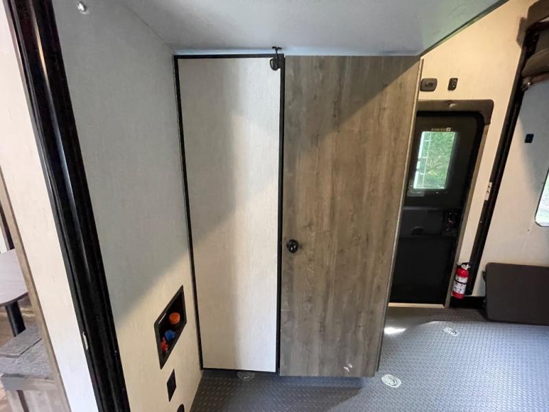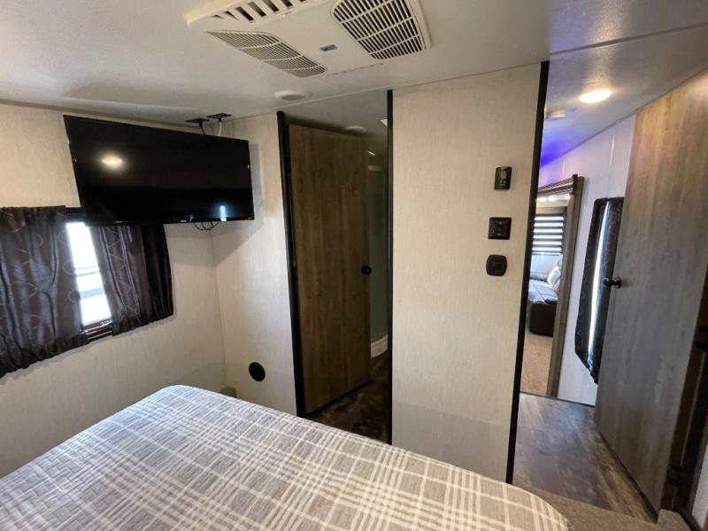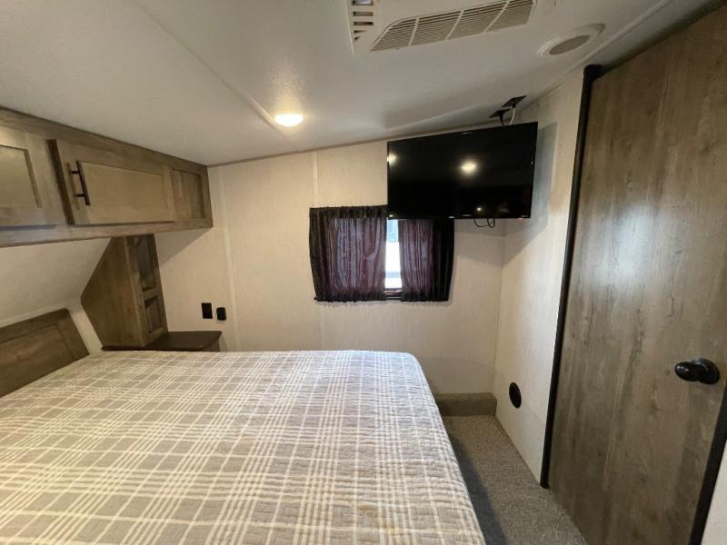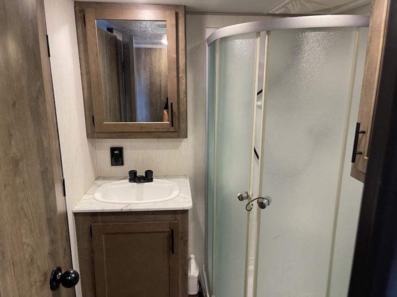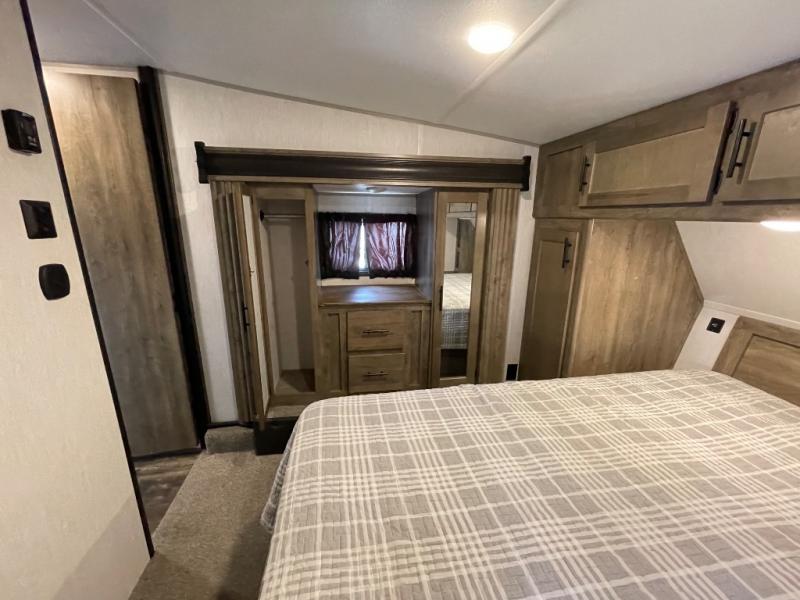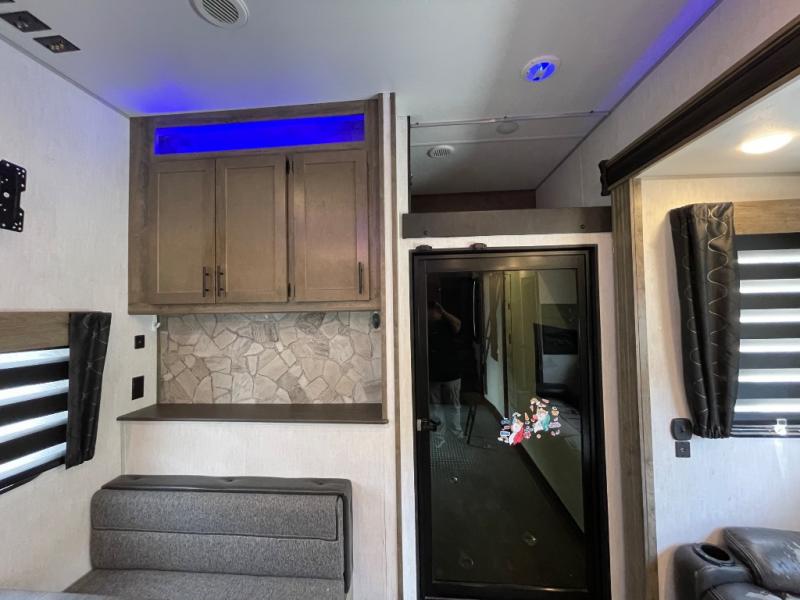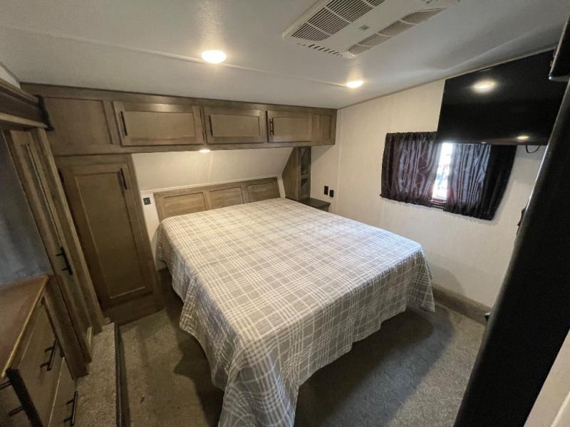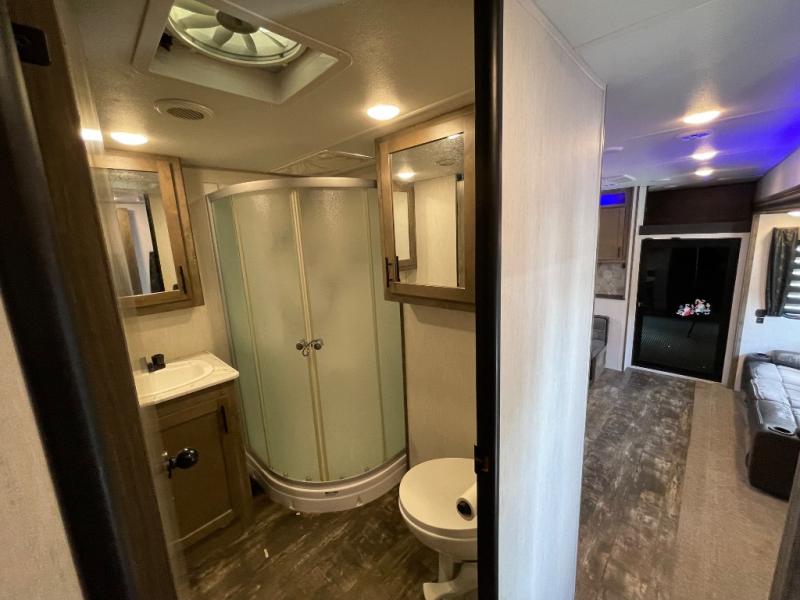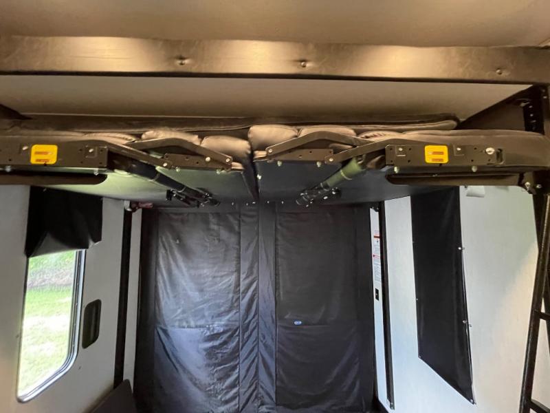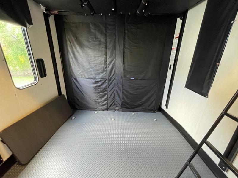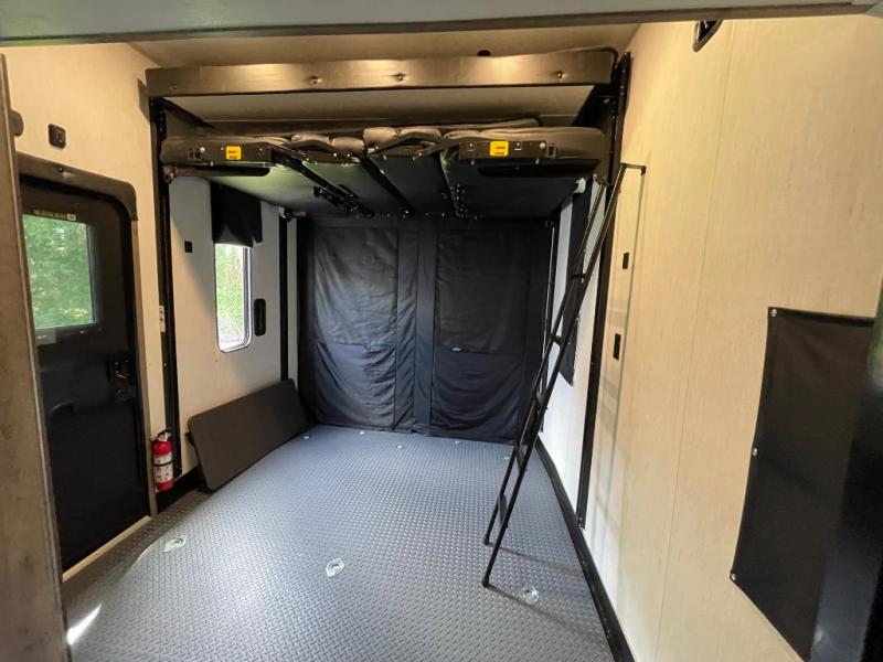 The versatile Cherokee Wolf Pack toy haulers are ready for all your excursions! Each model includes a true high gloss gel coat, a 102" wide body design, and a forced air heated underbelly and enclosed holding tanks so you can camp year around. You will enjoy hassle-free features such as, the in cab tire pressure monitor system, the Happijac bed lift system, and the 100 gallon fresh water capacity. Each model includes a shower skylight, LED interior/exterior lights, Zebra shades in the living area, and a black stainless steel farm sink for that added touch-of-home. The fifth wheels include stabilizer jacks, a second 15K A/C unit in the bedroom, and 50 Amp service. You will appreciate 30 Amp service in the travel trailers, a power tongue jack, and ramp door cables. These toy haulers also include USB charging stations to keep all your gadgets charged and ready to go, premium Teddy Bear bunk mats for comfortability, and a reverse activated light and backup camera for easy loading and unloading!