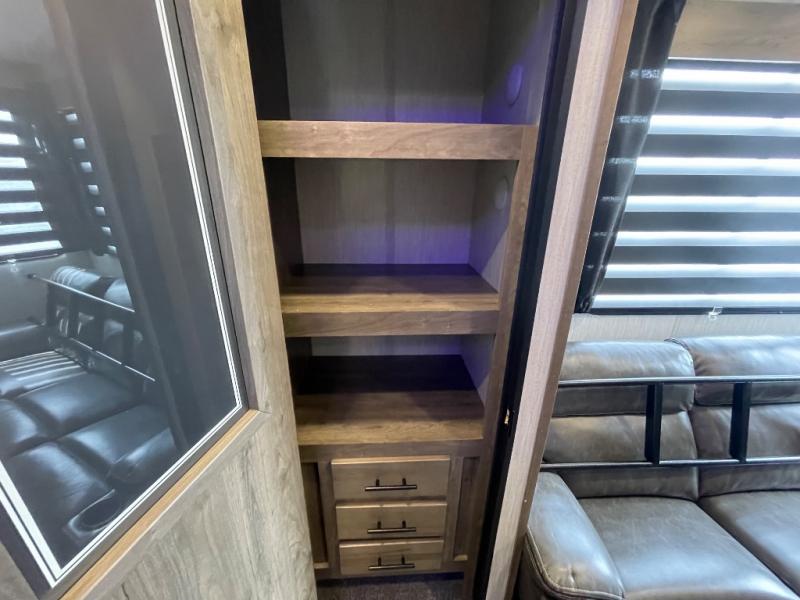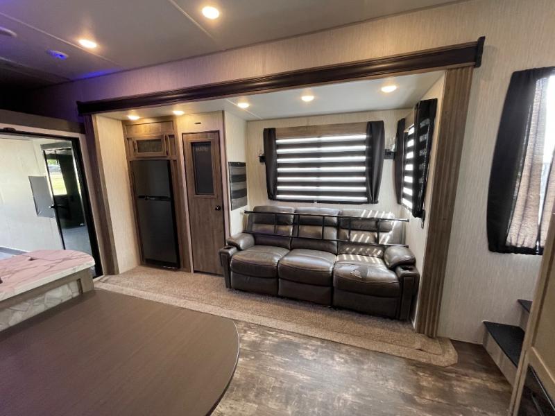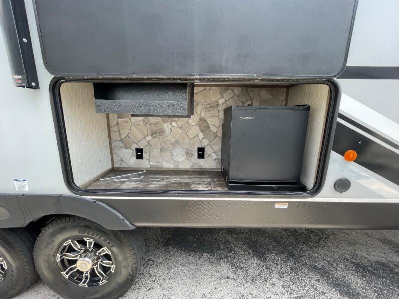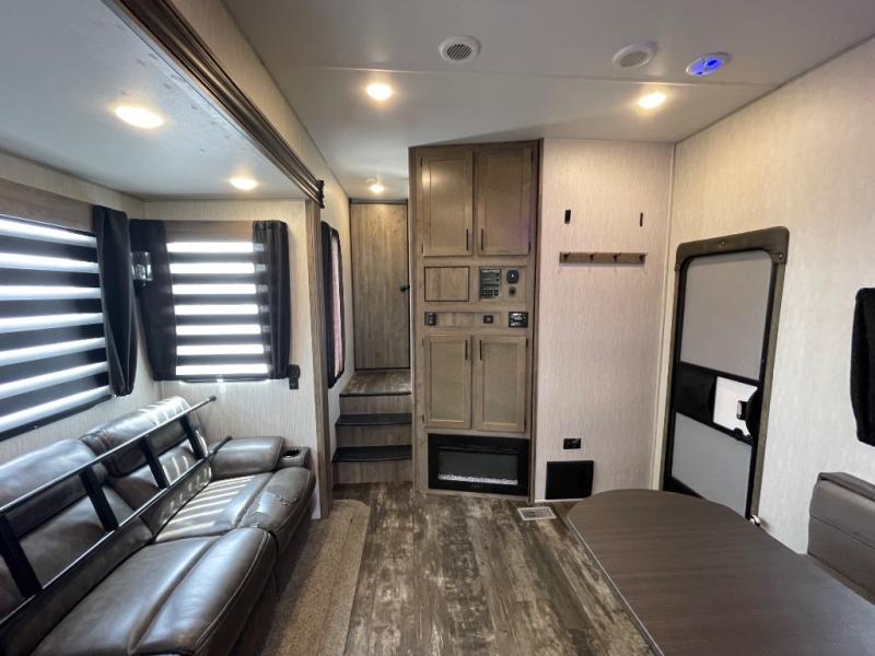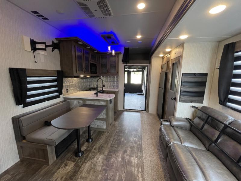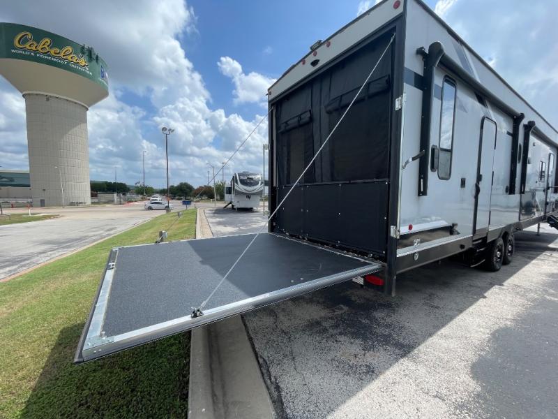 If your outdoors excursions include an ATV, dirt bikes, and plenty of riding gear, you need this spacious toy hauler fifth wheel. The 15' 10" separate garage includes its own half bath with folding walls so you can easily load your toys, plus the loft above provides sleeping space for the kids! The main living area is sure to be a big hangout spot with the party recliner sofa within the large slide, the table with bench seating, and the fireplace. If the weather is nice, you may just spend your whole day outdoors with the outside kitchen, and the two power awnings for maximum shade! After a day of entertaining, you will love retreating to the front master bedroom that includes a Wolf pack king bed, a slide out wardrobe and night stand, and your own door to the dual entry bath!