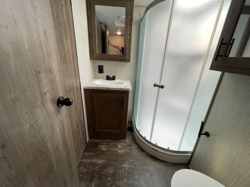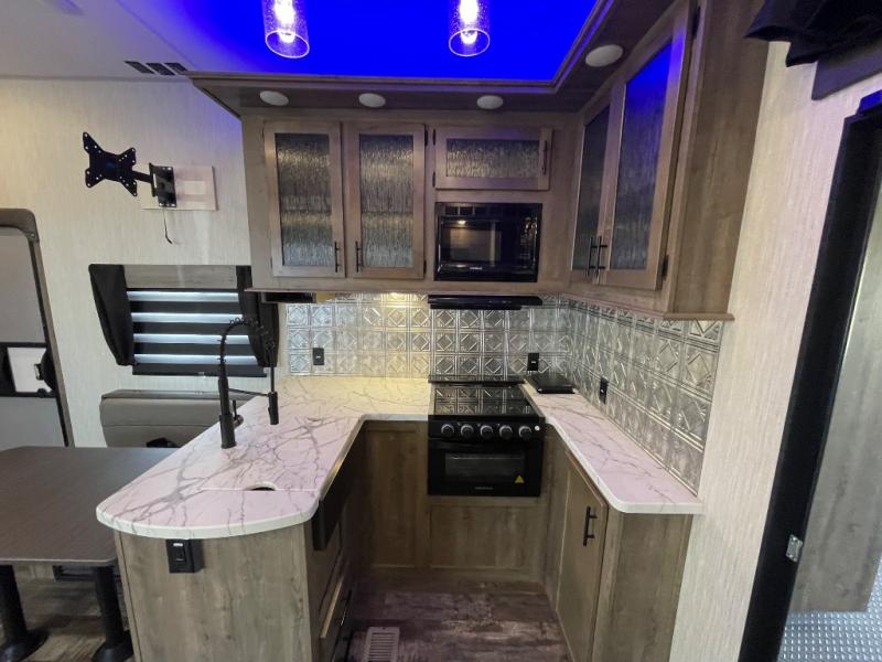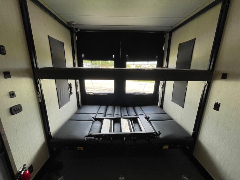 The versatile Cherokee Wolf Pack toy haulers are ready for all your excursions! Each model includes a true high gloss gel coat, a 102" wide body design, and a forced air heated underbelly and enclosed holding tanks so you can camp year around. You will enjoy hassle-free features such as, the in cab tire pressure monitor system, the Happijac bed lift system, and the 100 gallon fresh water capacity. Each model includes a shower skylight, LED interior/exterior lights, Zebra shades in the living area, and a black stainless steel farm sink for that added touch-of-home. The fifth wheels include stabilizer jacks, a second 15K A/C unit in the bedroom, and 50 Amp service. You will appreciate 30 Amp service in the travel trailers, a power tongue jack, and ramp door cables. These toy haulers also include USB charging stations to keep all your gadgets charged and ready to go, premium Teddy Bear bunk mats for comfortability, and a reverse activated light and backup camera for easy loading and unloading!