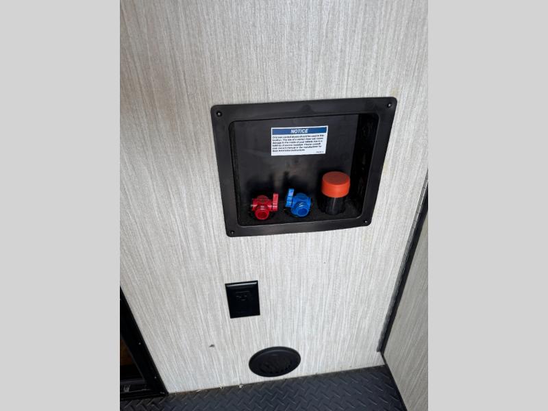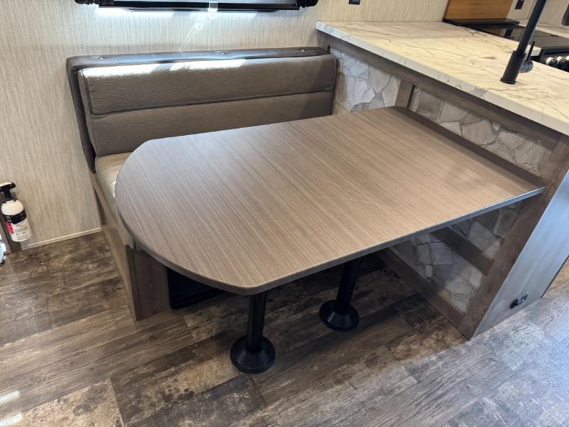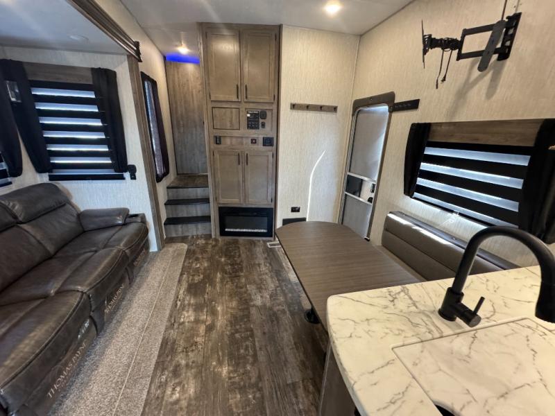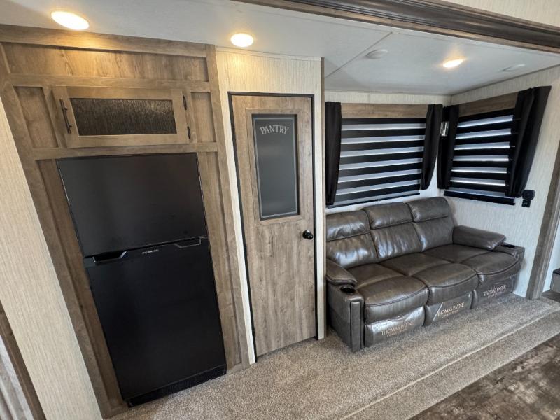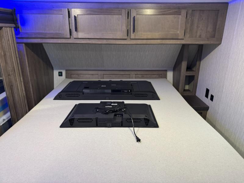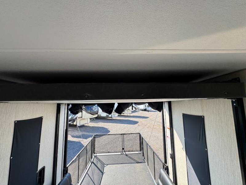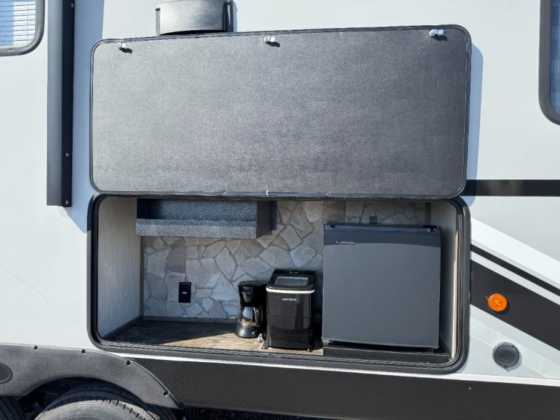 If your outdoors excursions include an ATV, dirt bikes, and plenty of riding gear, you need this spacious toy hauler fifth wheel. The 15' 10" separate garage includes its own half bath with folding walls so you can easily load your toys, plus the loft above provides sleeping space for the kids! The main living area is sure to be a big hangout spot with the party recliner sofa within the large slide, the table with bench seating, and the fireplace. If the weather is nice, you may just spend your whole day outdoors with the outside kitchen, and the two power awnings for maximum shade! After a day of entertaining, you will love retreating to the front master bedroom that includes a Wolf pack king bed, a slide out wardrobe and night stand, and your own door to the dual entry bath!