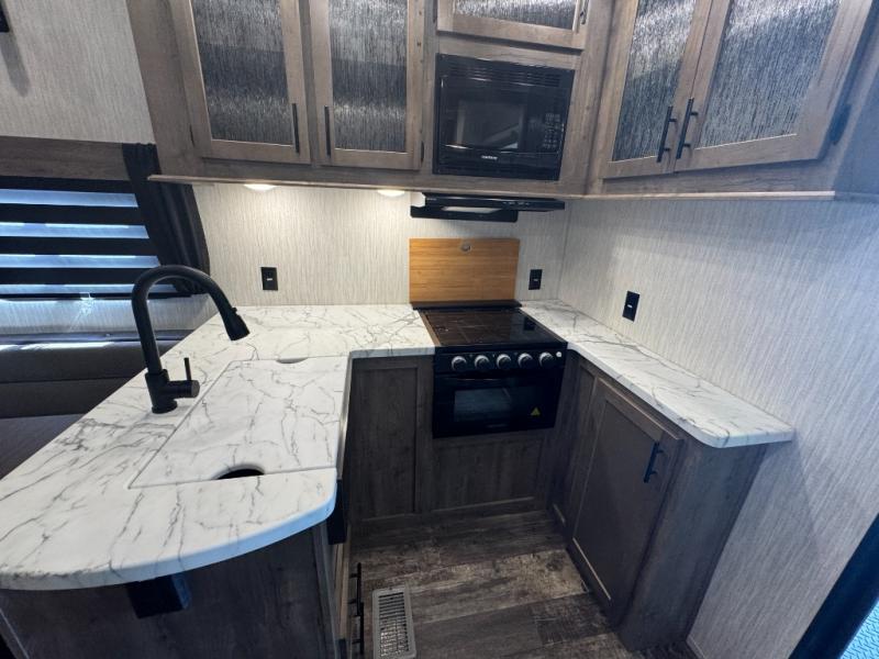The versatile Cherokee Wolf Pack toy haulers are ready for all your excursions! Each model includes a true high gloss gel coat, a 102" wide body design, and a forced air heated underbelly and enclosed holding tanks so you can camp year around. You will enjoy hassle-free features such as, the in cab tire pressure monitor system, the Happijac bed lift system, and the 100 gallon fresh water capacity. Each model includes a shower skylight, LED interior/exterior lights, Zebra shades in the living area, and a black stainless steel farm sink for that added touch-of-home. The fifth wheels include stabilizer jacks, a second 15K A/C unit in the bedroom, and 50 Amp service. You will appreciate 30 Amp service in the travel trailers, a power tongue jack, and ramp door cables. These toy haulers also include USB charging stations to keep all your gadgets charged and ready to go, premium Teddy Bear bunk mats for comfortability, and a reverse activated light and backup camera for easy loading and unloading!