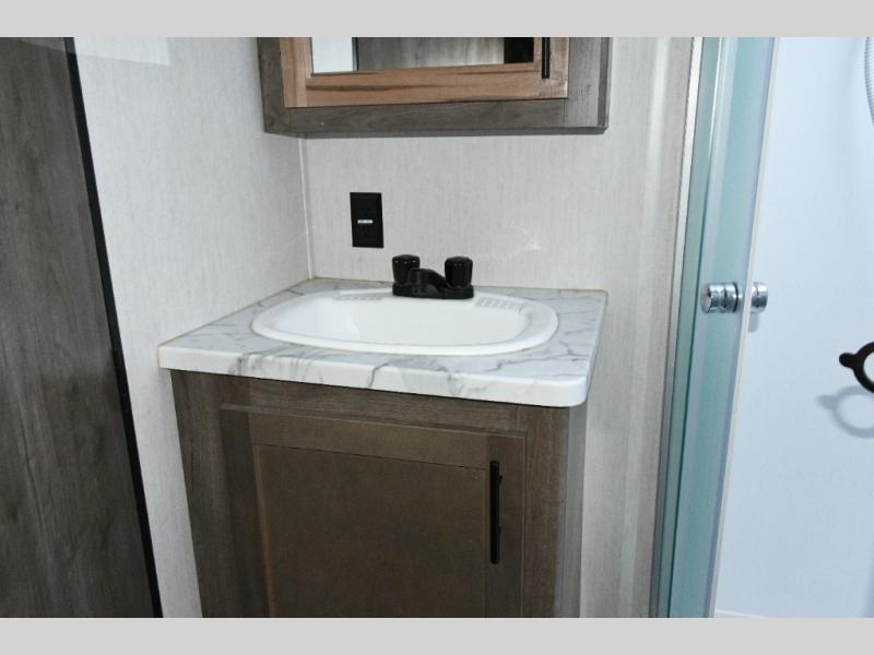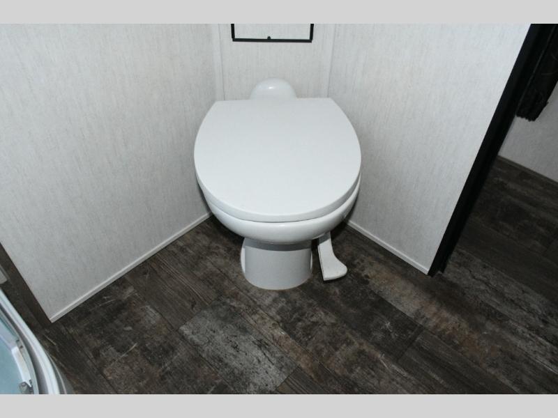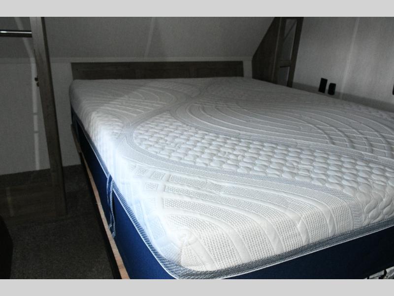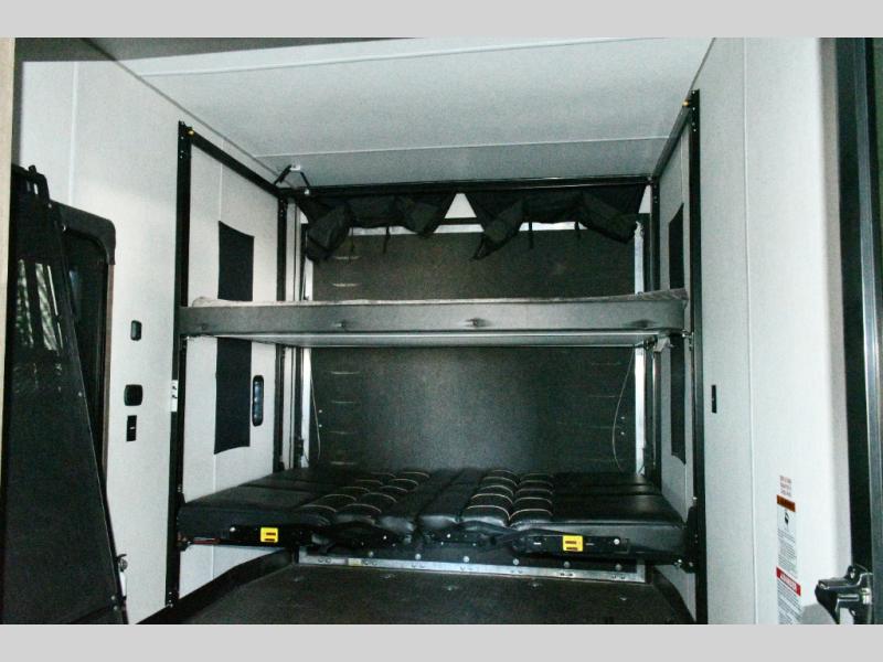 The massive 15' 10" garage handles ATVs, dirt bikes, kayaks, or anything else you bring along. Folding walls make loading easy, and the built-in half bath keeps the crew from tracking mud through the main living space. A loft above the garage gives the kids their own hideout, and the power bed system means you can transform the garage from cargo bay to bunk room in minutes.