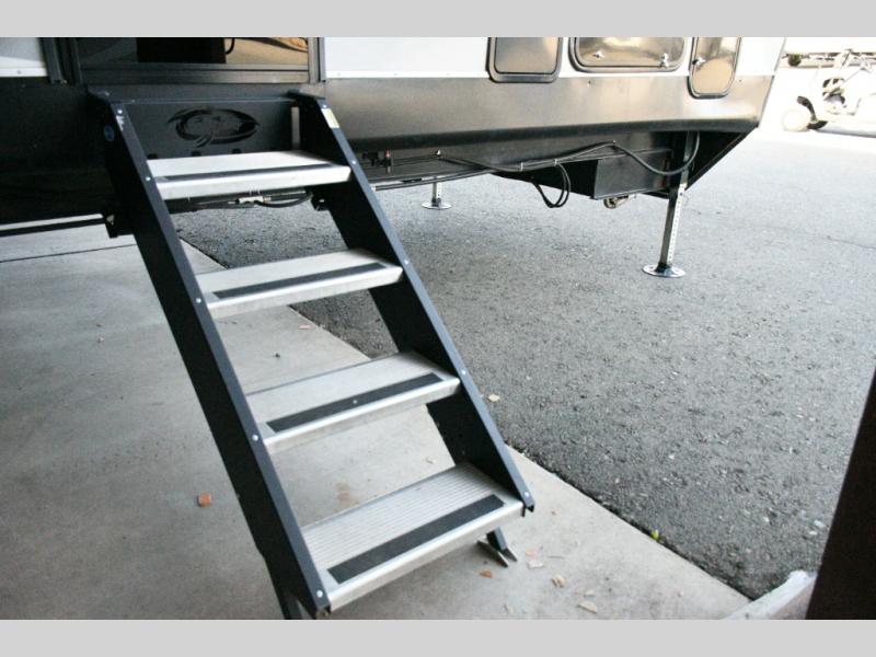 Inside, the main living area is designed for gathering after a full day of adventure. Relax on the party recliner sofa in the wide slide-out while the fireplace sets the mood. The dinette with bench seating gives you room for meals, game nights, or planning tomorrow’s ride. When the weather is perfect, the outdoor kitchen and dual power awnings make it easy to spend the whole day outside. Plus, the rear ramp converts into an elevated "Party Patio"—your private deck with a view.