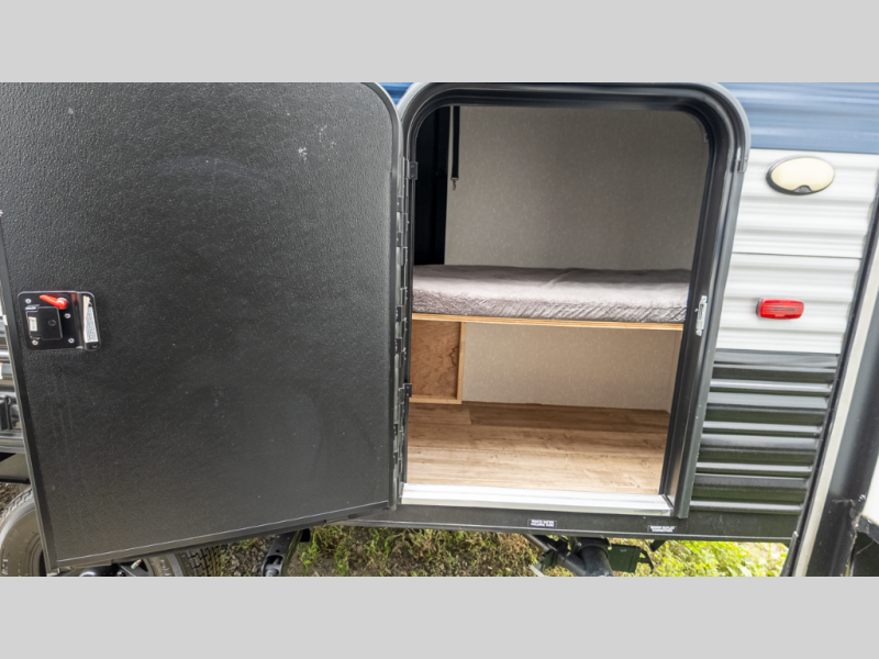What I liked most: You can see a lot of thought has gone into this small end camper. The bunks and bed have been placed with space efficiency. The storage throughout actually has some nice depth.