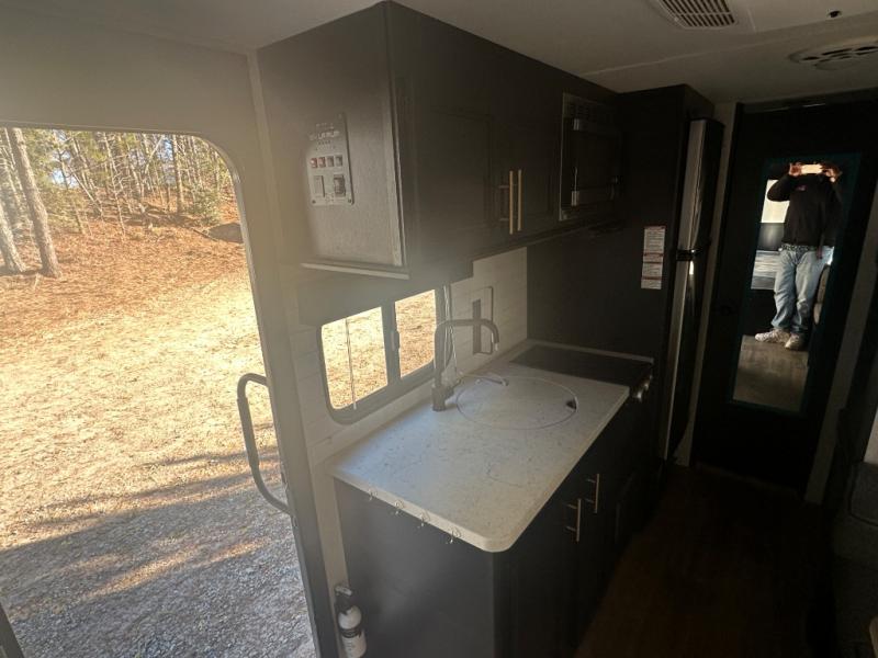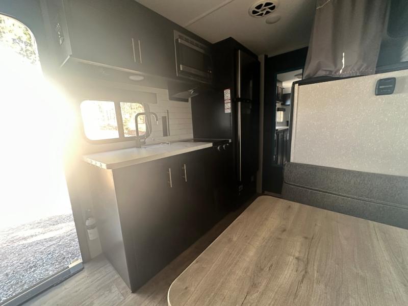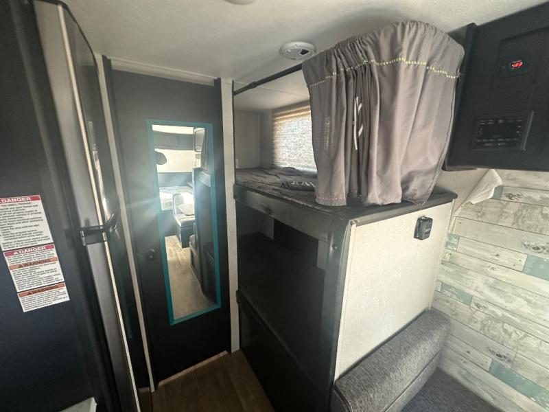Imagine your kids on the rear bunk beds in this Cherokee Wolf Pup travel trailer while you enjoy the front queen bed before everyone gets up to make breakfast and head out for a hike. The kitchen includes a high-output cooktop and microwave, as well as a refrigerator to store your leftovers and a sink to wash the dishes. You will find storage in the overhead cabinets, and there is a shelf by the queen bed. Your hiking gear can also be stowed out in the outside storage.