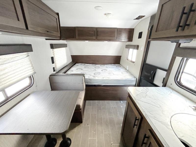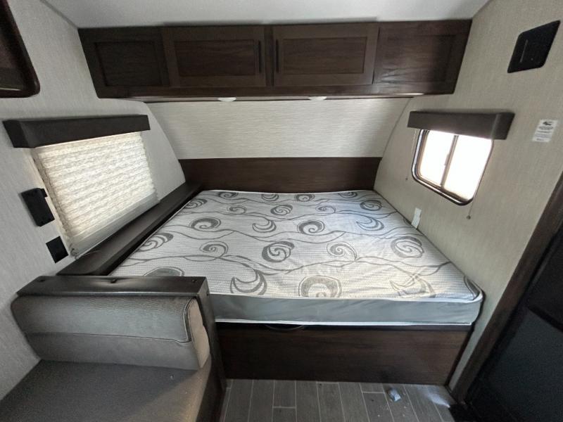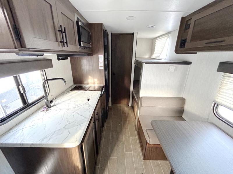 Imagine your kids on the rear bunk beds in this Cherokee Wolf Pup travel trailer while you enjoy the front queen bed before everyone gets up to make breakfast and head out for a hike. The kitchen includes a high-output cooktop and microwave, as well as a refrigerator to store your leftovers and a sink to wash the dishes. You will find storage in the overhead cabinets, and there is a shelf by the queen bed. Your hiking gear can also be stowed out in the outside storage.