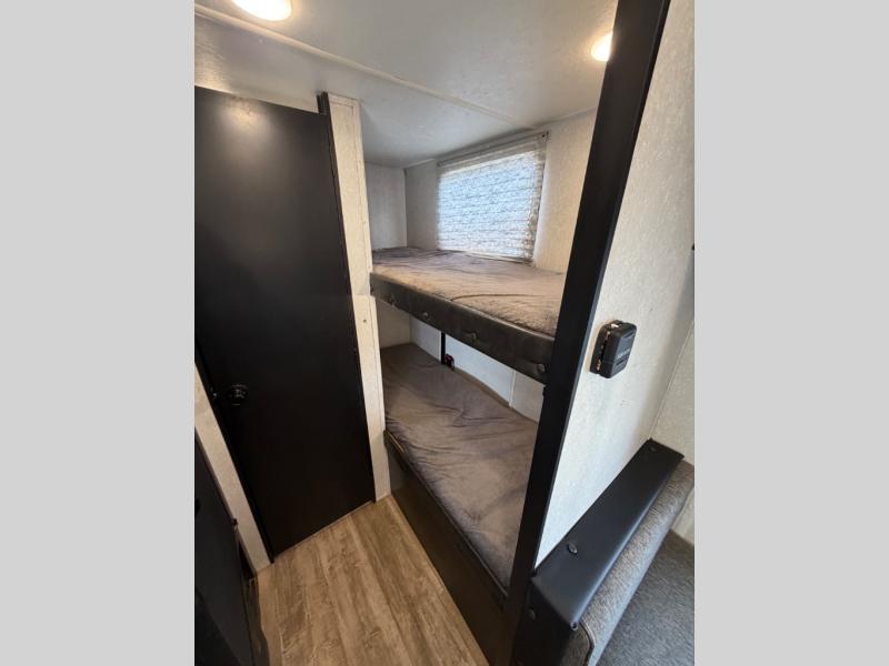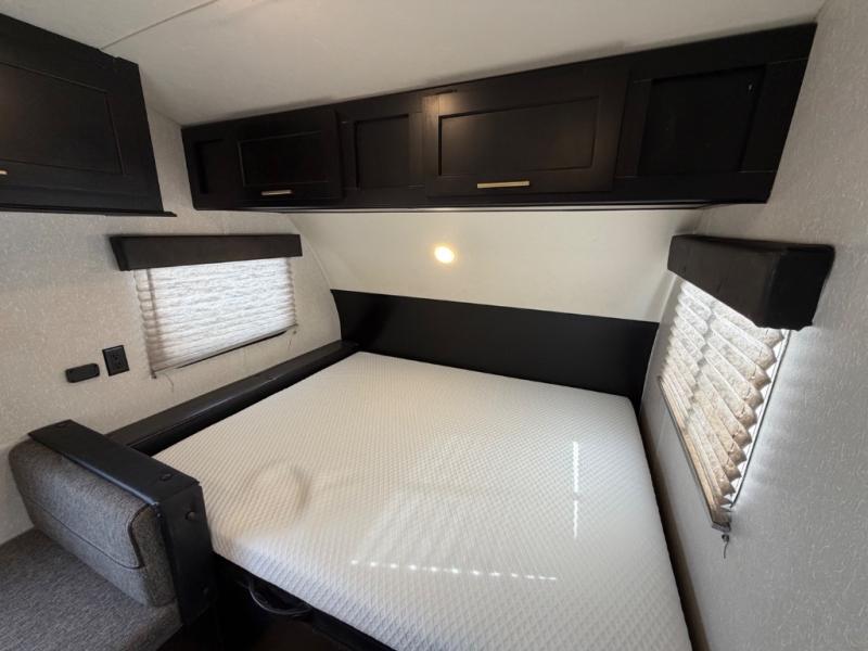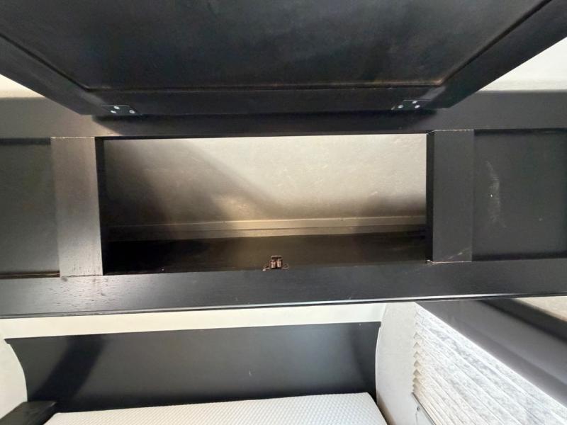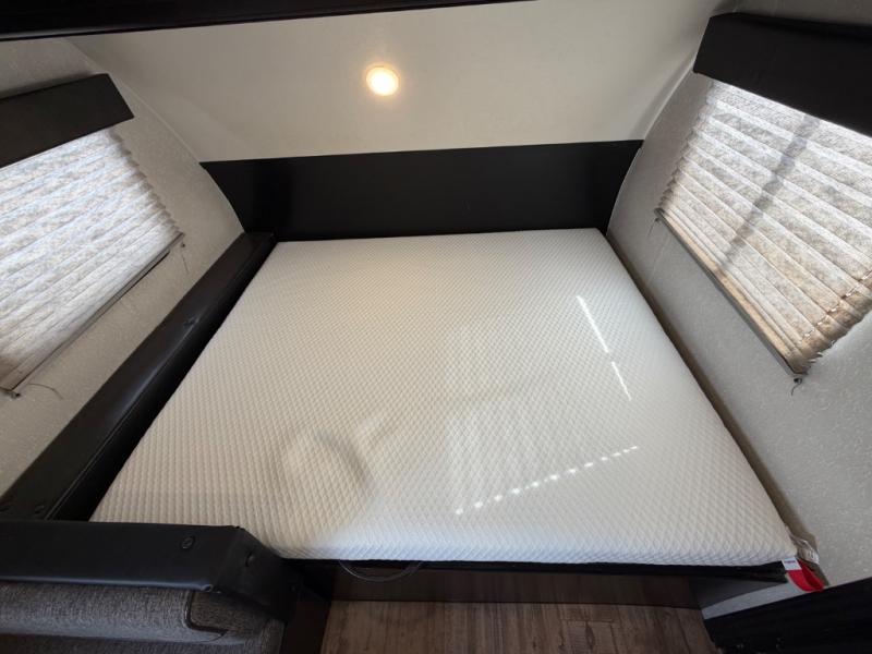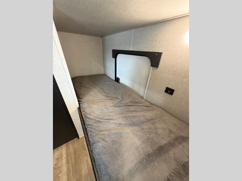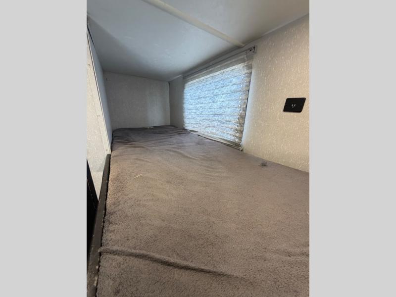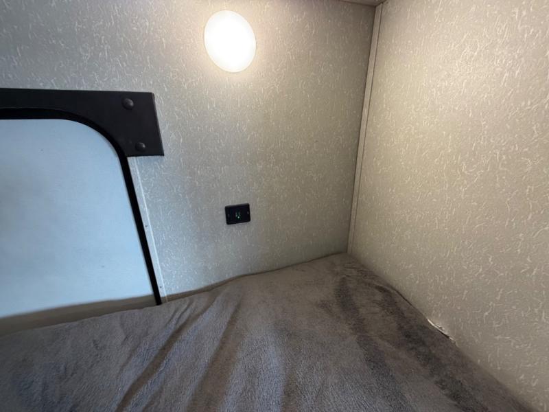 What I liked most: You can see a lot of thought has gone into this small end camper. The bunks and bed have been placed with space efficiency. The storage throughout actually has some nice depth.