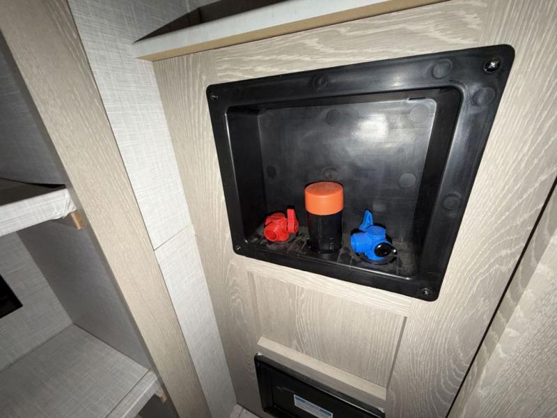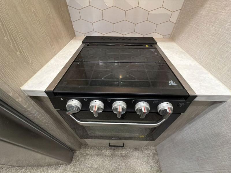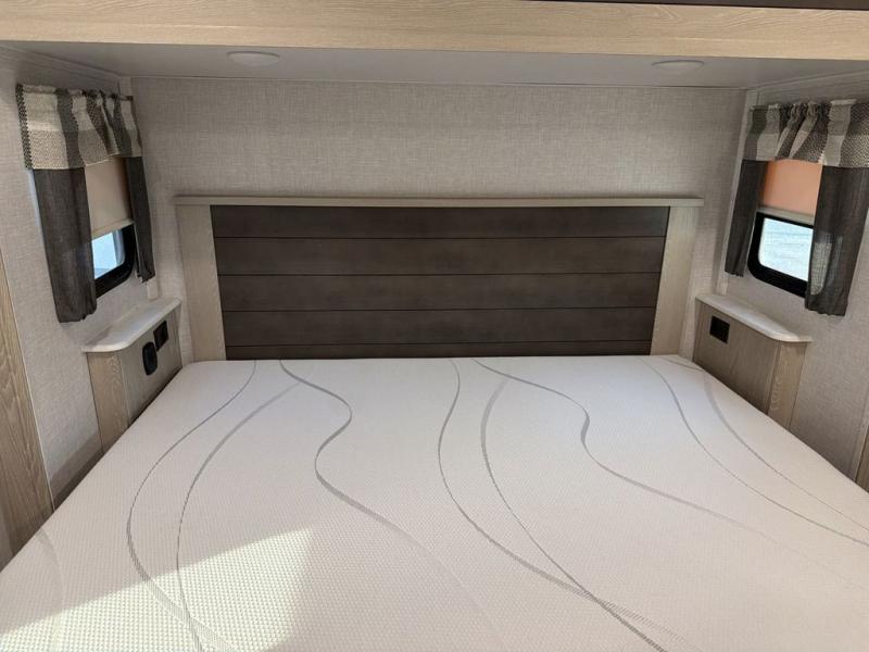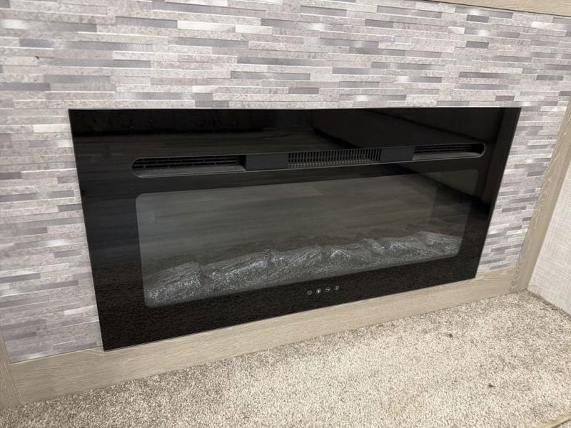 Whether you are traveling full-time or over a few weekends in a year, you and your spouse will enjoy the spacious kitchen and living area with a residential refrigerator and center island, a large rear window, dual opposing slides, and plenty of seating to enjoy the views. You will even have the convenience of cooking on the outside kitchen with a 4 cu. ft. refrigerator to store more beverages. And the large corner walk-in pantry beside the curio offers lots of snack and dry good storage. The 44" x 81" king U-shaped dinette is a great place to enjoy your delicious meals, play some card games, and provides extra sleeping space just like the rear 76" hide-a-bed sofa. What better way to wind down your nights than to relax at the 60" theater seating across from the fireplace while you watch your favorite movie on the LED TV!