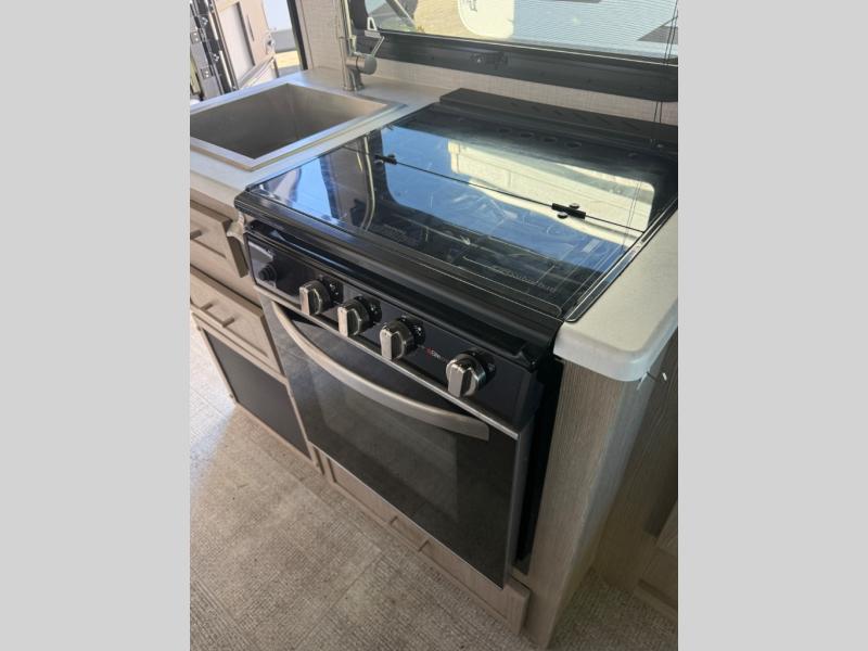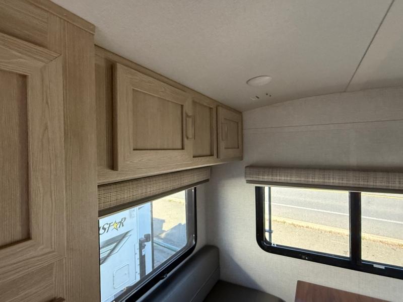 Cook up your favorite camp meal on the three-burner cooktop, in the microwave, or on the outdoor griddle with this Flagstaff E-Pro travel trailer. You can eat at the 52" x 82" booth dinette or under the 13' power awning which provides protection for an outdoor living area. The dinette also doubles as extra sleeping space for two and includes overhead storage for your things. You can stay clean having a full bathroom, watch a movie on the 12V TV with DVD player, and even grab a snack from the 12V refrigerator.